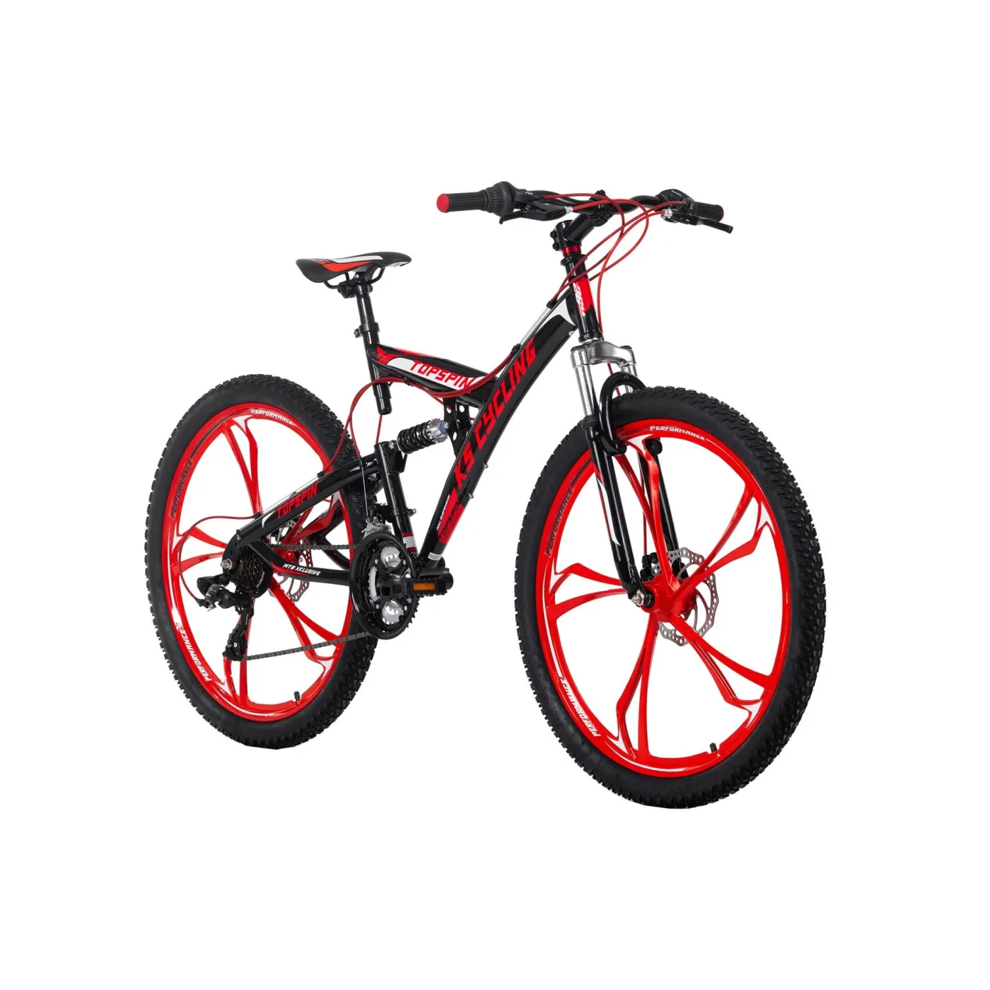 Niesamowity oraz przyciągający wzrok Topspin od KS Cycling pozwoli Ci się zanurzyć w przygodę kolarstwa górskiego! Ten 26-calowy rower górski z pełnym zawieszeniem wyposażono w 21-biegową przerzutkę, którą wygodnie i intuicyjnie obsługuje się za pomocą manetek obrotowych Shimano. Dzięki ramie z pełnym zawieszeniem zawsze masz kontrolę, nawet na wyboistych drogach. Hamulce tarczowe zapewniają bezpieczne wyhamowanie w każdej sytuacji.