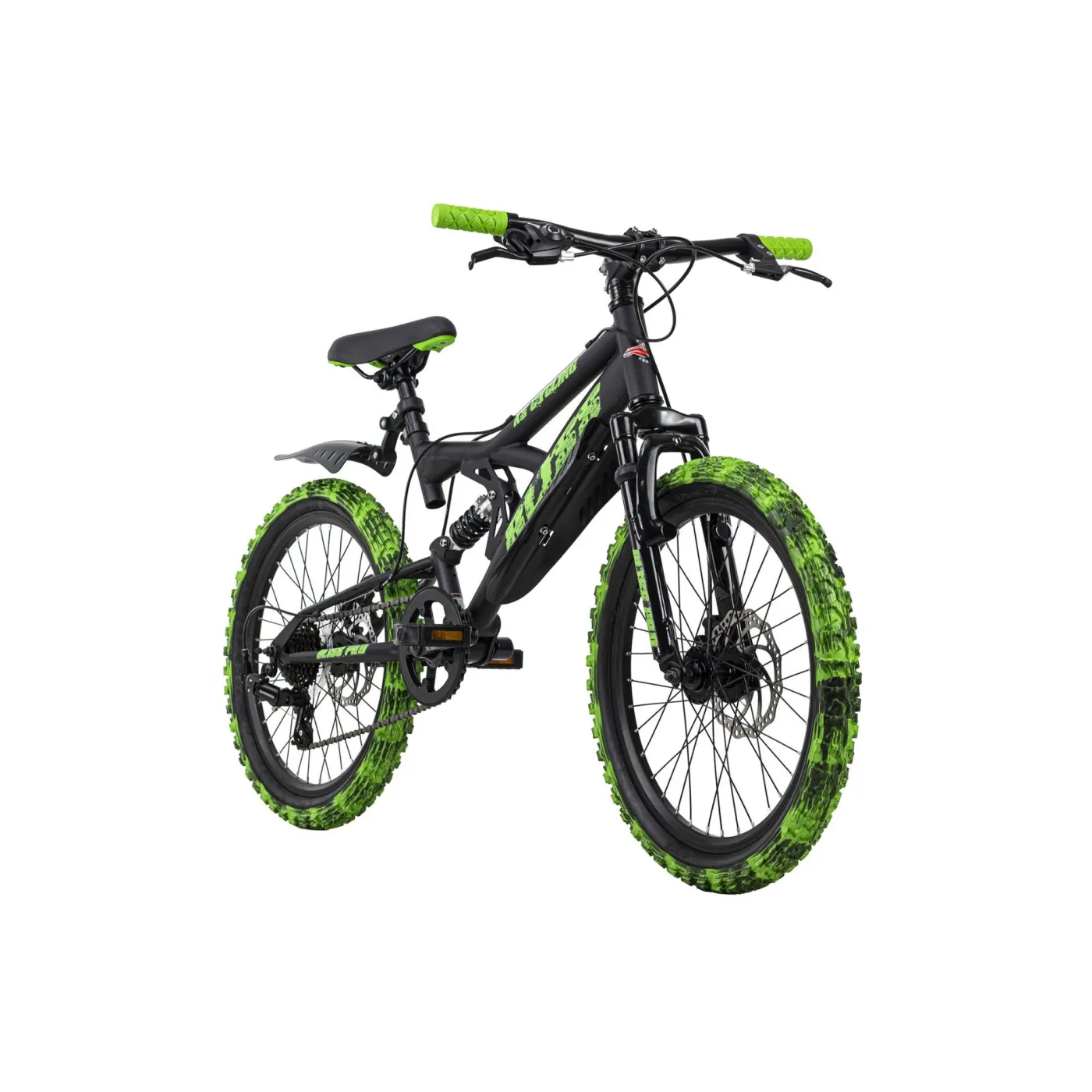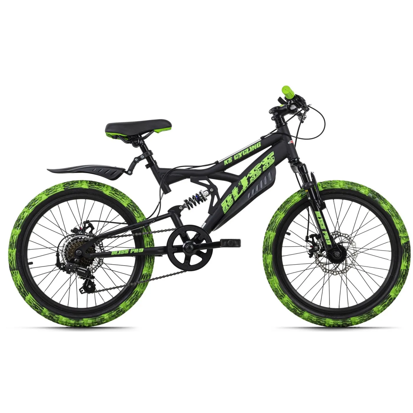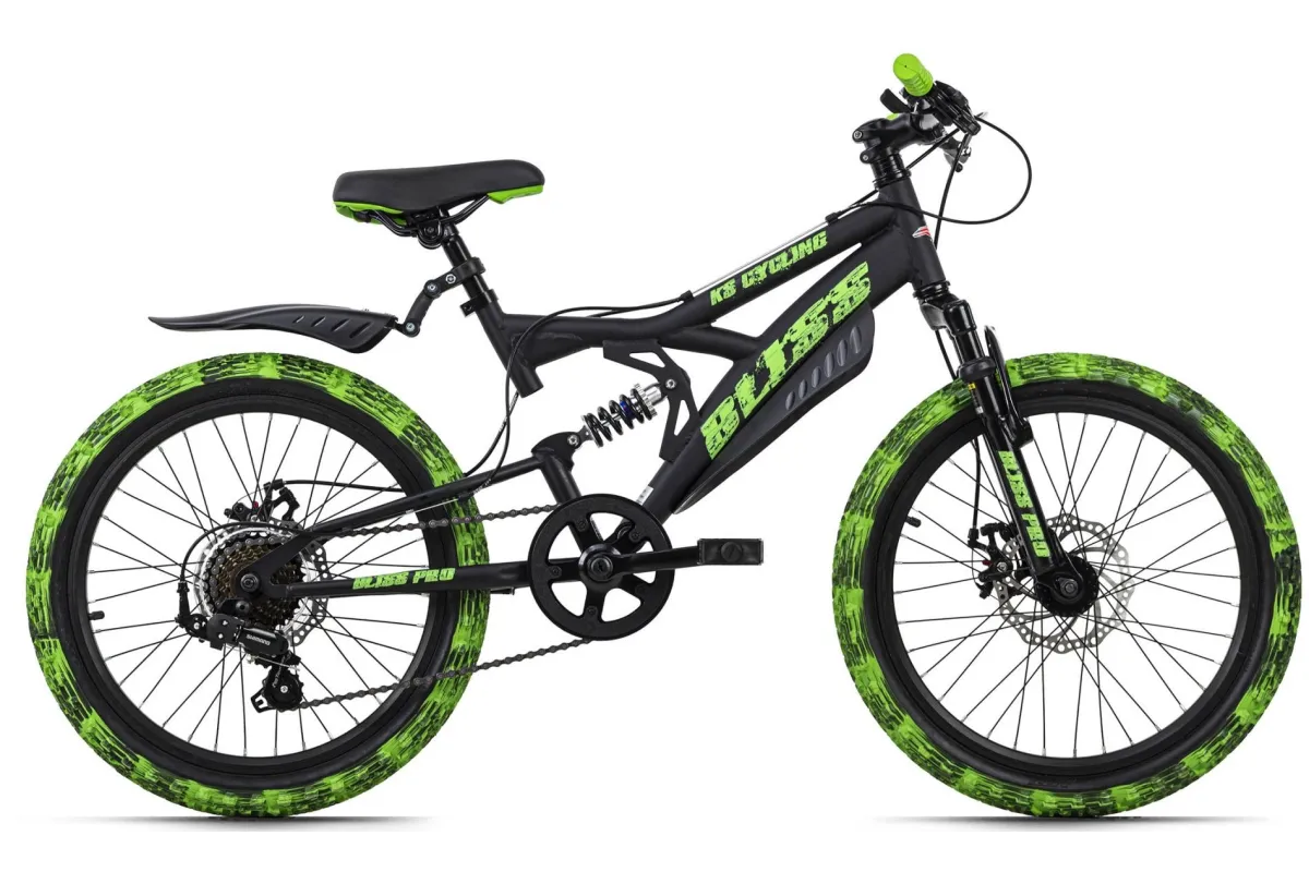 20-calowy rower dziecięcy Bliss Pro firmy KS Cycling to solidny rower górski z pełnym zawieszeniem dla najmłodszych, który w niczym nie ustępuje wersjom dla dorosłych. Malowanie opon jest wyjątkowe i zostało nałożone ręcznie na każdą z nich - nie ma drugiej takiej samej opony! Projekt w kolorze zielonym i czarnym z efektami „zniszczenia” sprawia, że rower dziecięcy przyciąga wzrok. Hamulce tarczowe zapewniają bezpieczeństwo, a 7 biegów pozwala na precyzyjne dopasowanie stylu jazdy do panujących na trasie warunków.