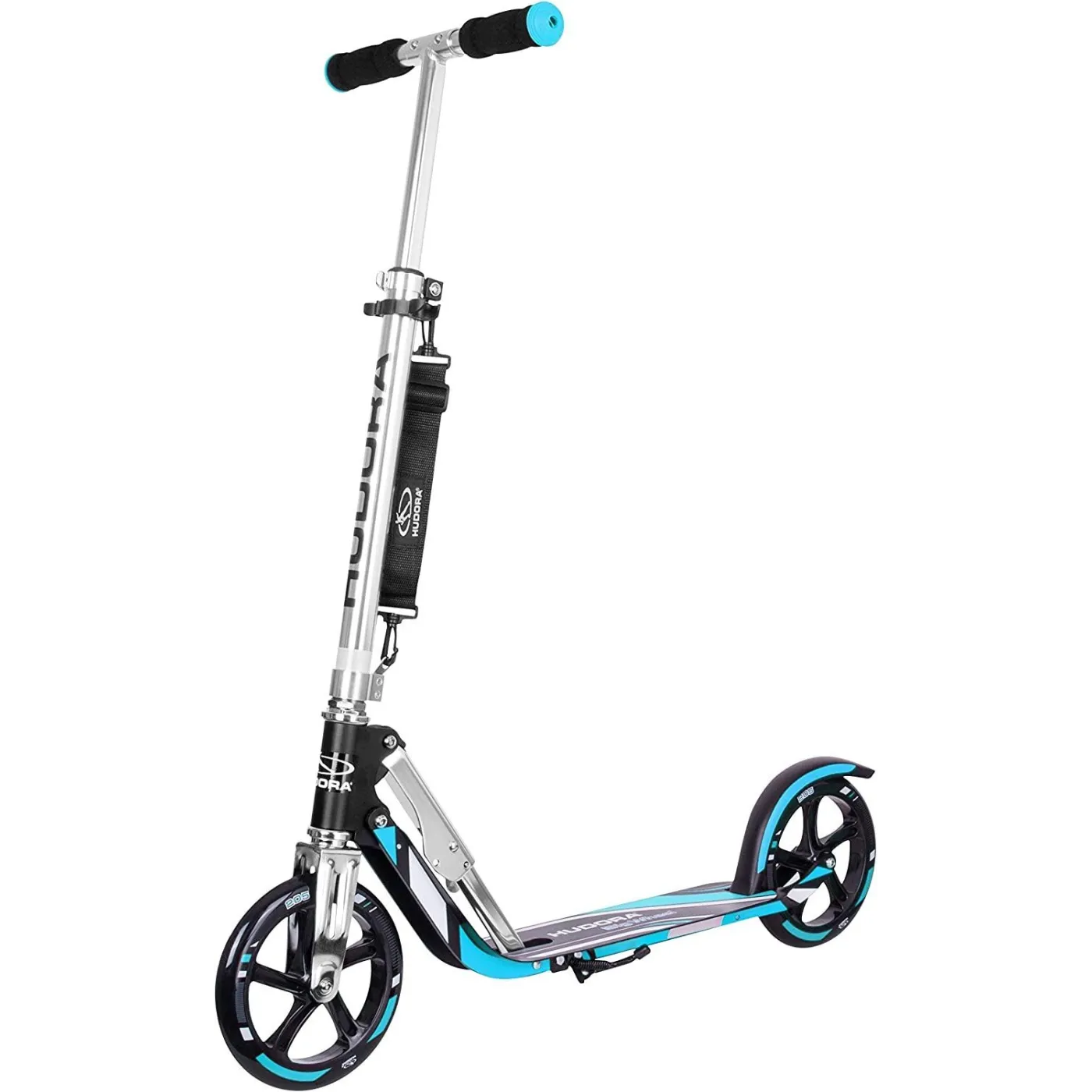 Hulajnoga miejska HUDORA świetnie sprawdza się w szczególności u młodzieży i dorosłych. Duże koła z chromowanymi łożyskami ABEC 5 umożliwiają osiąganie sporych prędkości przy małym wysiłku. Ponadto, regulowana wysokość kierownicy umożliwia dokładne dopasowanie hulajnogi do wzrostu użytkownika. System składania i praktyczny opasek zapewniają łatwy transport hulajnogi w dowolne miejsce, a zamontowana nóżka jej parkowanie. Błotniki, zamontowane zarówno nad przednim jak i tylnym kołem, umożliwiają jazdę przy każdej pogodzie. Dodatkowo, błotnik nad tylnym kółkiem służy również jako hamulec.