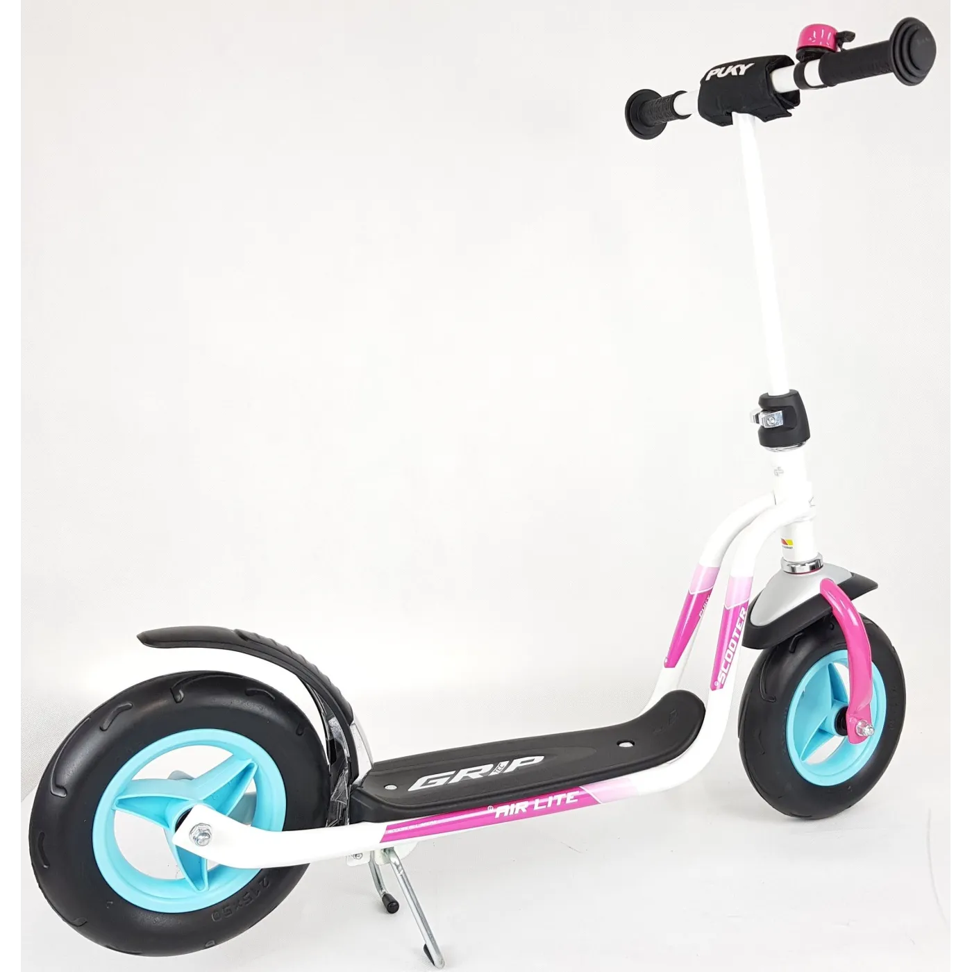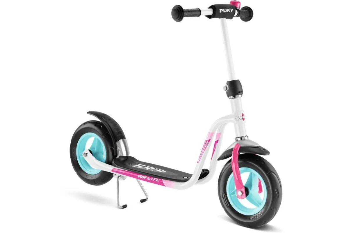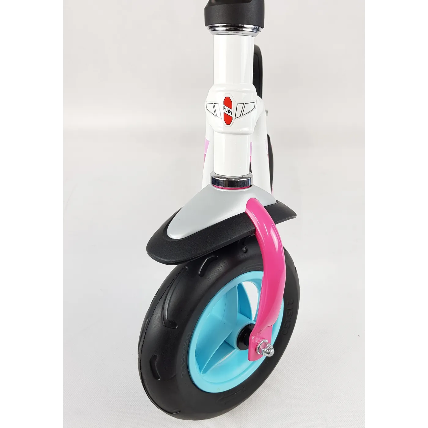 PUKY R 03 to niewielka dwukołowa hulajnoga z piankowymi oponami, która oferuje wszystko, co tradycyjna hulajnoga dla dzieci od 3 lat. Miękkie, komfortowe opony w rozmiarze 8,4 cala z łatwością pokonują mniejsze przeszkody, zapewniają przyczepność i są bardzo ciche. R 03 dodatkowo wyposażona jest w dzwonek, składaną podpórkę i hamulec typu "kick" w tylnym kole. Hamulec jest zintegrowany z tylnym błotnikiem i może być obsługiwany zarówno lewą, jak i prawą stopą. Łożyska kulkowe w kierownicy i kołach zapewniają łatwą obsługę, dobre właściwości jezdne i dużą trwałość - antypoślizgowy podest zapewnia bezpieczne odpychanie się.