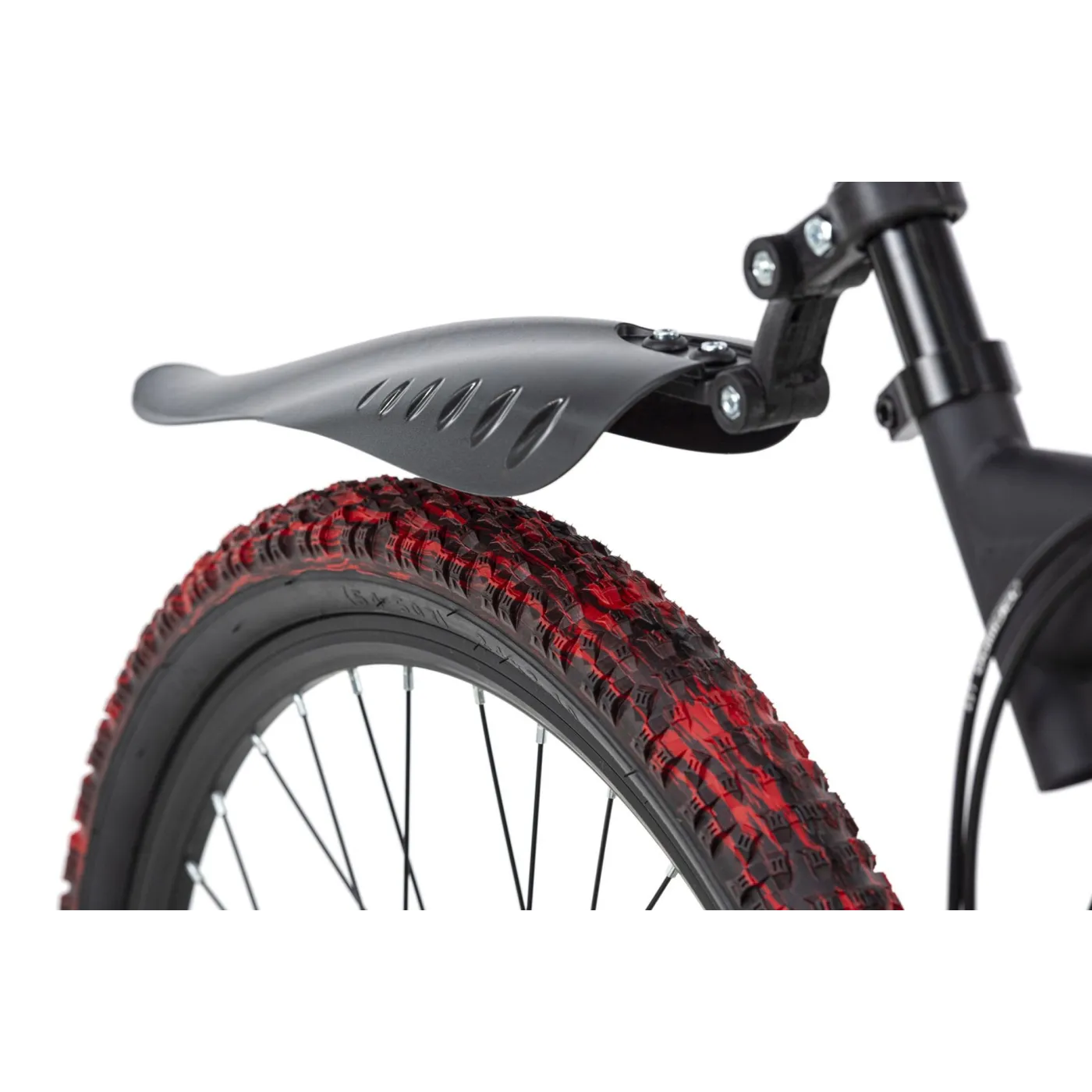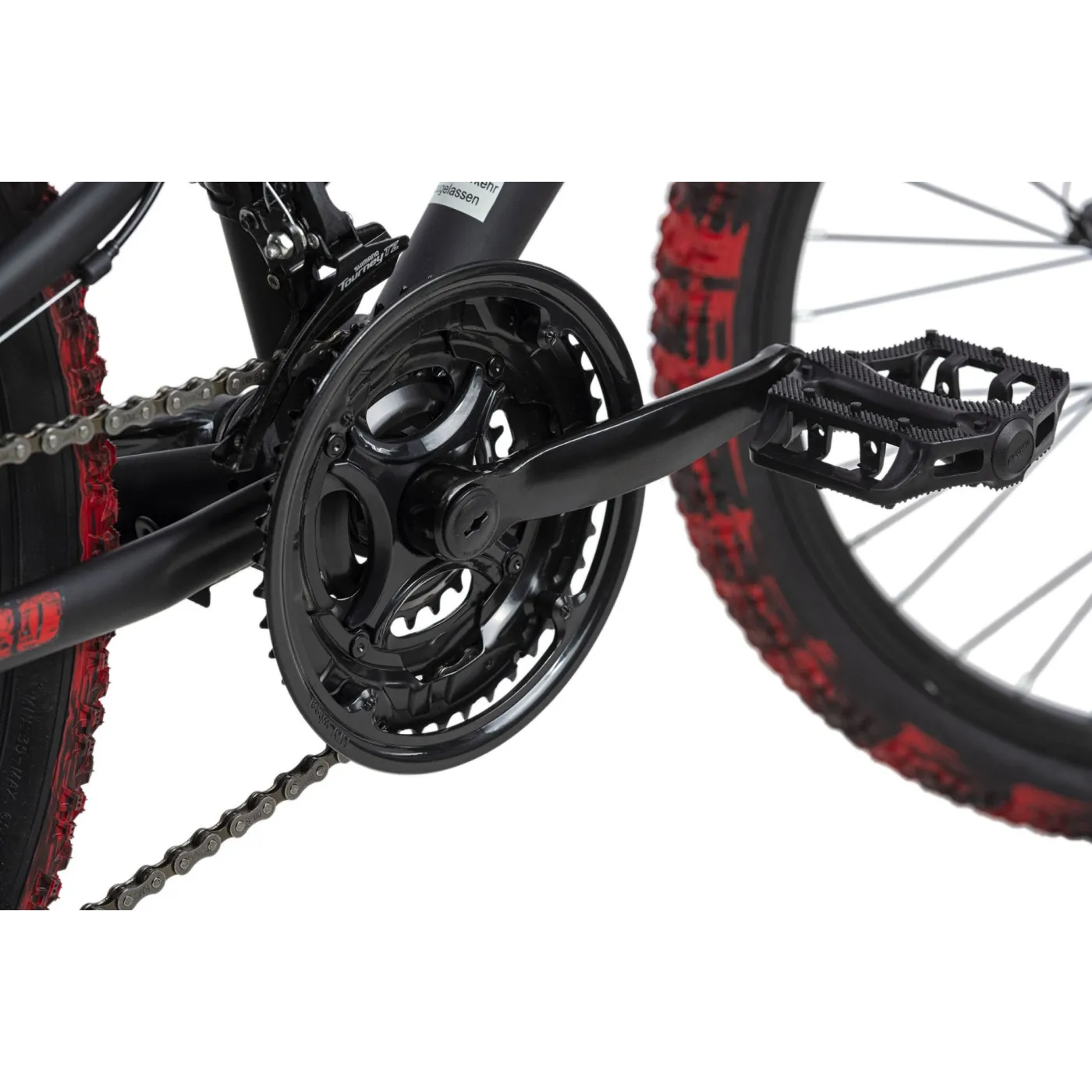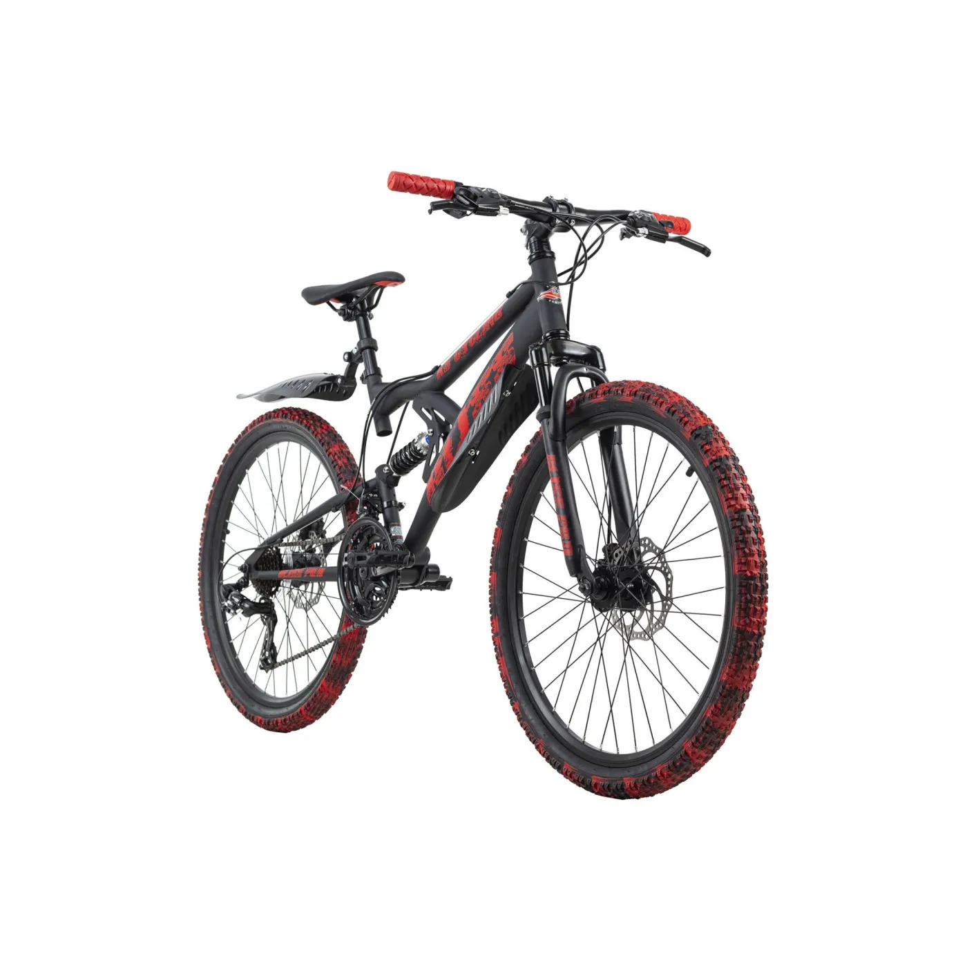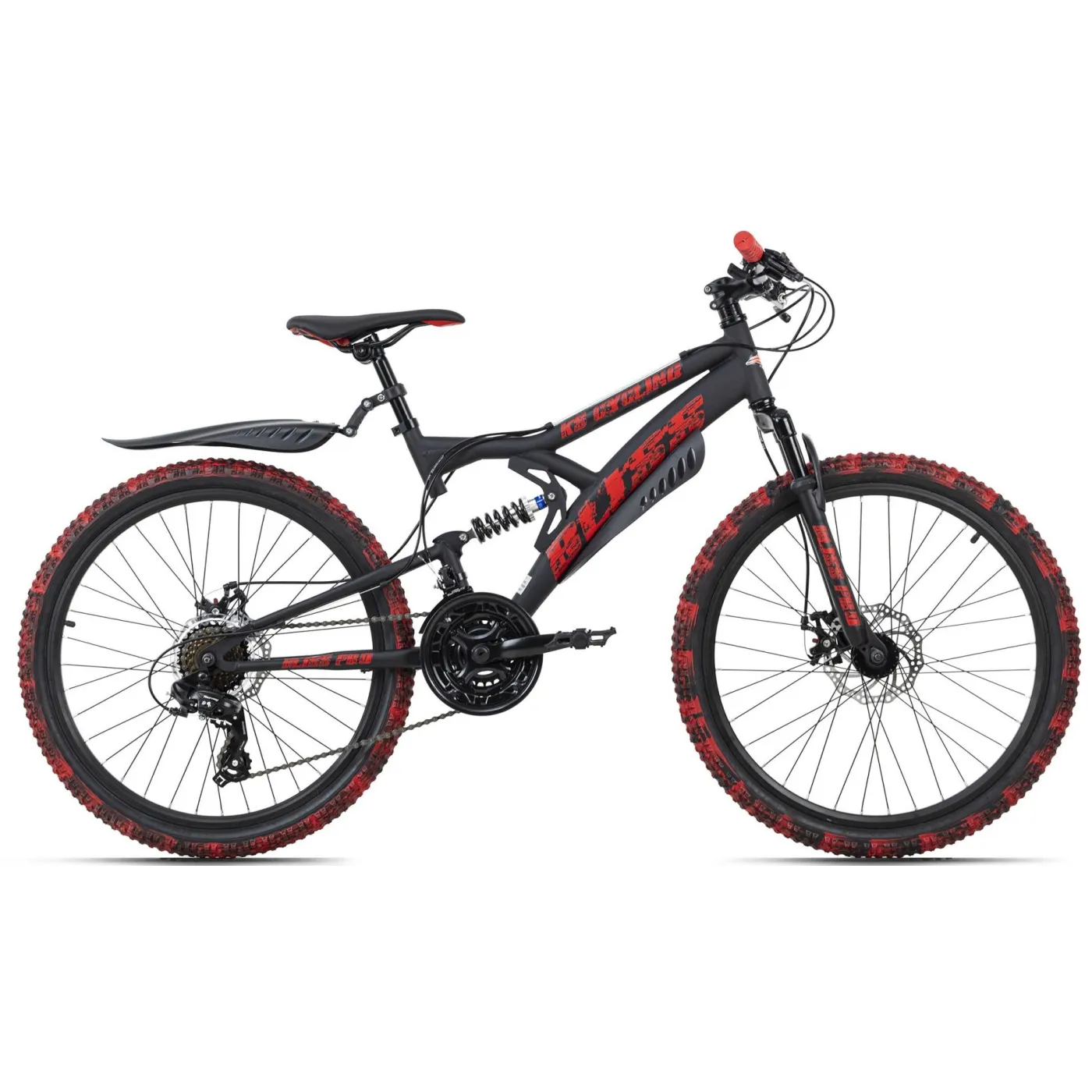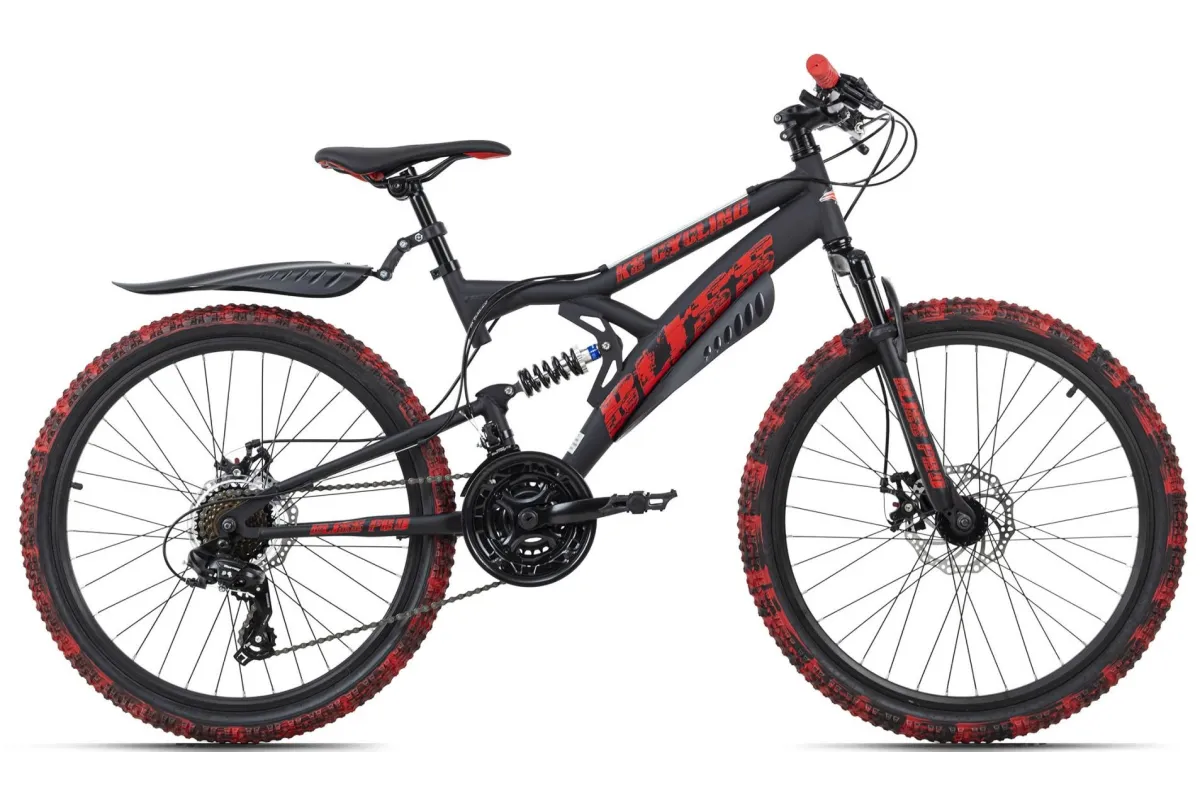 24-calowy rower dziecięcy Bliss Pro firmy KS Cycling to solidny rower górski z pełnym zawieszeniem dla najmłodszych, który w niczym nie ustępuje wersjom dla dorosłych. Malowanie opon jest wyjątkowe i zostało nałożone ręcznie na każdą z nich - nie ma drugiej takiej samej opony! Projekt w kolorze czerwonym i czarnym z efektami „zniszczenia” sprawia, że rower dziecięcy przyciąga wzrok. Hamulce tarczowe zapewniają bezpieczeństwo, a 21 biegów pozwala na precyzyjne dopasowanie stylu jazdy do panujących na trasie warunków.