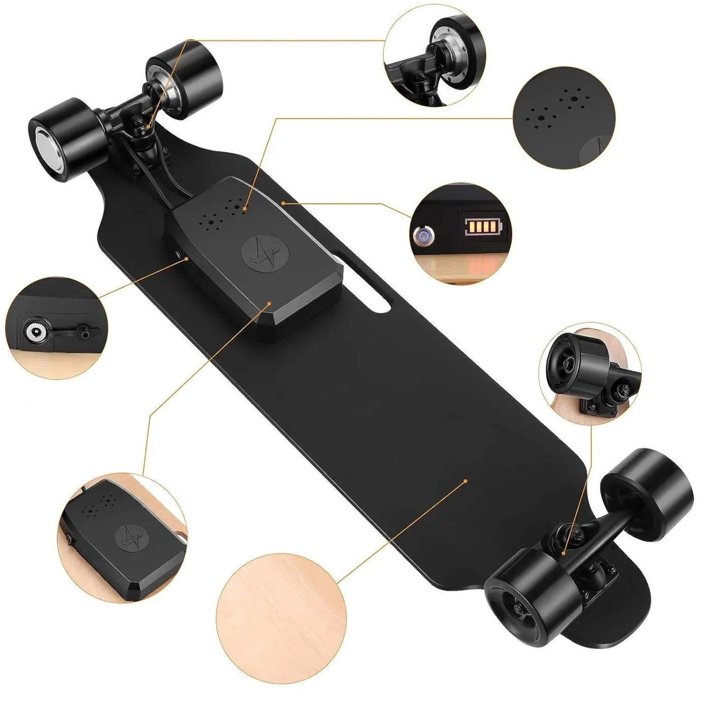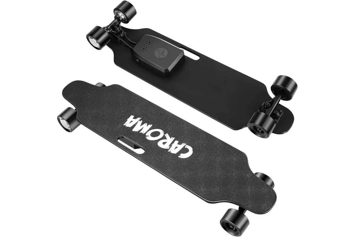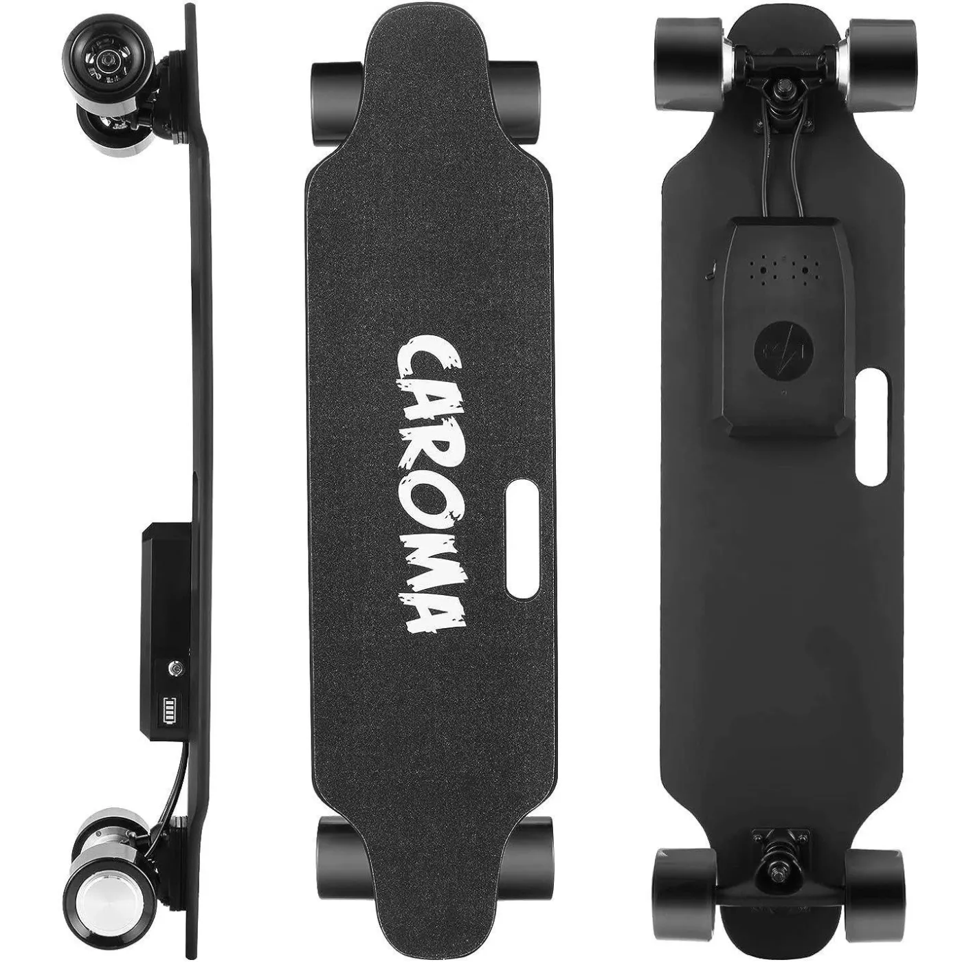 Deskorolka Caroma Longboard jest wyposażona w podwójny silnik o mocy 350 W x 2, który umożliwia przyspieszenie do 25 km/h oraz płynną i cichą jazdę. Ten model posiada także baterię litową nowej generacji 29,4 V 4000 mAh, którą można w pełni naładować w zaledwie 3 godziny. Deskorolka świetnie sprawdza się na krótkie wycieczki, czy jazdę po mieście dzięki maksymalnemu zasięgowi jazdy do około 18 km. Caroma jest wyposażona w bezprzewodowy pilot zdalnego sterowania 2,4 GHz, który może osiągnąć zasięg 46 stóp i pozwala na sterowanie do przodu, do tyłu, przyspieszanie i hamowanie.