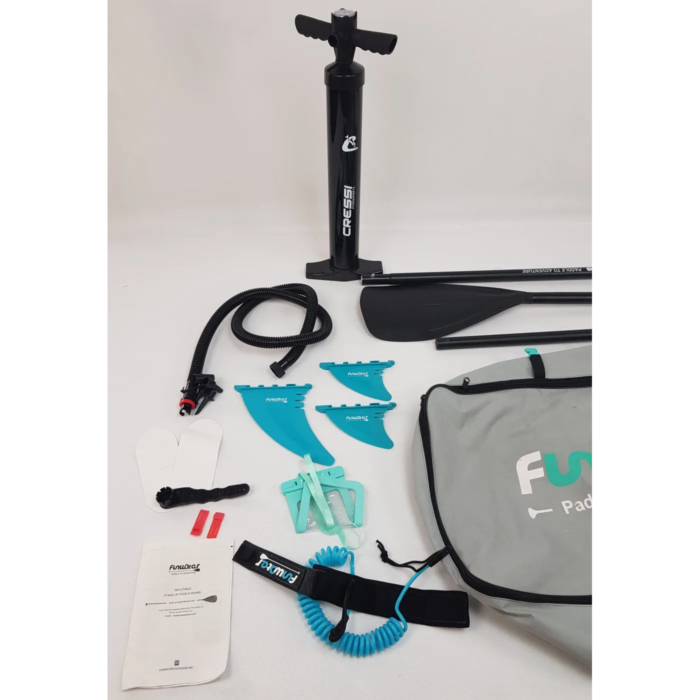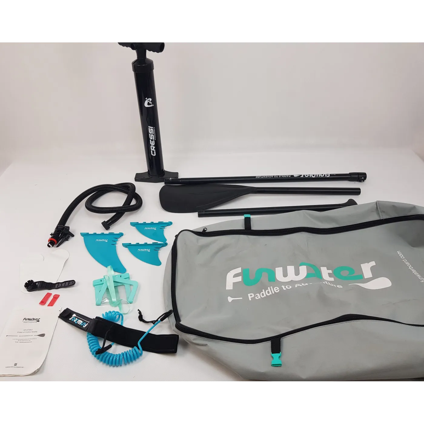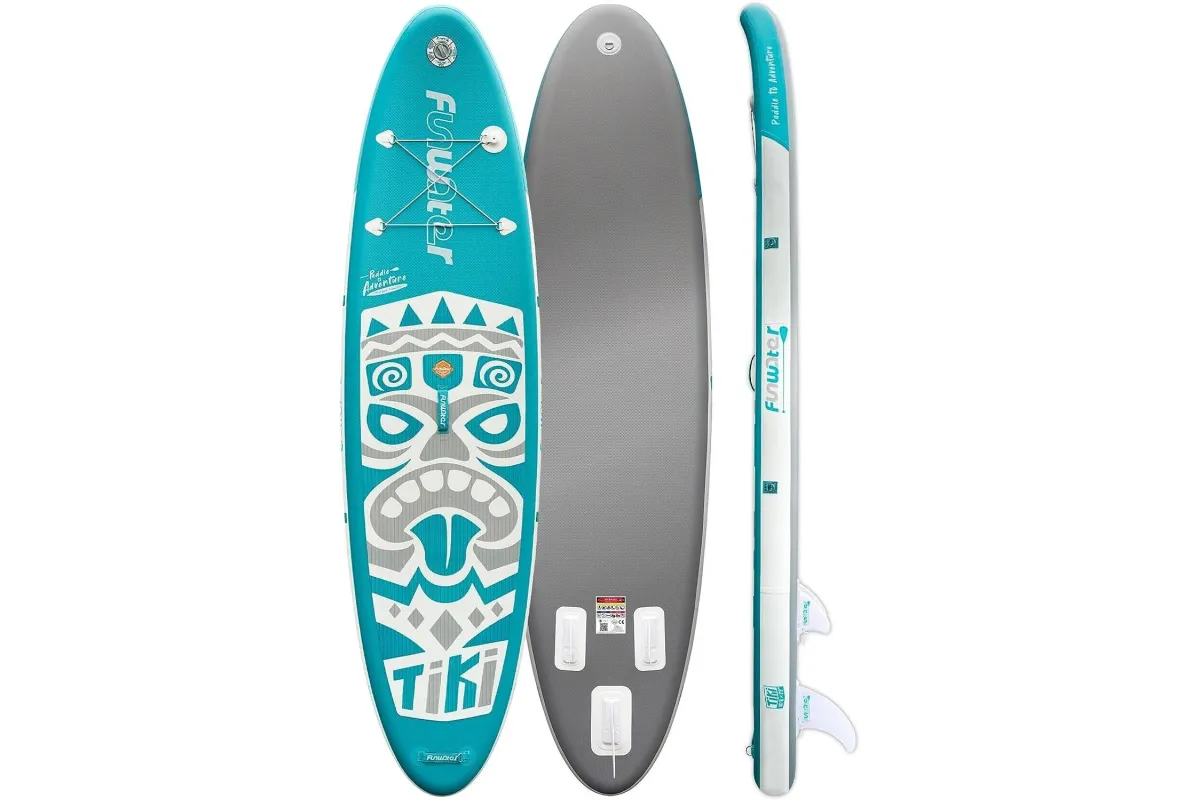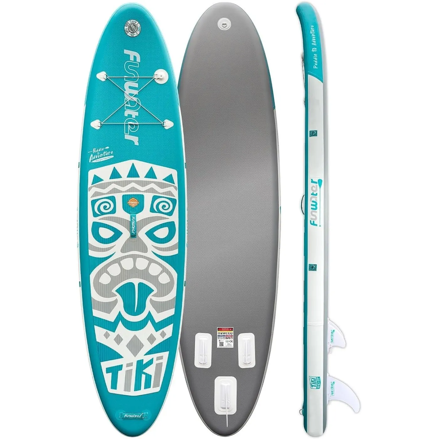FunWater TIKI wykonano z dwóch warstw PCV, wymiary nadmuchiwanej deski do wiosłowania na stojąco wynoszą 335 cm długości, 84 cm szerokości i 15 cm grubości, waga wynosi 9.9 kg, a maksymalne obciążenie wynosi do 150 kg. Stabilna deska do wiosłowania na stojąco nadaje się do wszelkich poziomów umiejętności oraz warunków. Ta deska do wiosłowania na stojąco swą stabilność zawdzięcza głównie swej szerokości, kwadratowemu ogonowi oraz ogólnej grubości 15 cm.