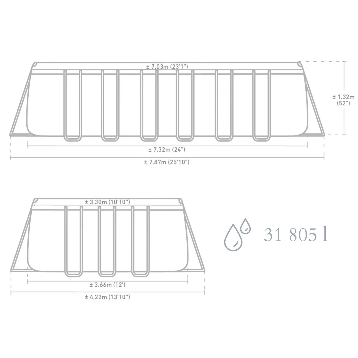 Ten prostokątny basen Intex 26364 GN 11w1 o wymiarach 732x366x132 cm to propozycja z klasy premium. Zbiornik wykonany został z 3-warstwowego materiału, który charakteryzuje się doskonałą jakością. Dwie zewnętrzne warstwy zrobione są z PVC. Pomiędzy nimi znajduje się siatka nylonowa. Całość tworzy wyjątkowo wytrzymałą i stabilną konstrukcję. Pojemność zbiornika wynosi aż 31805 litrów i co ważne za sprawą niezwykle wytrzymałego stelaża, może być on napełniany do 90% swojej objętości. Stylowa sylwetka oraz oryginalny design basenu sprawią, że doda on charakteru Twojemu ogrodowi. A Ty przy okazji zapewnisz sobie bezpieczne miejsce do pływania lub gry w siatkówkę wodną.