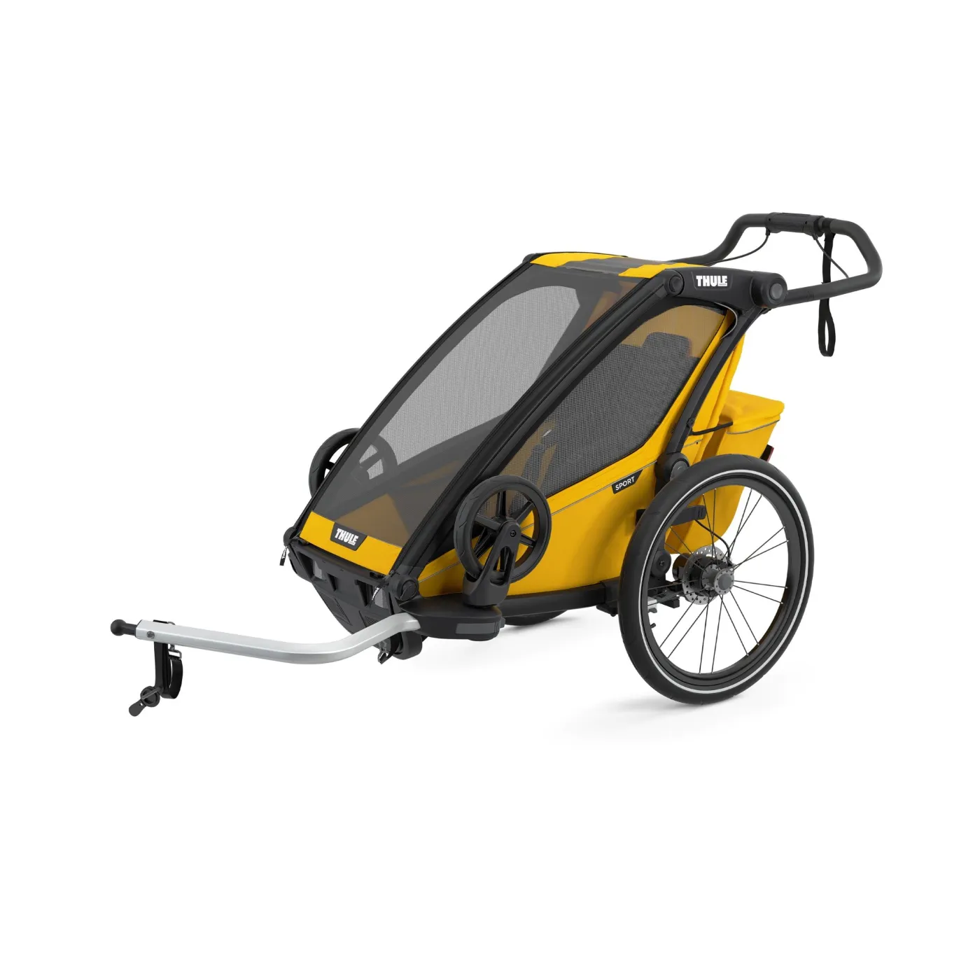 Thule Chariot Sport to wielofunkcyjna przyczepka sportowa której możesz używać zarówno podczas spaceru, jazdy na rowerze, biegania, a nawet sportach zimowych, takich jak narty biegowe (po zastosowaniu specjalnych akcesoriów). Chariot Sport wyposażony został dodatkowo w regulowane zawieszenie oraz regulowane oparcie siedziska. Kabina Climate Control Cockpit ma wyjmowane okna i regulowaną osłoną przeciwsłoneczną. Siedzisko dodatkowo wyposażone zostało w miękką komfortową wkładkę.
