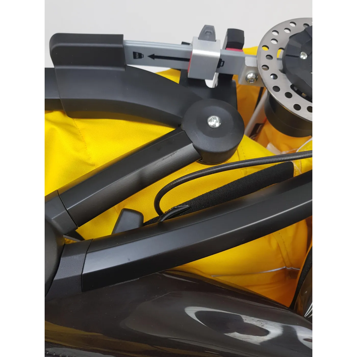- Ręczne hamulce tarczowe — zwiększają kontrolę na stromej nawierzchni i podczas biegu czy jazdy na rolkach