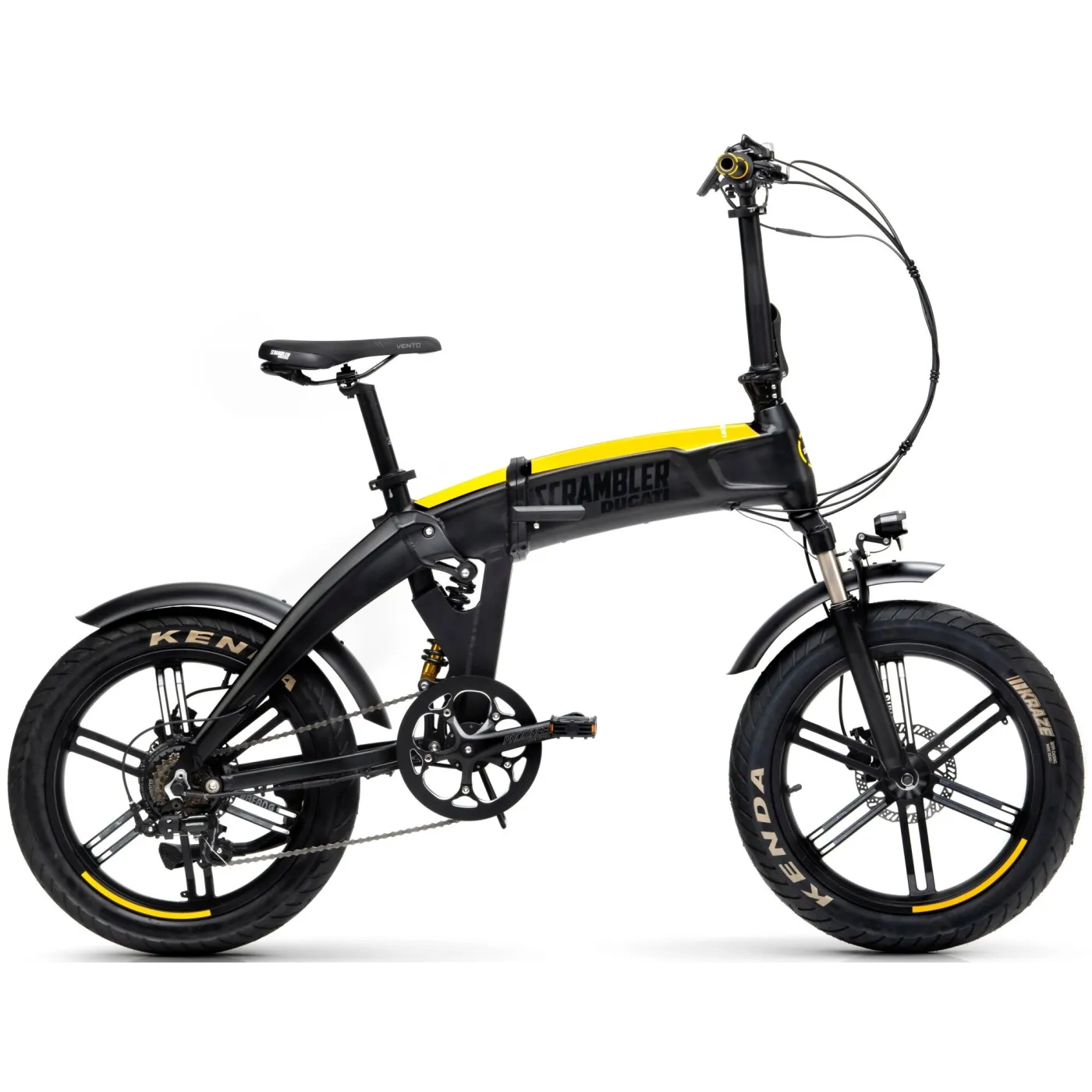Wyjątkowy rower elektryczny DUCATI Scrambler SCR-E Sport to doskonałe rozwiązanie dla każdego, kto chce ograniczyć wysiłek przy rowerowych przejażdżkach, lub po prostu uwielbia najnowsze technologie. Rower świetnie sprawdzi się podczas wypadów na miasto czy rekreacyjnych przejażdżkach. Został wyposażony w bezszczotkowy silnik o mocy 250 W. Ten typ silnika wymaga minimalnej konserwacji, a do tego jest bardzo cichy i świetnie utrzymuje poziom prędkości. Bateria ma pojemność 12.8 Ah i 486 Wh przy napięciu 36 V i jest zintegrowana z ramą. W pełni naładowana gwarantuje zasięg nawet do 80 km. Całkowity zasięg zależy od wagi kierowcy, warunków drogowych i pogodowych, ale jej poziom zawsze możesz szybko sprawdzić na wyświetlaczu LCD. Wykorzystano aluminiową, składaną ramę, która nie tylko jest bardzo wytrzymała, ale też bardzo poręczna. Tak zwane "grube" opony o szerokości 4 cali świetnie sprawdzają się podczas jazdy po nierównych i nieutwardzonych drogach.