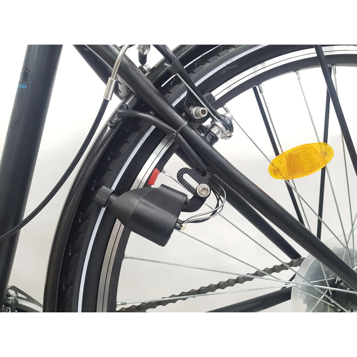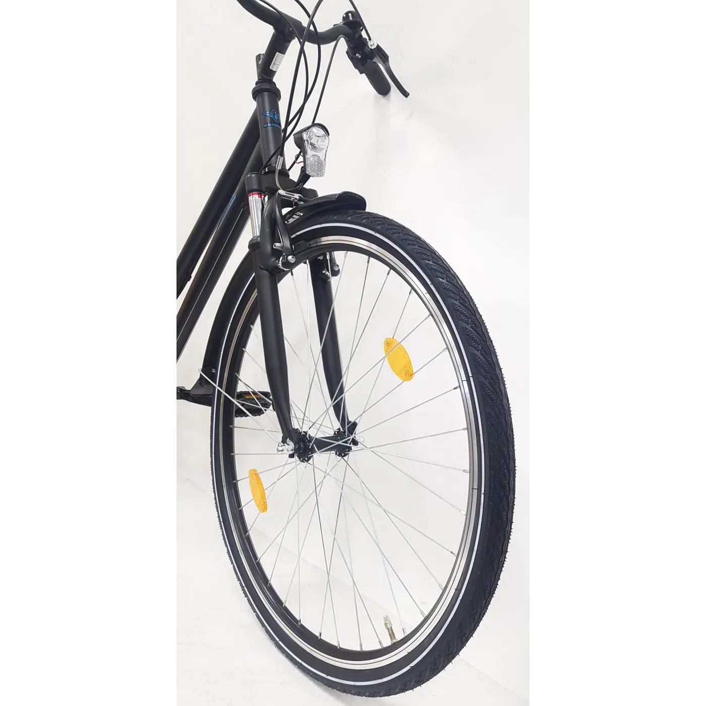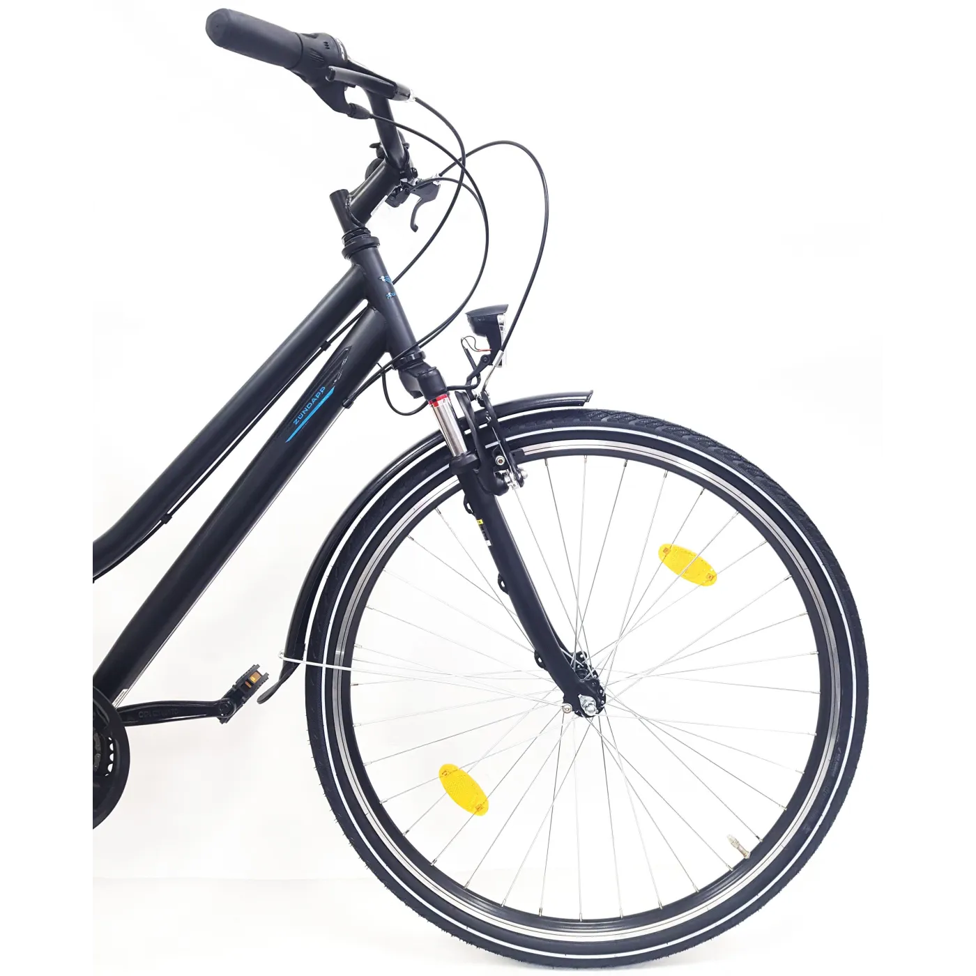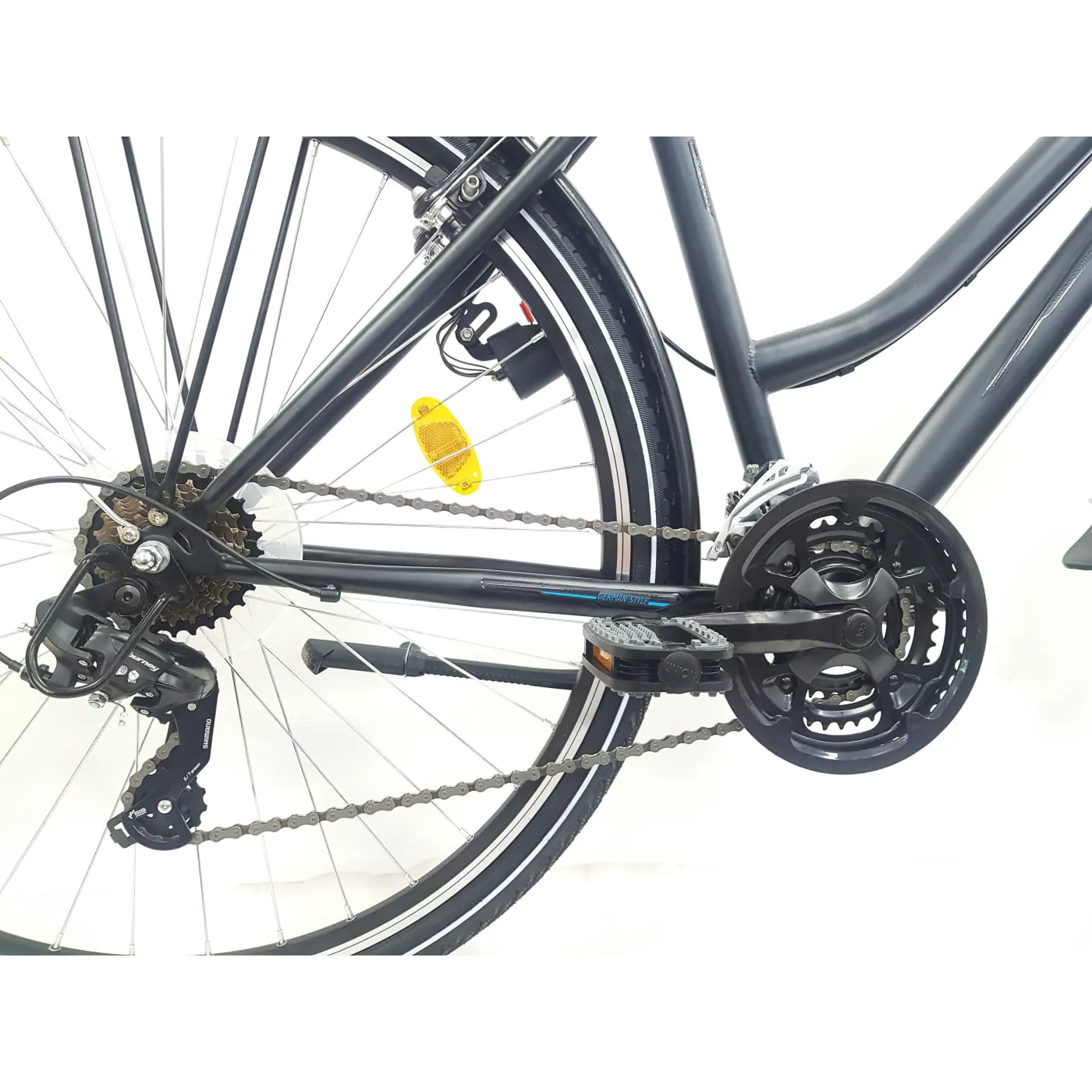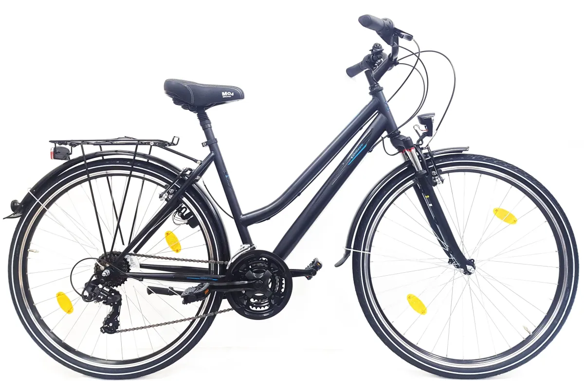 Uniwersalny rower trekkingowy, z którym każda wycieczka będzie niezapomnianą przygodą. Ten model z 28-calowymi kołami i hamulcami v-brake zapewnia wygodną i bezpieczną jazdę, natomiast lekko obniżona rama sprawia, że ten rower idealnie sprawdza się zarówno dla kobiet jak i mężczyzn. Niezależnie, czy wybierasz się na miasto czy na dłuższą wyprawę, 21-biegowe przerzutki znacznie usprawnią Ci poruszanie się po trasie. Dodatkowe akcesoria, takie jak odblaski, oświetlenie, bagażnik czy dzwonek dodają świetnego designu i sprawiają, że użytkowanie jest o wiele przyjemniejsze.