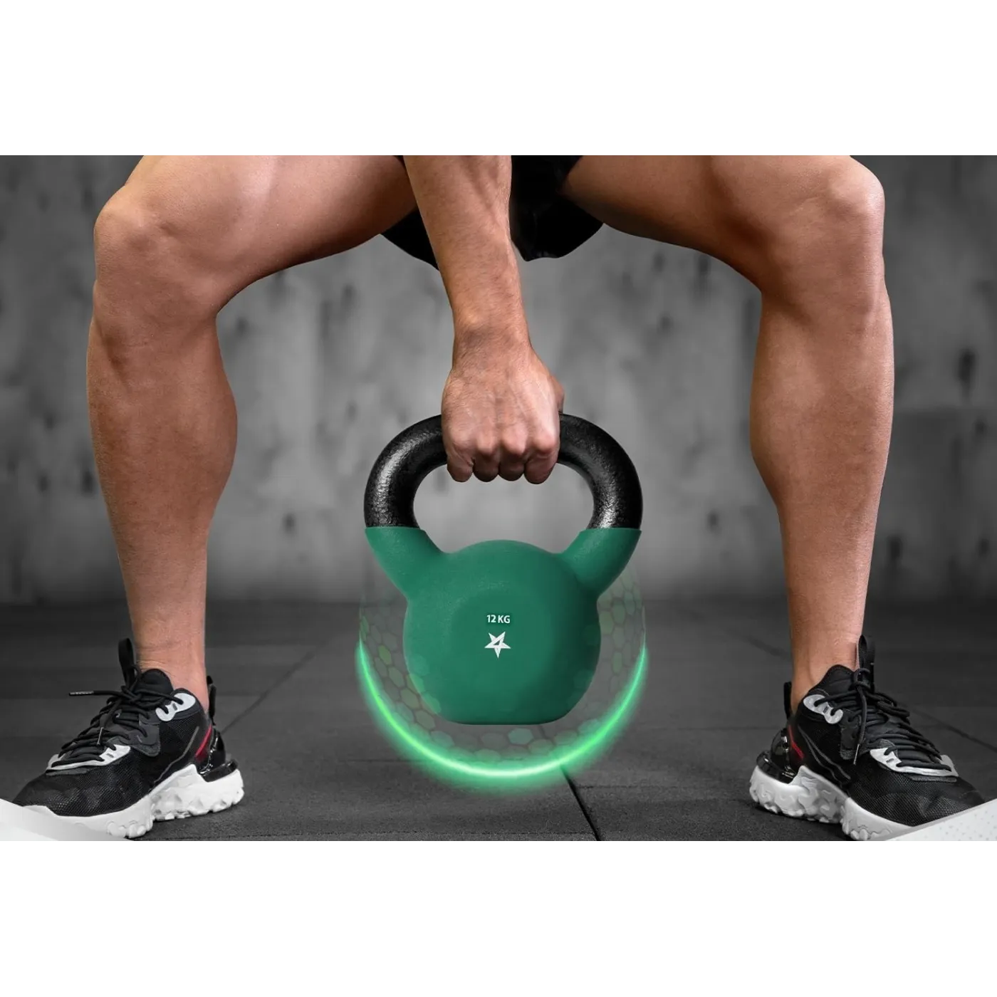 Kettlebell to solidny i trwały odważnik wykonany z litego żeliwa, przeznaczony do intensywnych sesji treningowych. Pokryty jest neoprenowym materiałem, który chroni podłogę i sam odważnik przed uszkodzeniami, zapewniając trwałość i czystość obszaru treningowego.