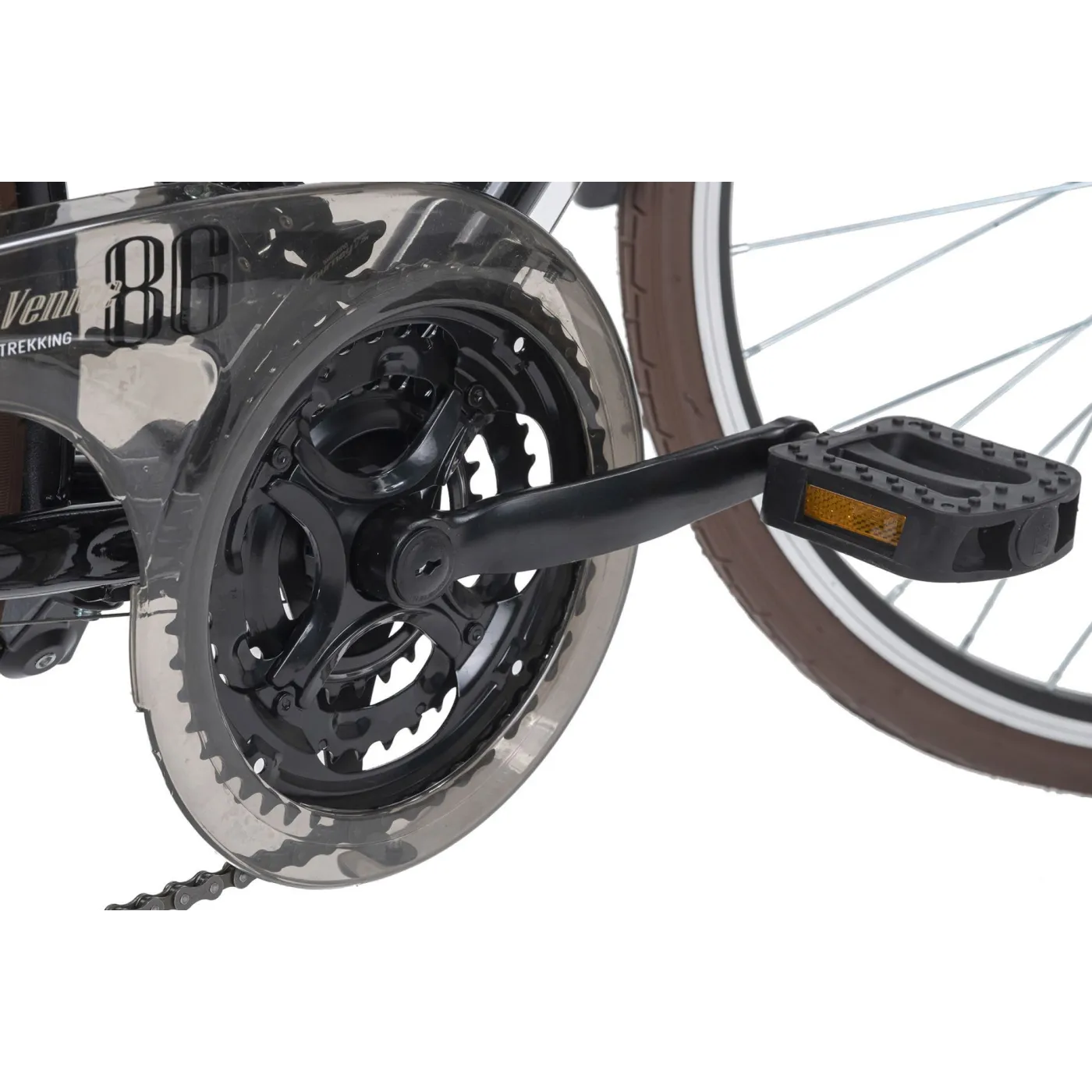 28-calowy męski rower trekkingowy VENICE firmy KS Cycling jest przeznaczony do jazdy po mieście, a także na dłuższe wycieczki. Ten model ma czarną ramę z eleganckimi detalami. Opony, osłona łańcucha, siodełko i uchwyty w jednym kolorze świetnie dopełniają cały design. Dzięki 21-biegowej przerzutce wzniesienia nie stanowią już problemu.