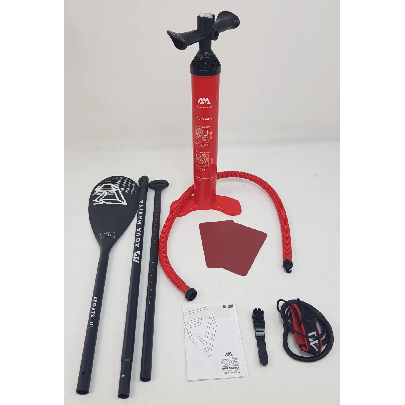 - Pompka Aqua Marina Double Action LIQUID AIR V2 o większej pojemności tłoka, pozwalająca na szybkie i łatwe napompowanie deski.