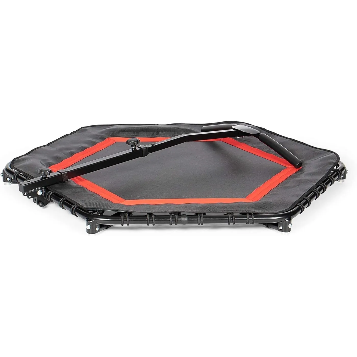 SportPlus SP-T-111F to składana trampolina fitness z uchwytem. Posiada 36 gumowych linek, a uchwyt można regulować do 5 różnych poziomów, a także można go całkowicie odkręcić. Dodatkowo, średnica maty do skakania wynosi aż 126 cm, co pozwala na zróżnicowane ćwiczenia wszystkich użytkowników do 130 kg.