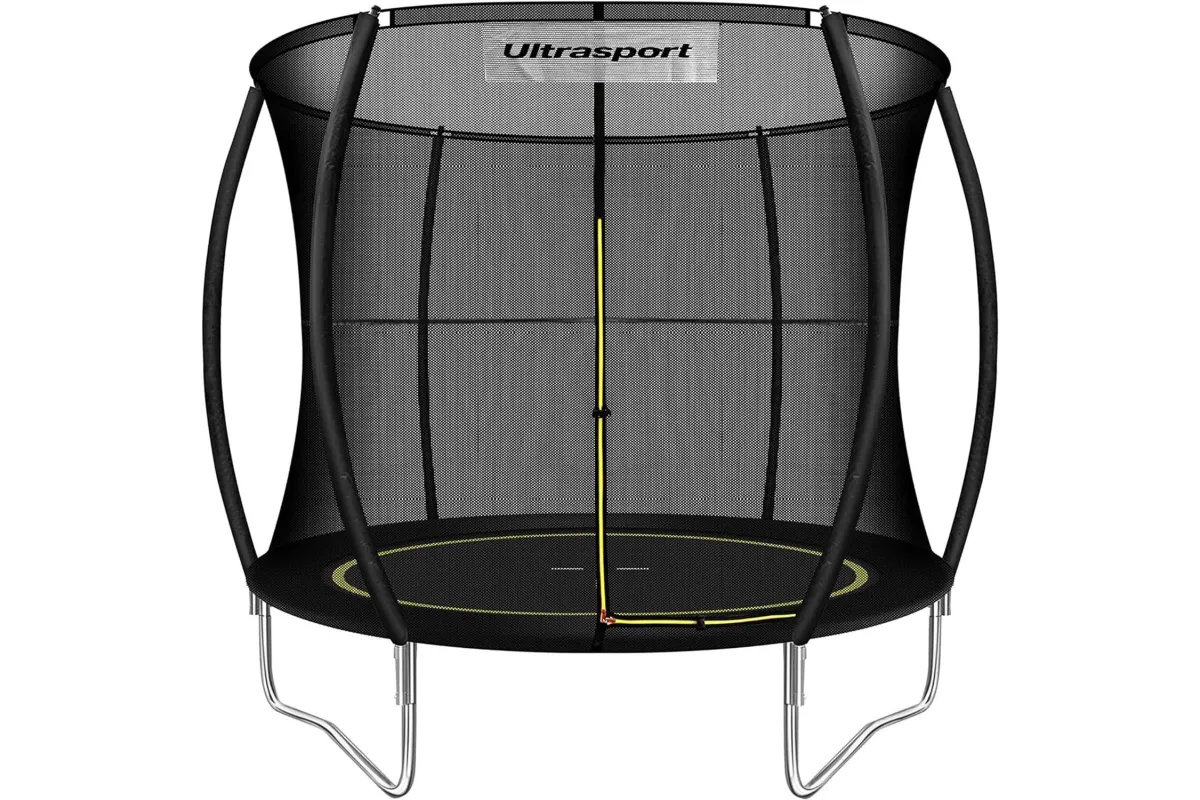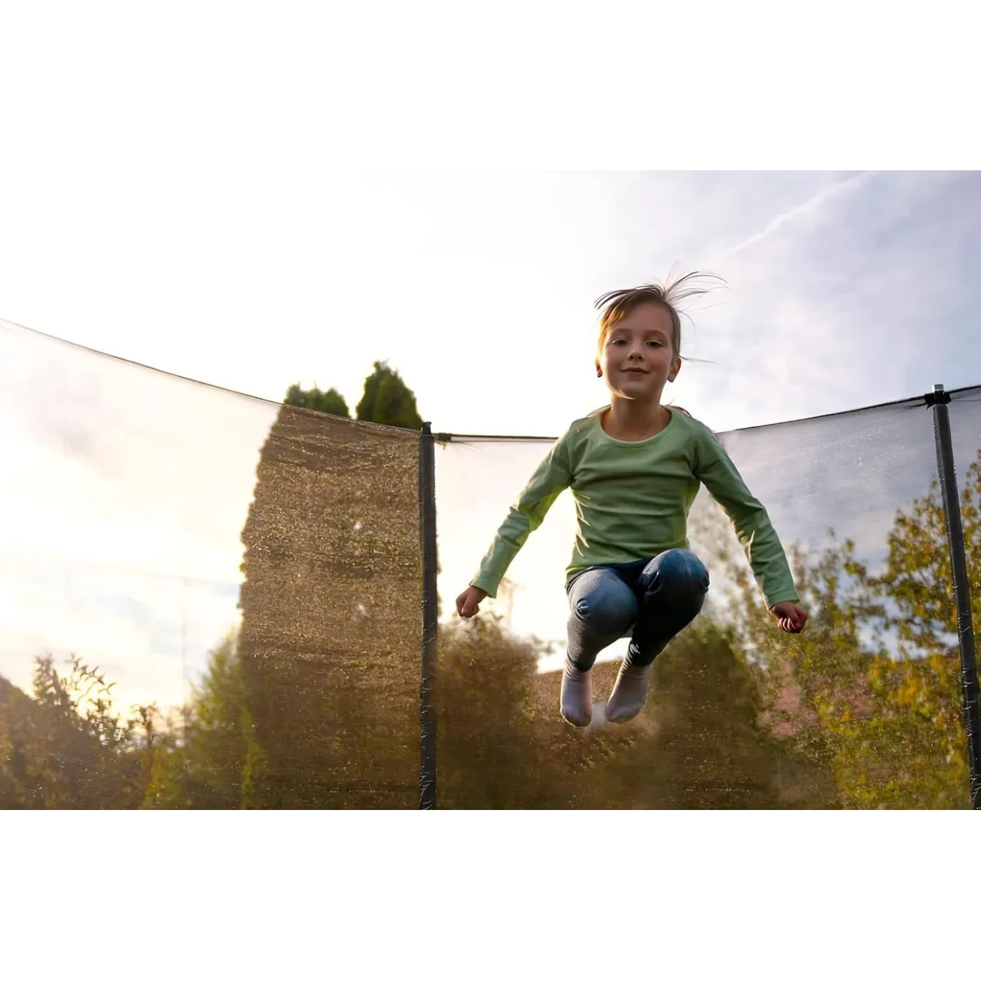 Innowacyjna trampolina firmy Ultrasport jest bardzo bezpieczna do skakania, ponieważ jest wyposażona w niezwykle sprężysty, elastyczny system linowy zamiast skrzypiących metalowych sprężyn. Ponadto jest idealna zarówno do zabawy na świeżym powietrzu, jak i do fitnessu: regularnie używana może poprawić kondycję, motorykę i zmysł równowagi. Ten model posiada także wysokiej jakości wyściółkę ramy z PVC (13 mm, wypełnienie piankowe), zakrzywione kijki z włókna szklanego, matę odbijającą z polietylenu oraz siatkę zabezpieczającą z materiału PET.