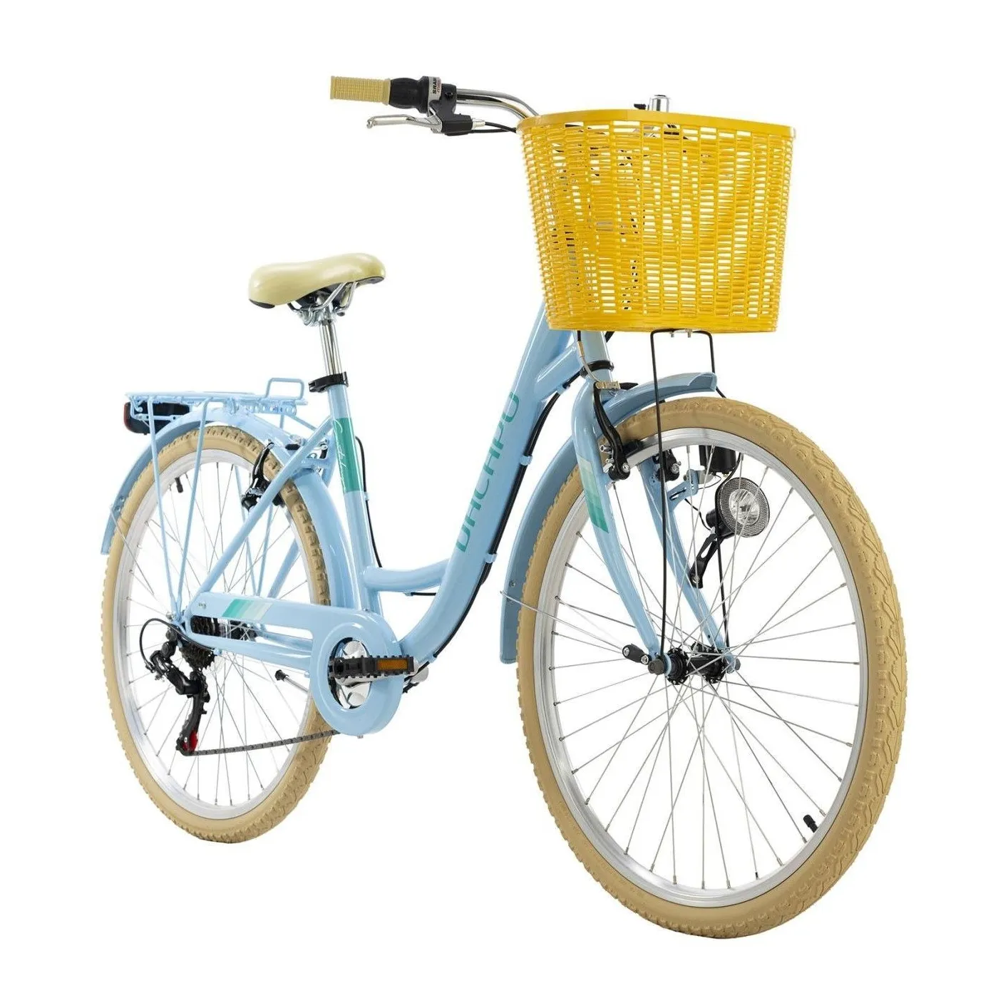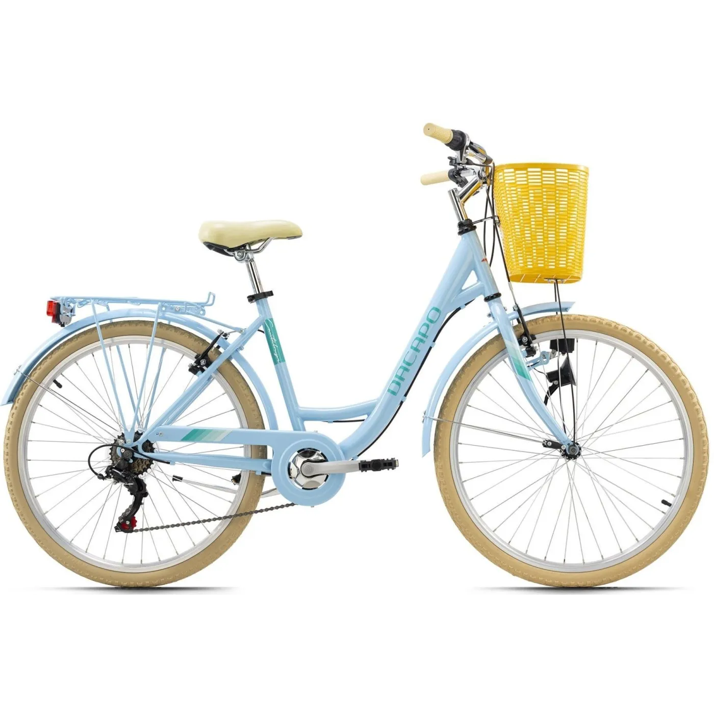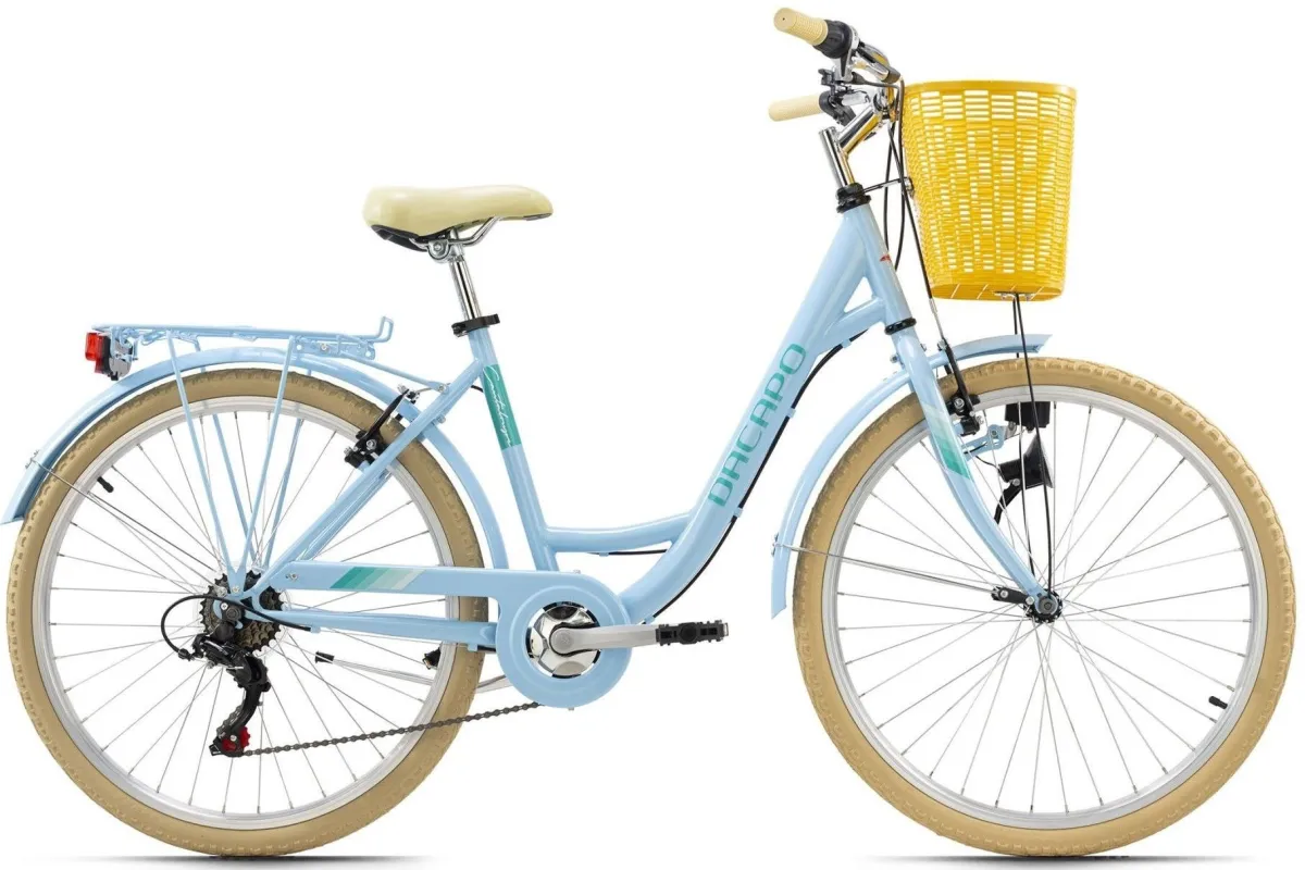 Letni i słodki jak melon, damski rower miejski Dacapo 26" CANTALOUPE wprawi Cię w dobry nastrój! Rama dostępna w modnym kolorze niebieskim z naklejkami, które sprawiają, że rower przyciąga wzrok podczas każdej jazdy. Praktyczny kosz na kierownicę pomieści zakupy, torebki itp., dzięki czemu bezpiecznie je przechowasz podczas każdej jazdy. Dzięki 6-biegowej przerzutce możesz spokojnie jeździć po mieście. Oświetlenie zapewnia bezpieczeństwo w ciemności.