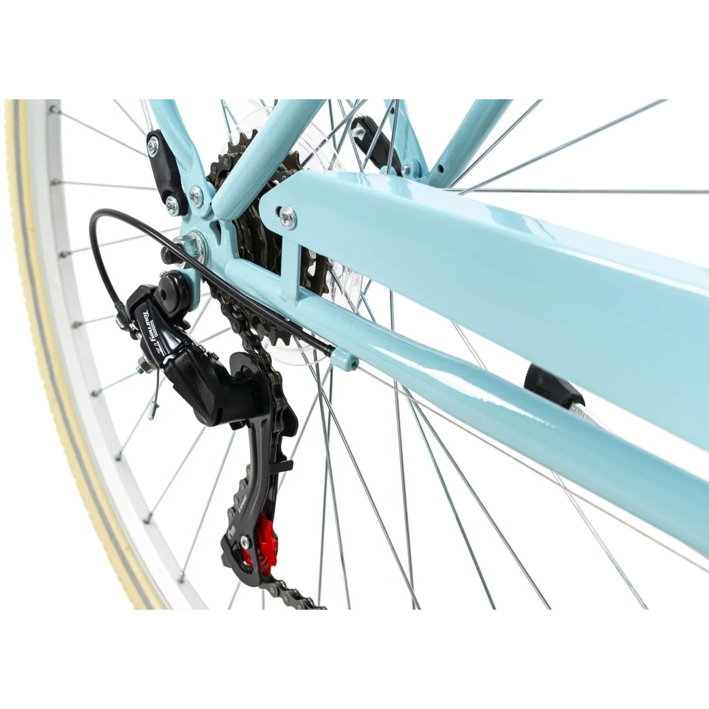 To nowoczesny rower ze stalową ramą i wieloma funkcjonalnymi komponentami. Przerzutka 6-biegowa firmy SHIMANO zapewnia relaksującą jazdę po mieście i dostosowuje się do Twoich indywidualnych potrzeb, a oświetlenie zapewnia bezpieczeństwo podczas jazdy po zmroku. Ponadto, rower ma wiele elementów bezpieczeństwa, takich jak błotniki, osłona łańcucha, zestaw oświetlenia i skuteczne hamulce V-brake.