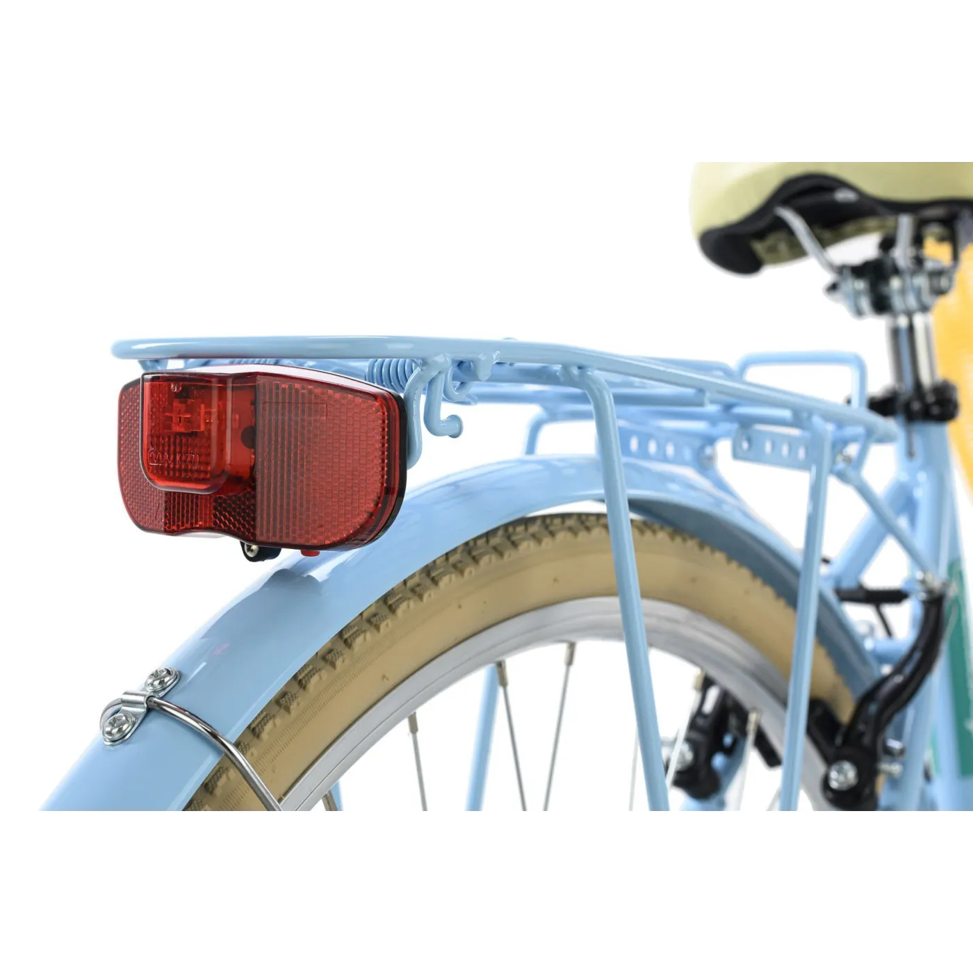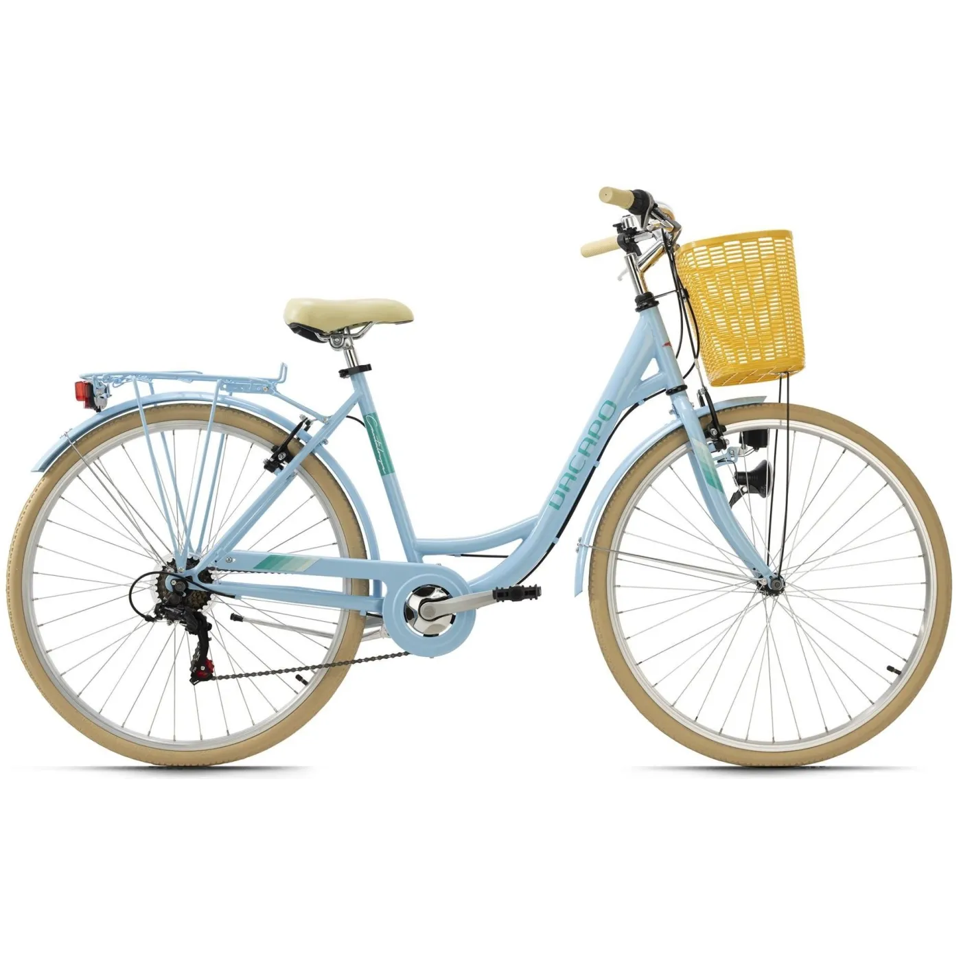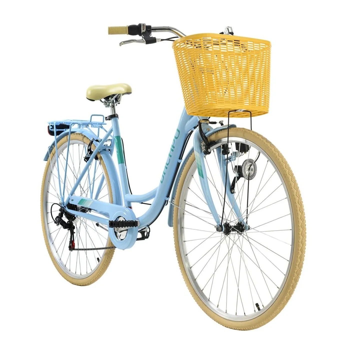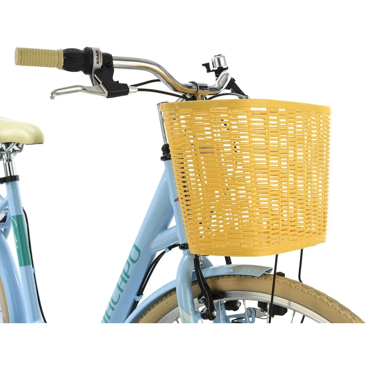 Damski rower miejski Dacapo 28" CANTALOUPE wprawi Cię w dobry nastrój! Naklejki sprawiają, że rower przyciąga wzrok podczas każdej jazdy. Praktyczny kosz na kierownicę pomieści zakupy czy torebki, które bezpiecznie przechowasz podczas każdej jazdy. Dzięki 6-biegowej przerzutce możesz spokojnie jeździć po mieście. Oświetlenie zapewnia bezpieczeństwo w nocy.
