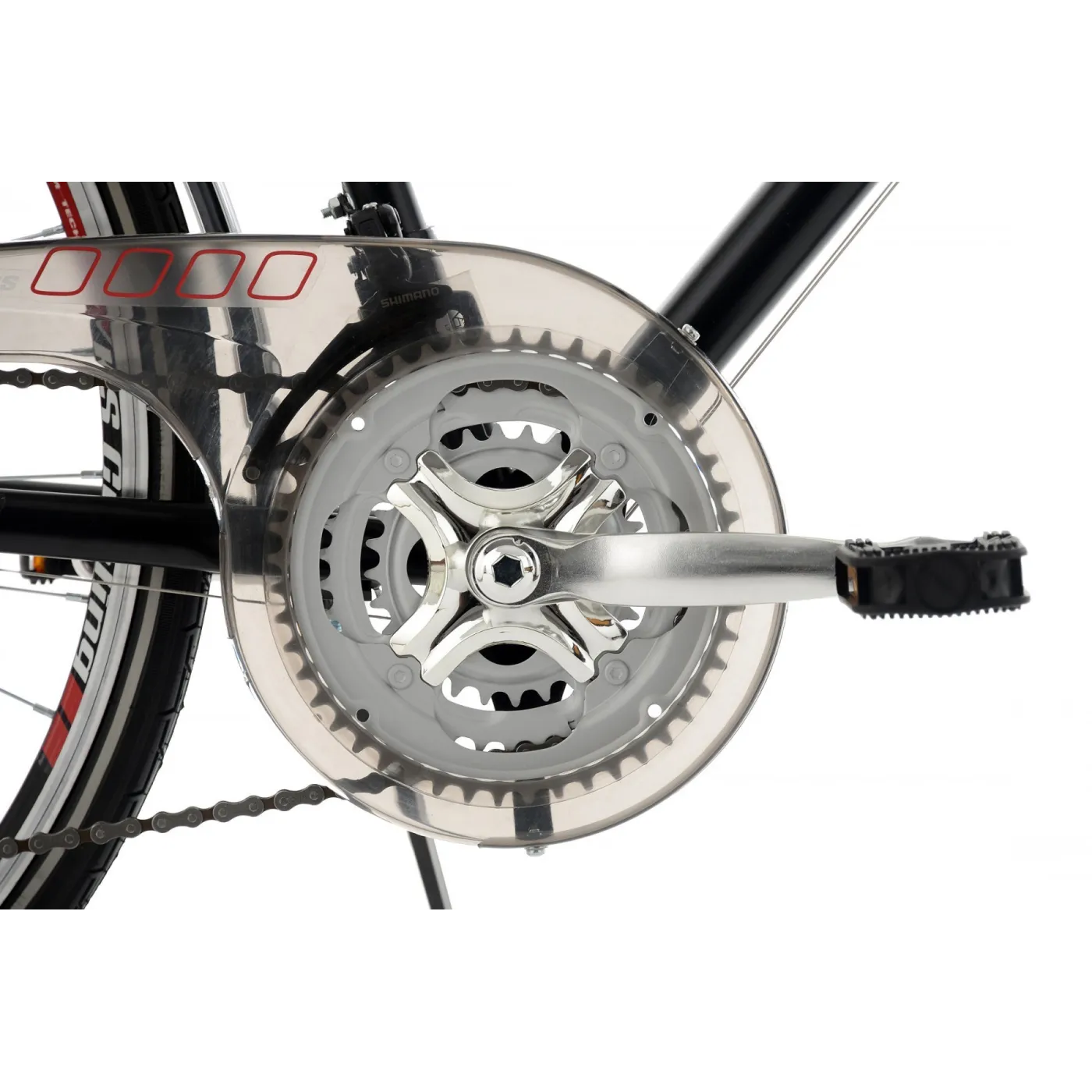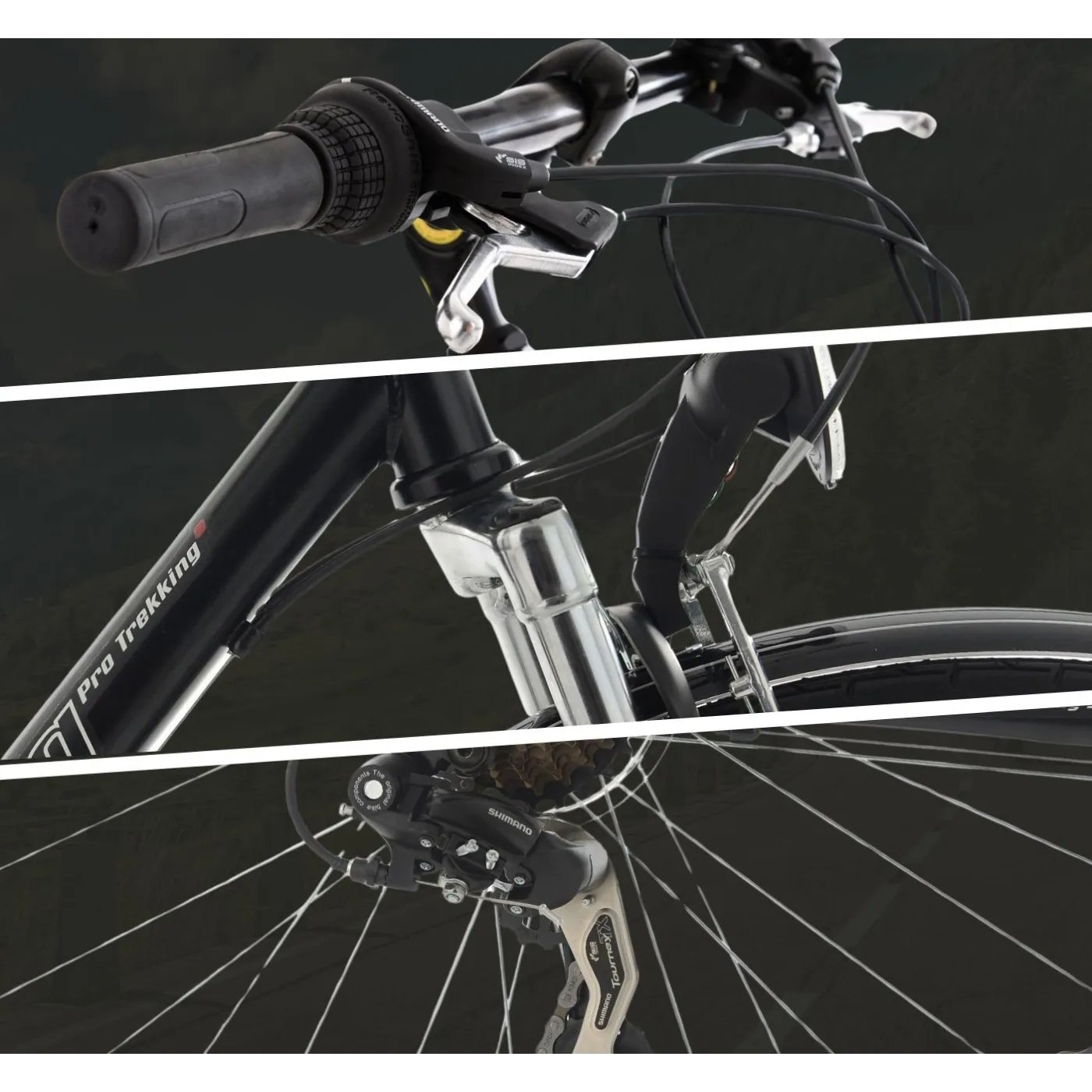 ✔️ 21-biegowa przerzutka Shimano oraz manetki obrotowe Revoshift pozwalają na płynną zmianę przełożeń, co ułatwia dostosowanie roweru do różnych warunków terenowych. Amortyzowany widelec absorbuje wstrząsy, co zapewnia większy komfort jazdy na nierównych drogach. Opony w rozmiarze 700x35C mają odpowiedni bieżnik, który zapewnia pewną przyczepność nawet na mokrej nawierzchni.