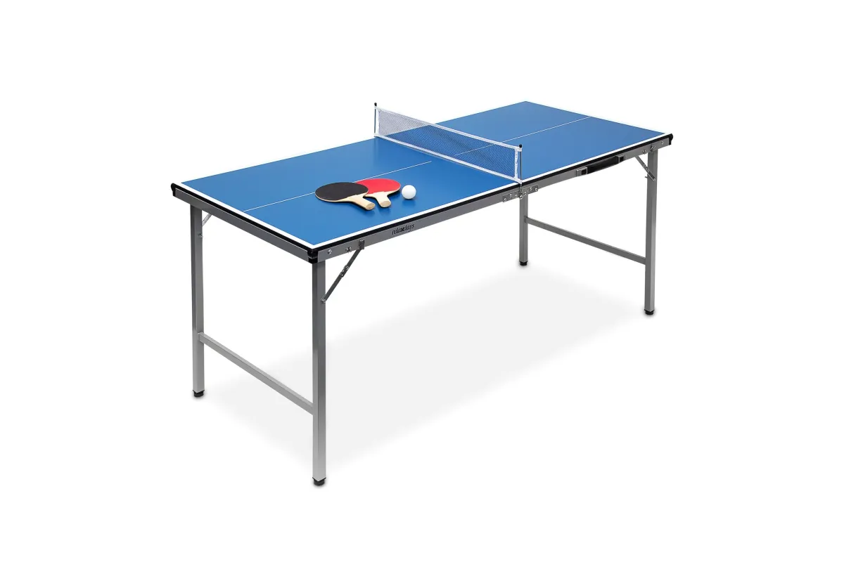 Uwielbiasz tenisa stołowego? Potrzebujesz tylko stołu, rakietek i piłeczek? W takim razie ten kompletny zestaw do tenisa stołowego jest właśnie dla Ciebie. Niebieski stół do tenisa stołowego można złożyć na środku i łatwo transportować dzięki uchwytowi. Graj zarówno w pomieszczeniach, jak i na zewnątrz, w domu, biurze czy ogrodzie: dzięki stołowi do ping ponga wszędzie możesz rozegrać turniej! Rzuć wyzwanie kolegom w biurze lub zagraj w ping ponga z najmłodszymi. Nie musisz się już martwić o akcesoria do tenisa stołowego, ponieważ w zestawie są 3 piłeczki, 2 rakietki i siatka wraz z metalowymi uchwytami.