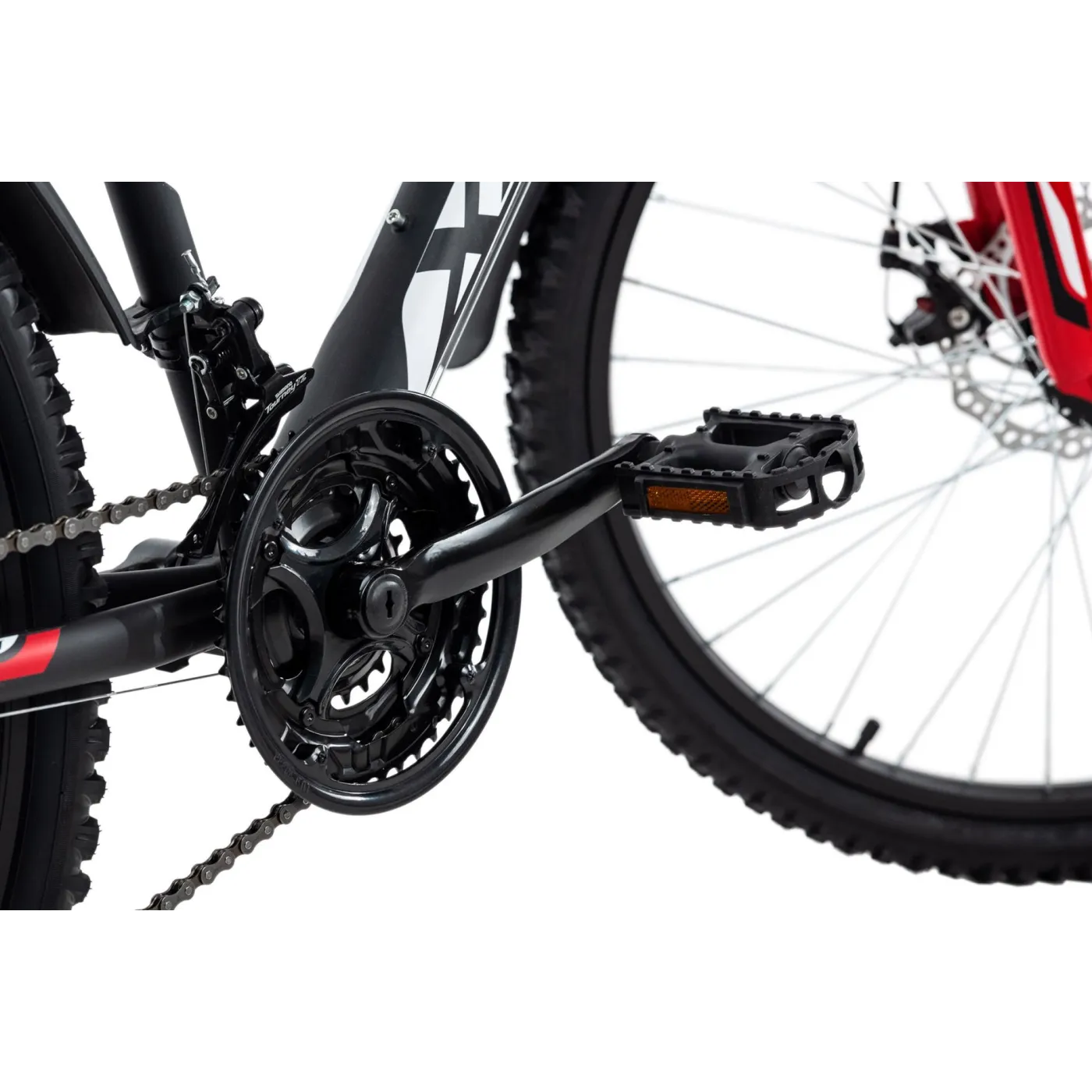 Zawsze gotowy do jazdy na pełnym gazie: terenowy rower górski XTINCT firmy KS Cycling wyróżnia się nie tylko wyglądem, ale również właściwościami jezdnymi. Wyposażony jest w 21-biegową przerzutkę z manetką Microshift. Mechaniczne hamulce tarczowe z przodu i z tyłu zapewniają niezbędne hamowanie. System oświetlenia, błotniki i ergonomiczne siodełko idealnie wpasowują się w ogólny obraz.