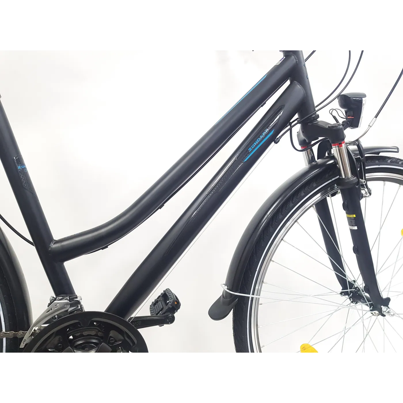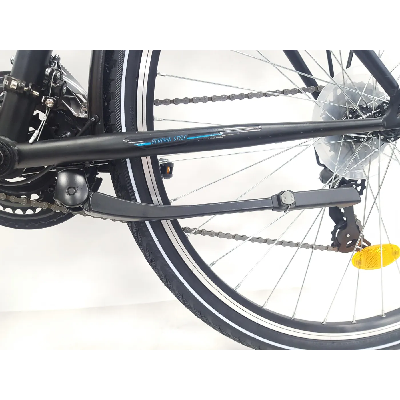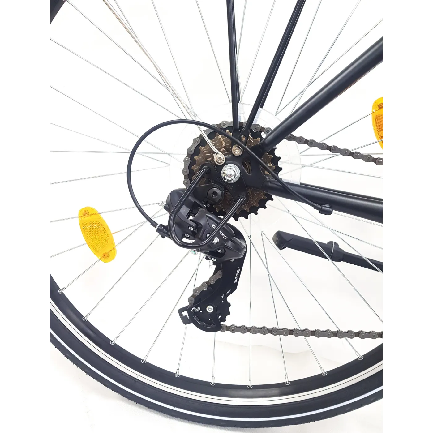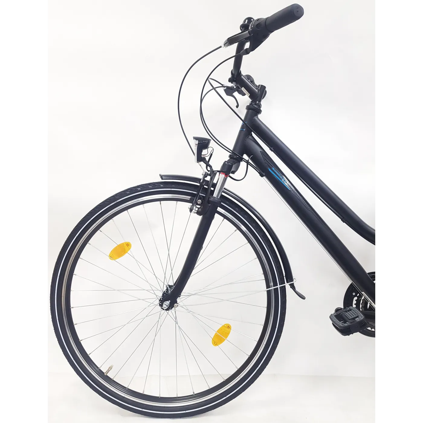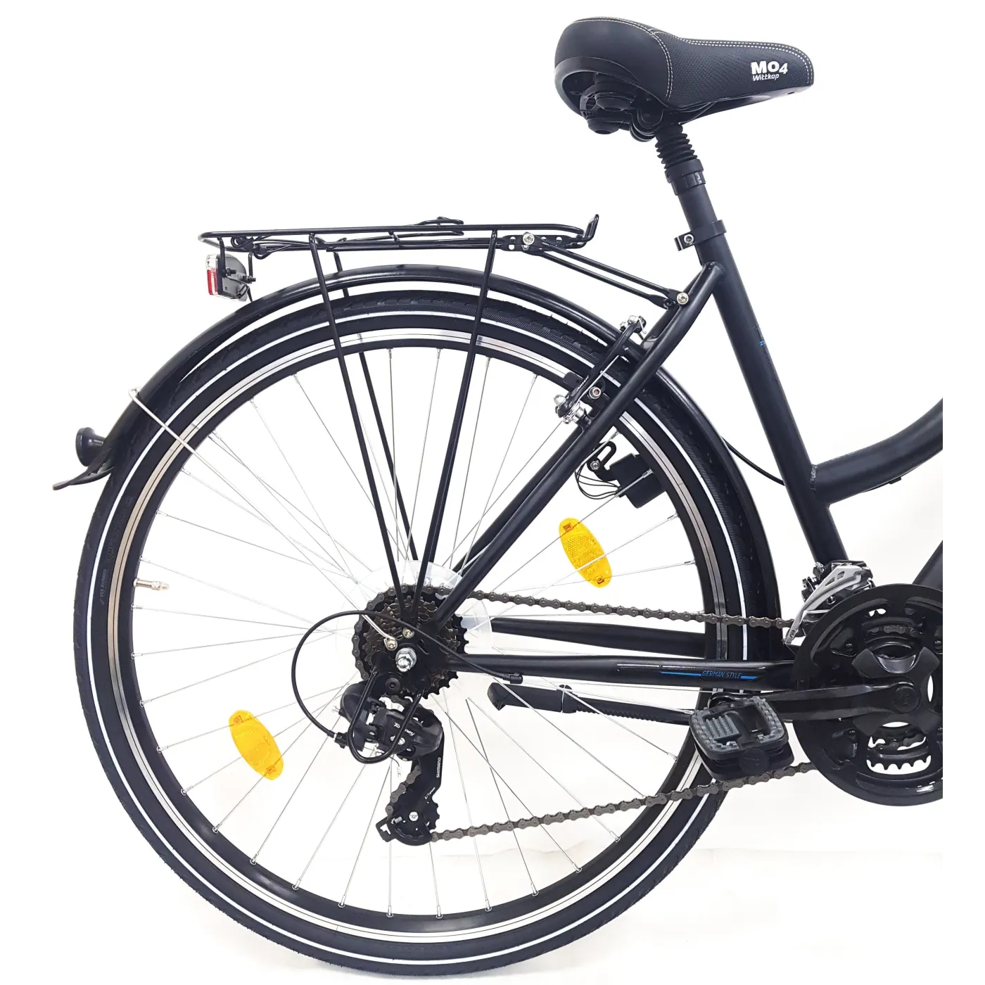 Uniwersalny rower trekkingowy, z którym każda wycieczka będzie niezapomnianą przygodą. Ten model z 28-calowymi kołami i hamulcami v-brake zapewnia wygodną i bezpieczną jazdę, natomiast lekko obniżona rama sprawia, że ten rower idealnie sprawdza się zarówno dla kobiet jak i mężczyzn. Niezależnie, czy wybierasz się na miasto czy na dłuższą wyprawę, 21-biegowe przerzutki znacznie usprawnią Ci poruszanie się po trasie. Dodatkowe akcesoria, takie jak odblaski, oświetlenie, bagażnik czy dzwonek dodają świetnego designu i sprawiają, że użytkowanie jest o wiele przyjemniejsze.