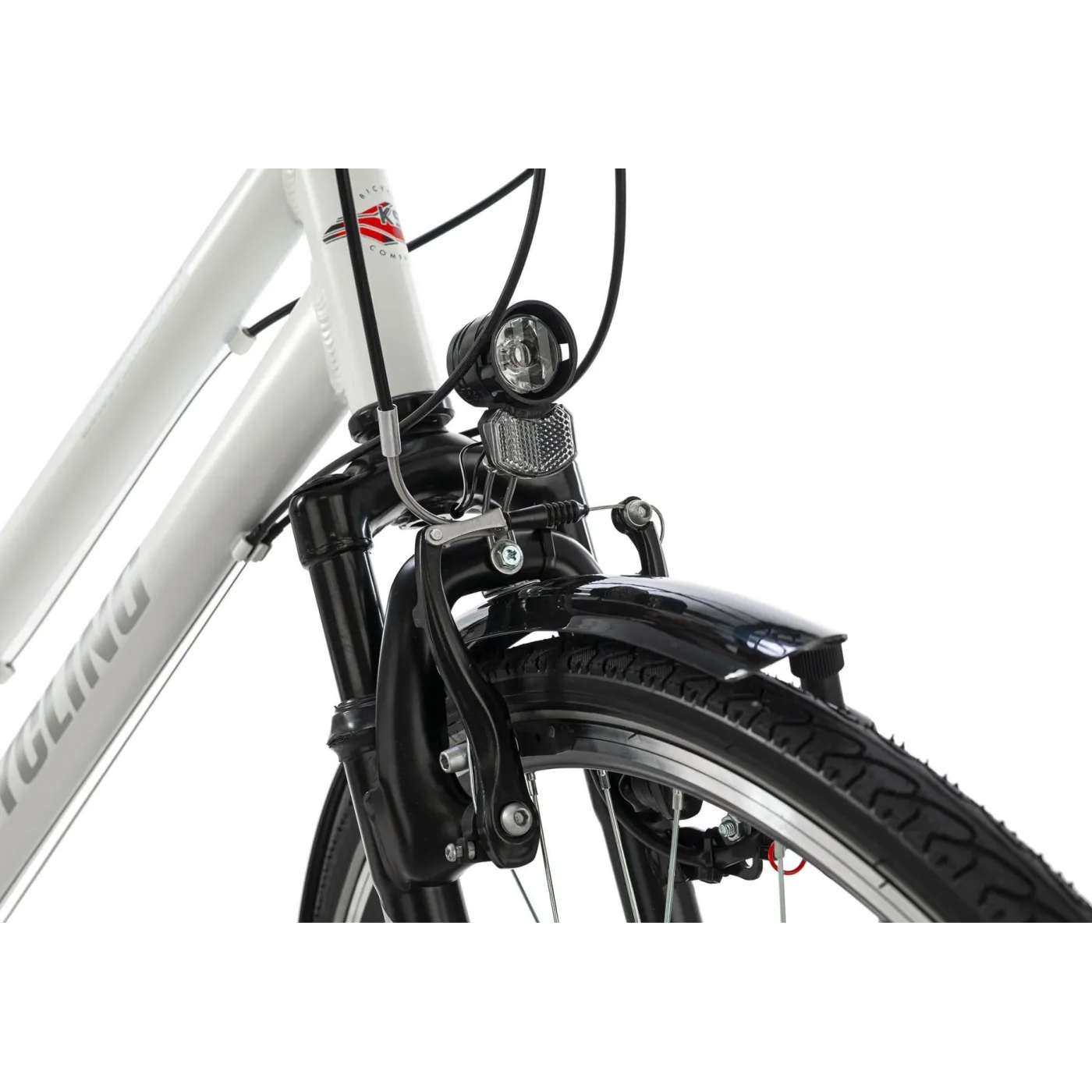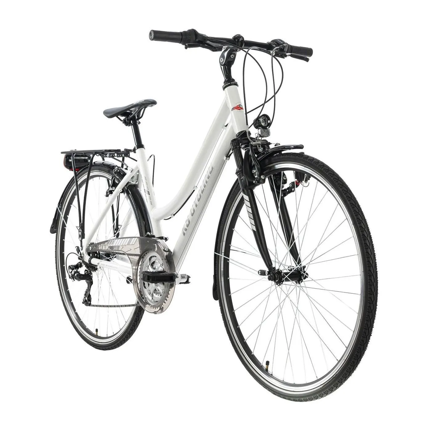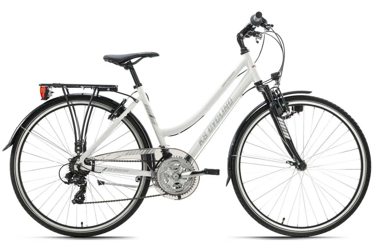 Elastyczny, sportowy towarzysz o wszechstronnych właściwościach: damski rower trekkingowy CANTERBURY 28" firmy KS Cycling radzi sobie z wieloma wyzwaniami, od szybkich przejażdżek po mieście po długie wycieczki w terenie. Biała aluminiowa rama połączona jest z subtelnymi szarymi detalami. Przezroczyste osłony łańcucha i płaska kierownica turystyczna dopełniają całości.