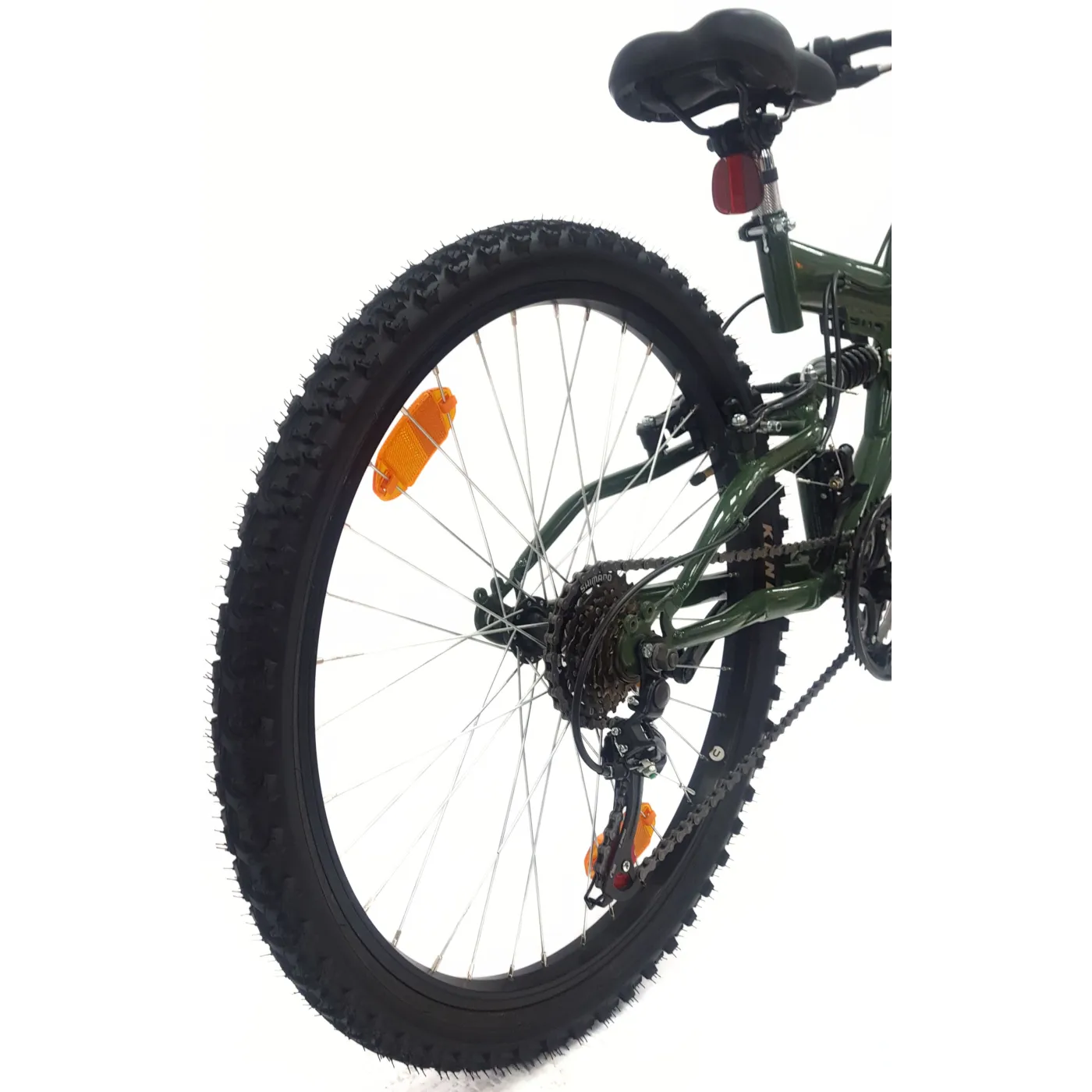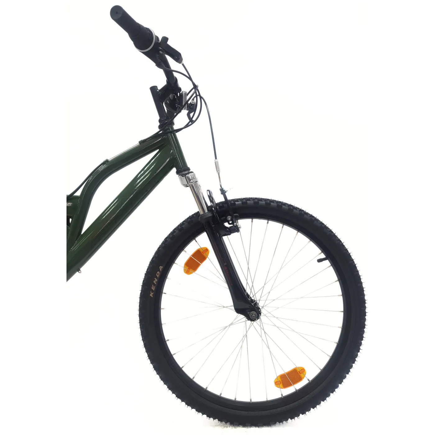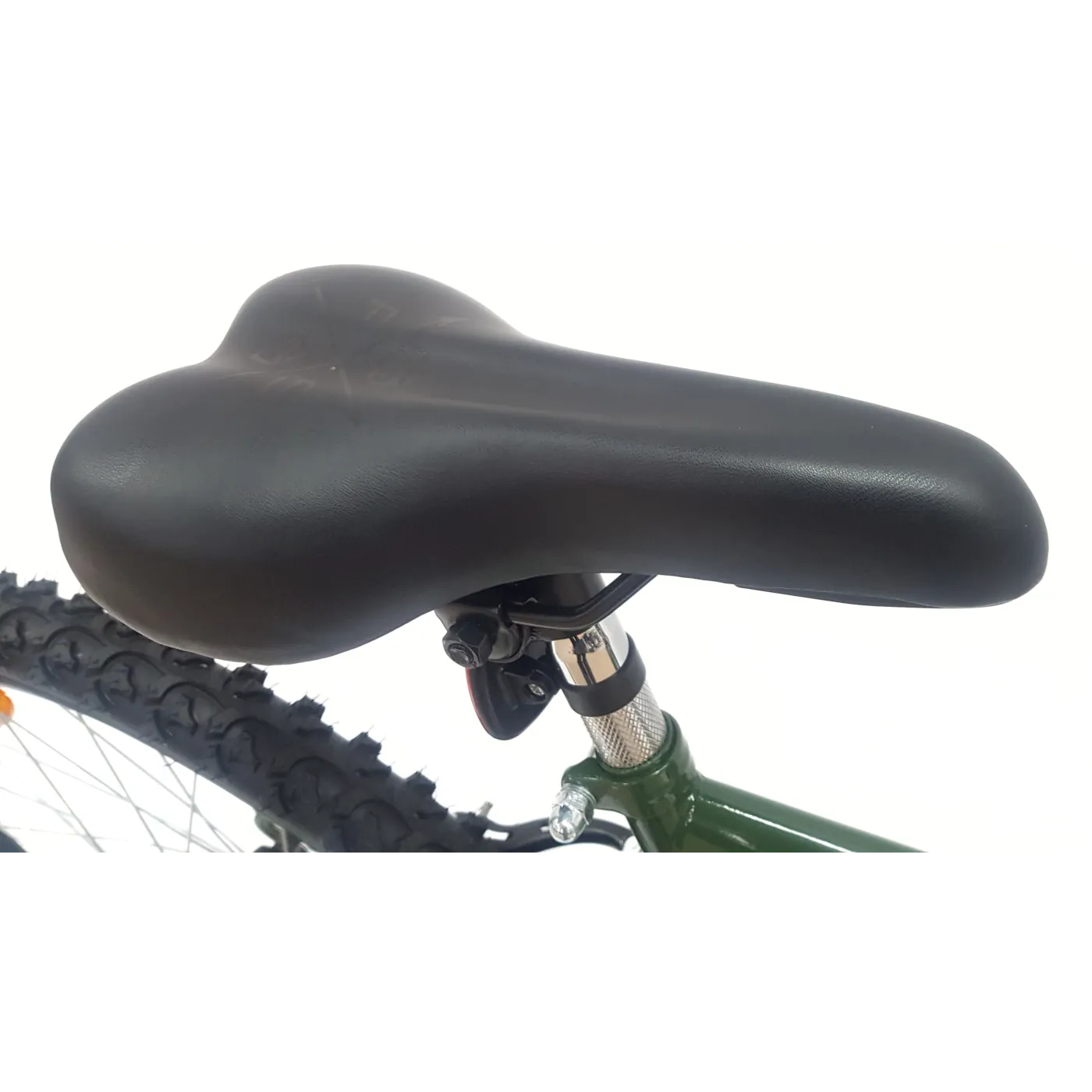 Ciemne opony i design w zielonym kolorze sprawiają, że rower przyciąga wzrok.