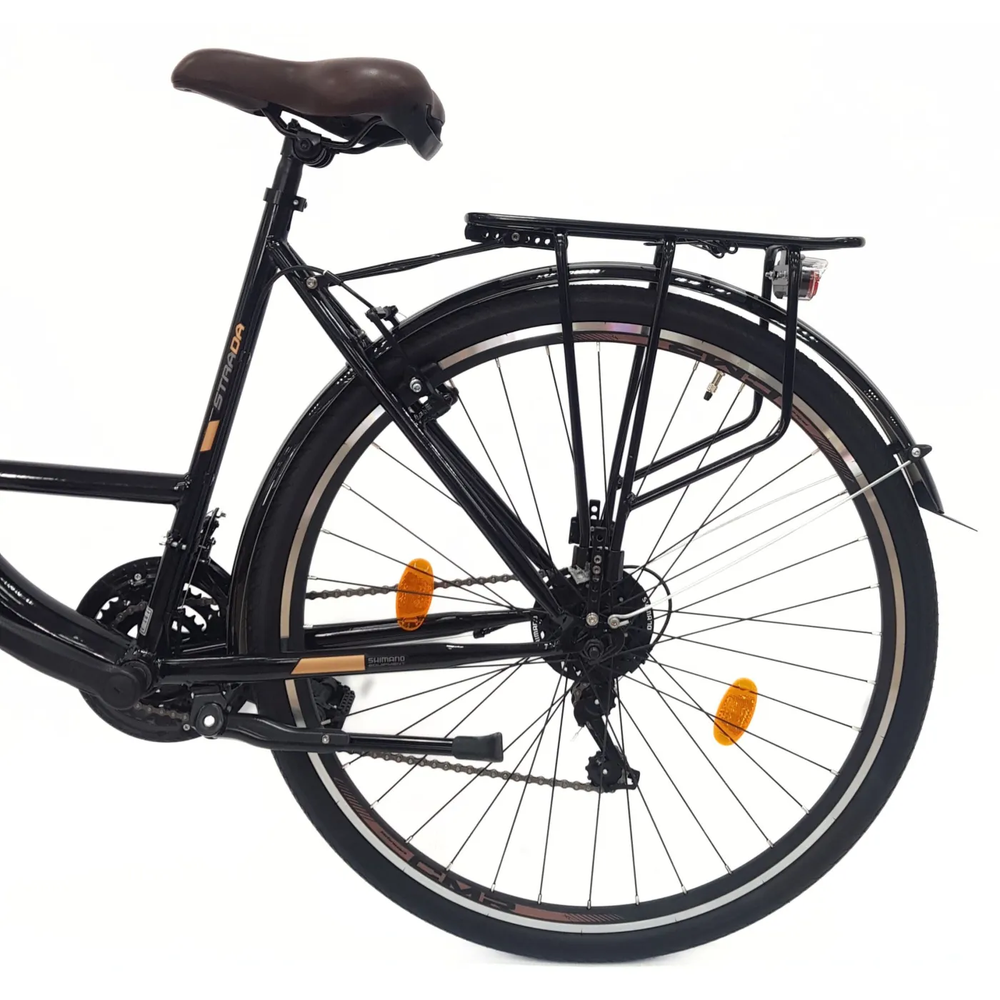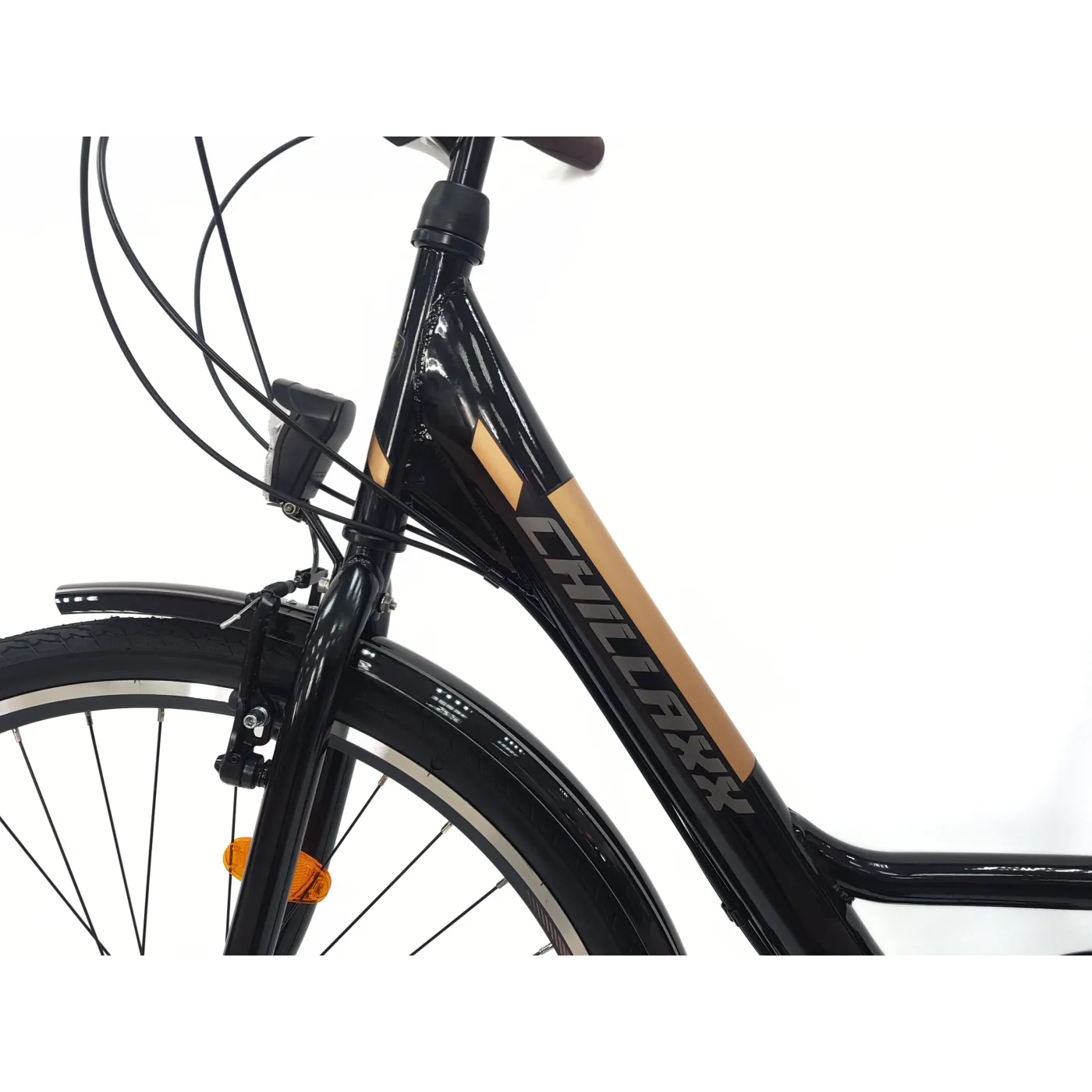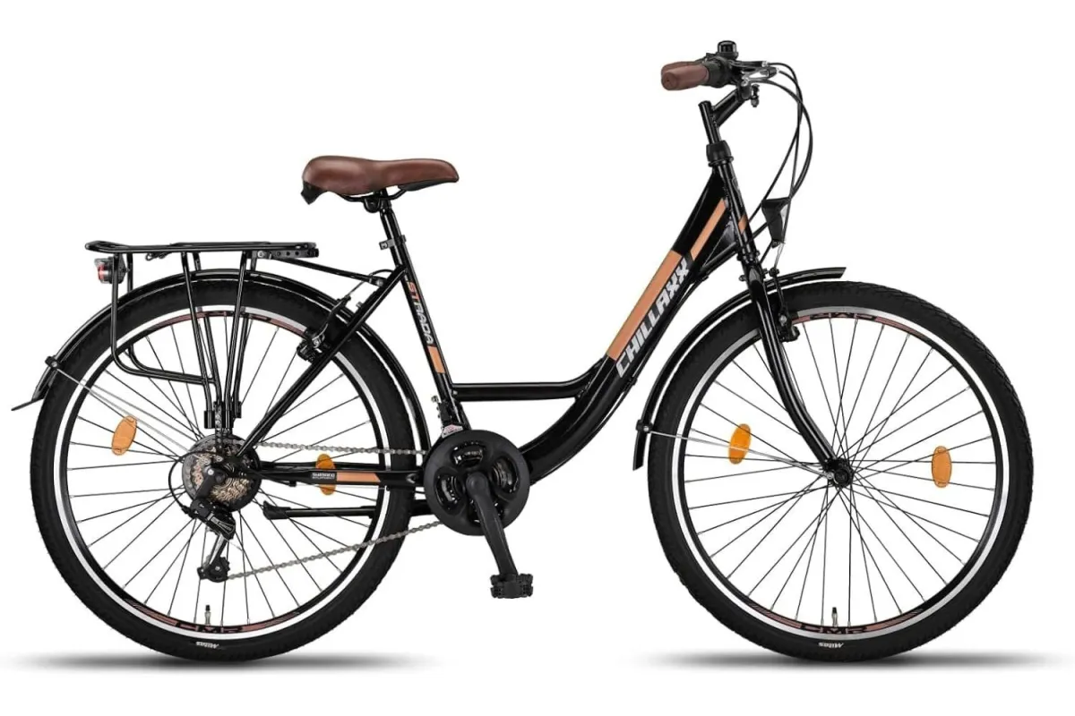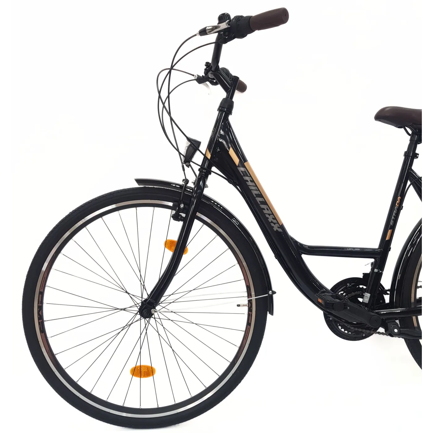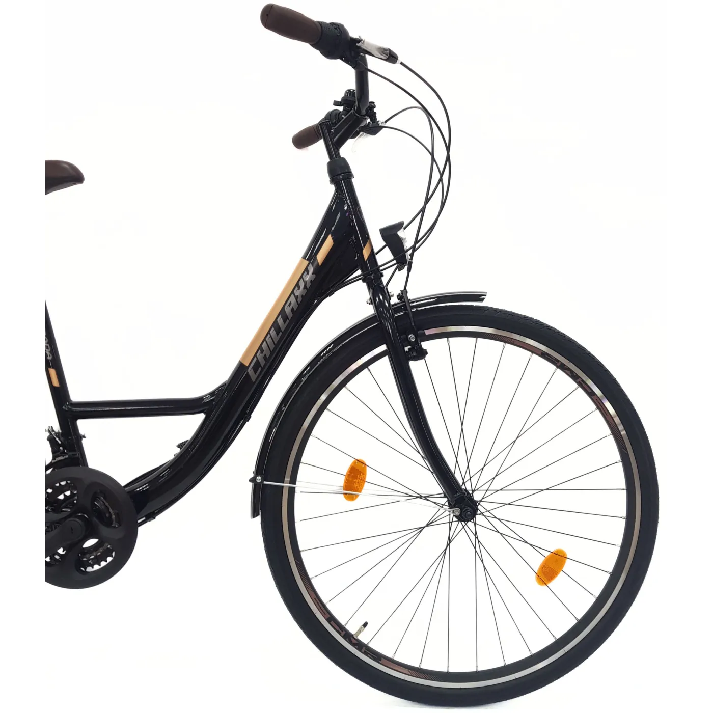 Idealnie dopracowane detale, sprawiają, że Chillaxx Bike Strada Premium to jednoślad który zauroczy wszystkich. Rower posiada hamulce V-brake, 21-biegową przerzutkę oraz wygodne siodełko. Dodatkowo, model jest wyposażony w akcesoria niezbędne do jazdy, takie jak bagażnik, błotniki, oświetlenie, dzwonek, stopka, a nawet odblaski. Całość utrzymana jest w klasycznym, czarnym kolorze z brązowymi akcentami w postaci uchwytów kierownicy i siodełka.