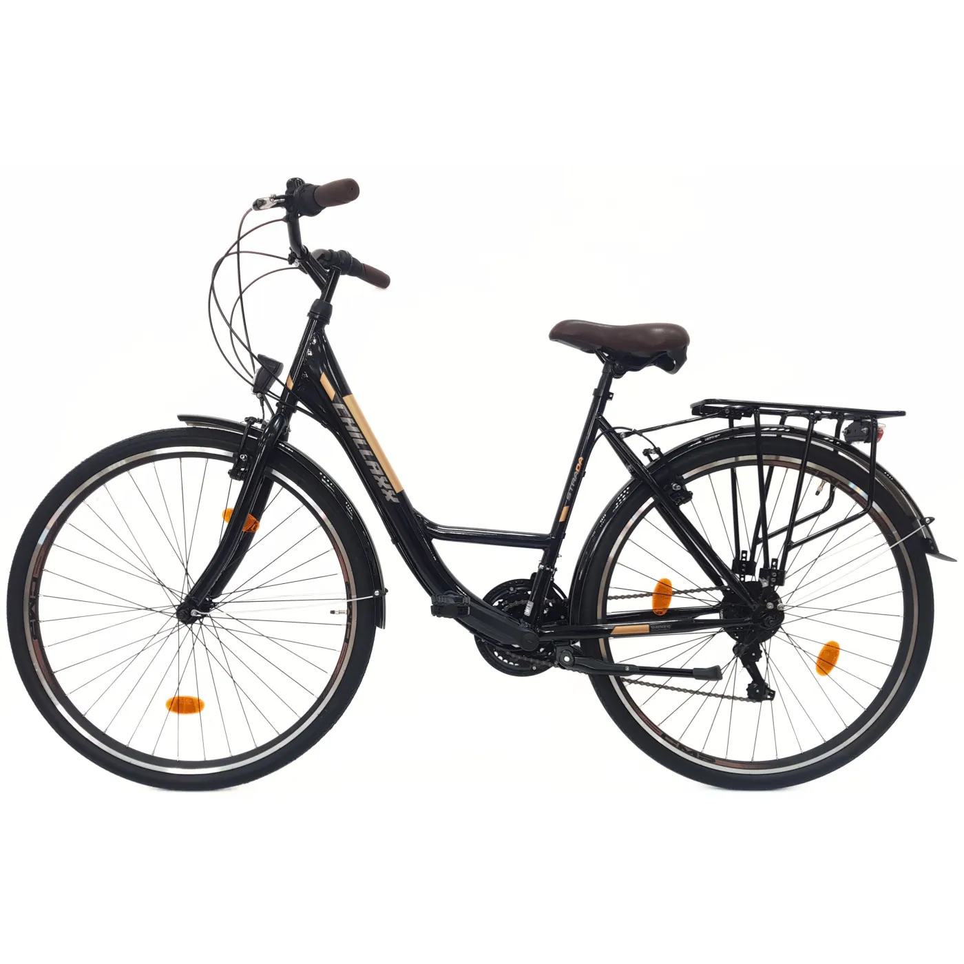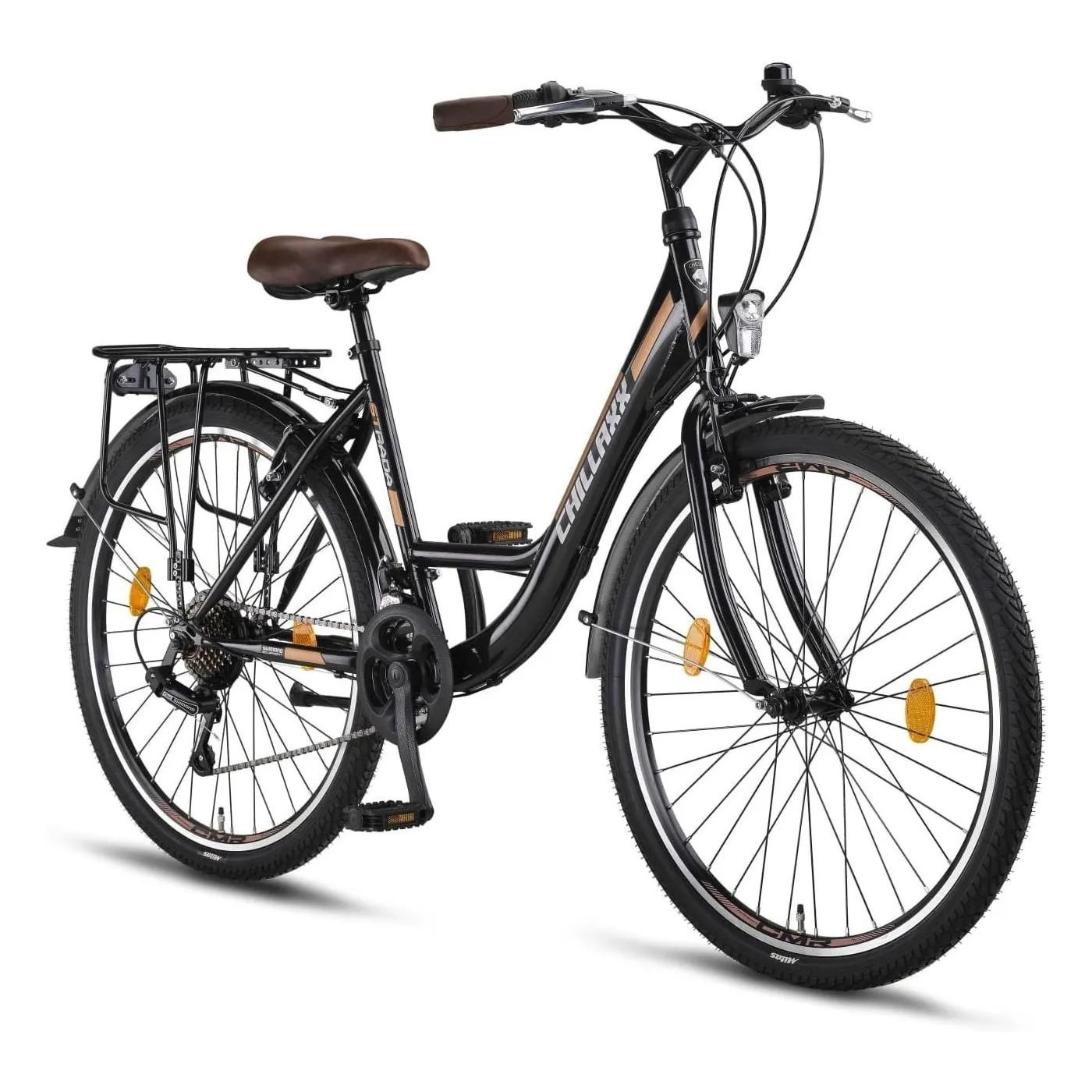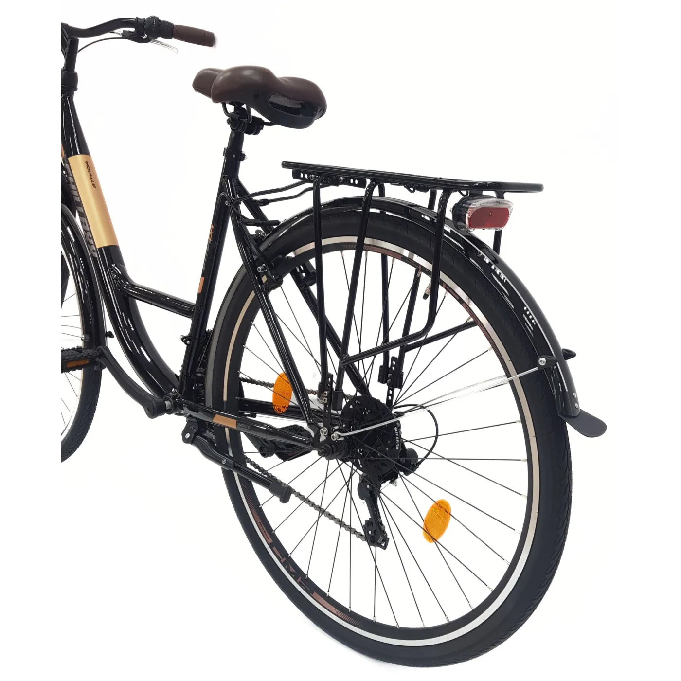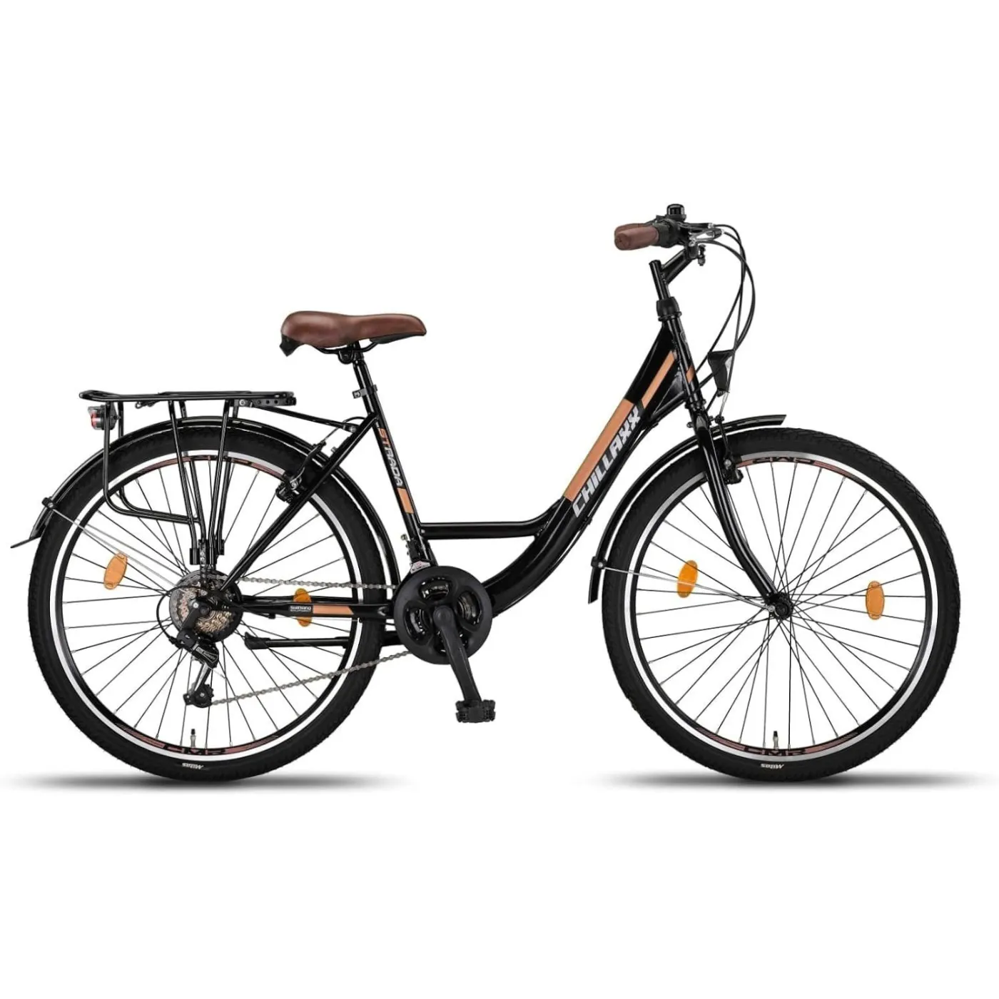 Idealnie dopracowane detale, sprawiają, że Chillaxx Bike Strada Premium to jednoślad który zauroczy wszystkich. Rower posiada hamulce V-brake, 21-biegową przerzutkę oraz wygodne siodełko. Dodatkowo, model jest wyposażony w akcesoria niezbędne do jazdy, takie jak bagażnik, błotniki, oświetlenie, dzwonek, stopka, a nawet odblaski. Całość utrzymana jest w klasycznym, czarnym kolorze z brązowymi akcentami w postaci uchwytów kierownicy i siodełka.