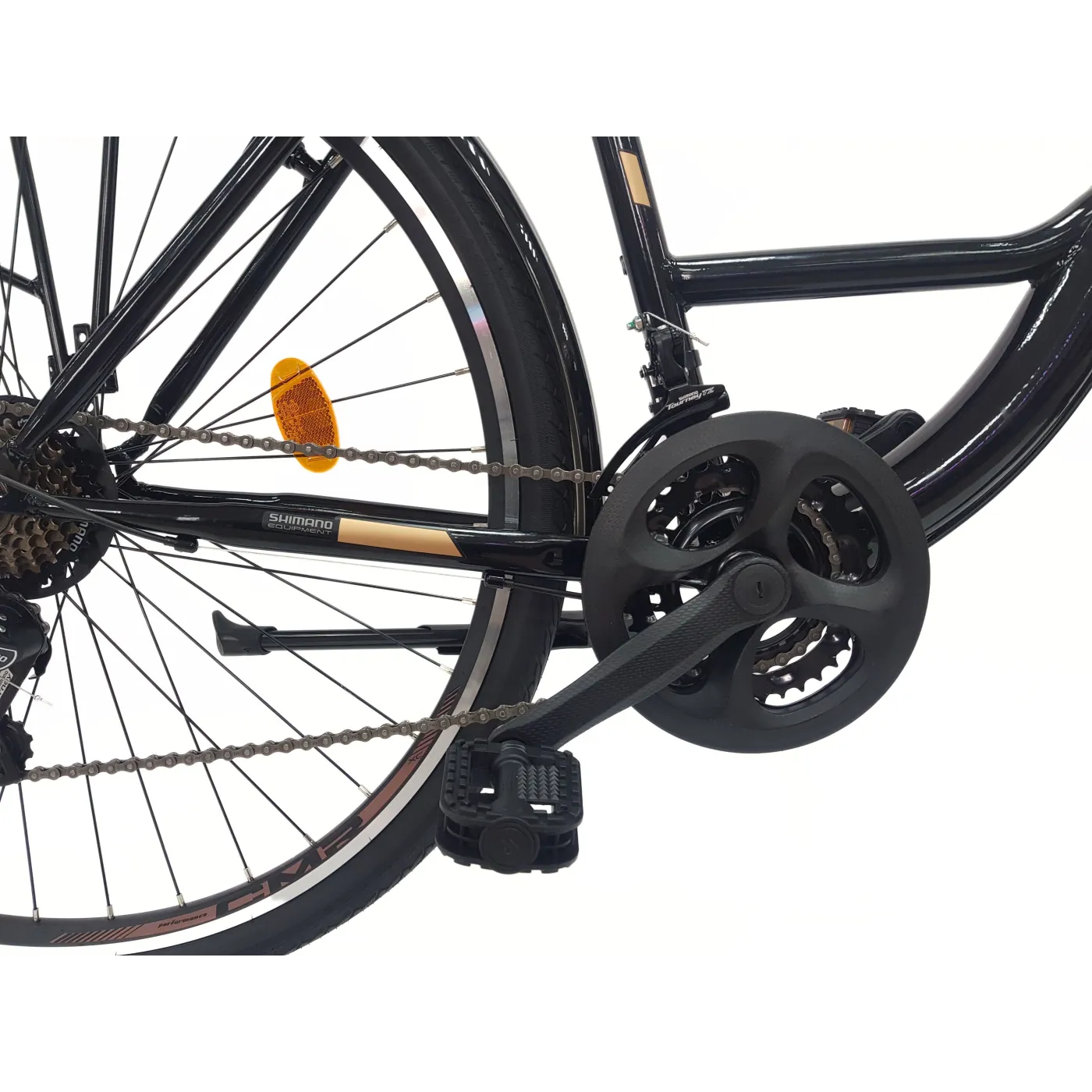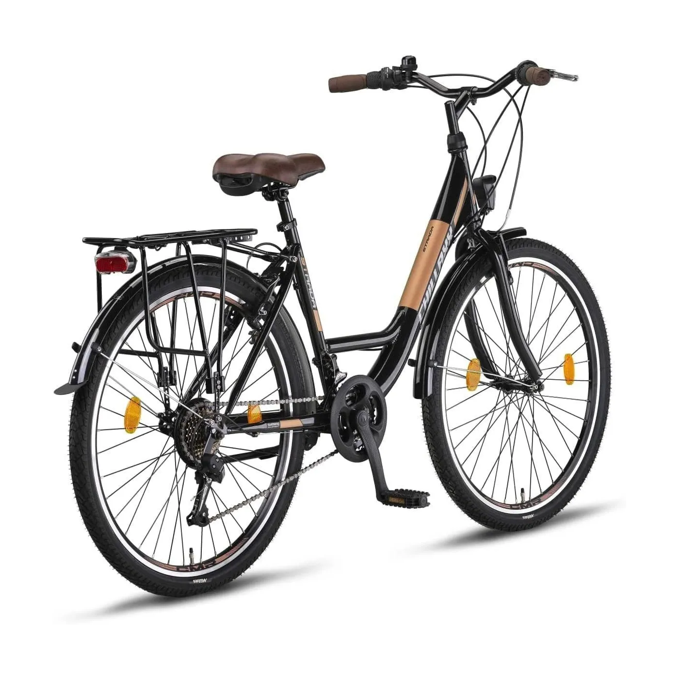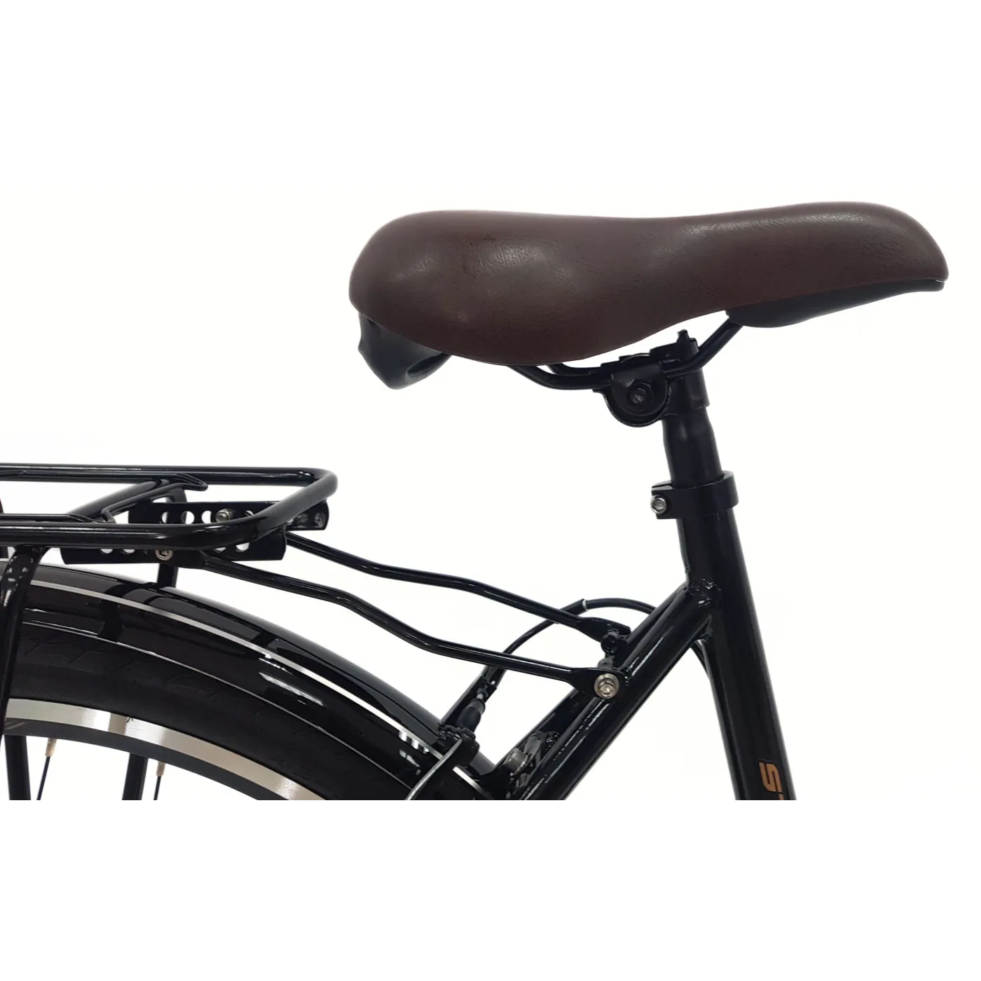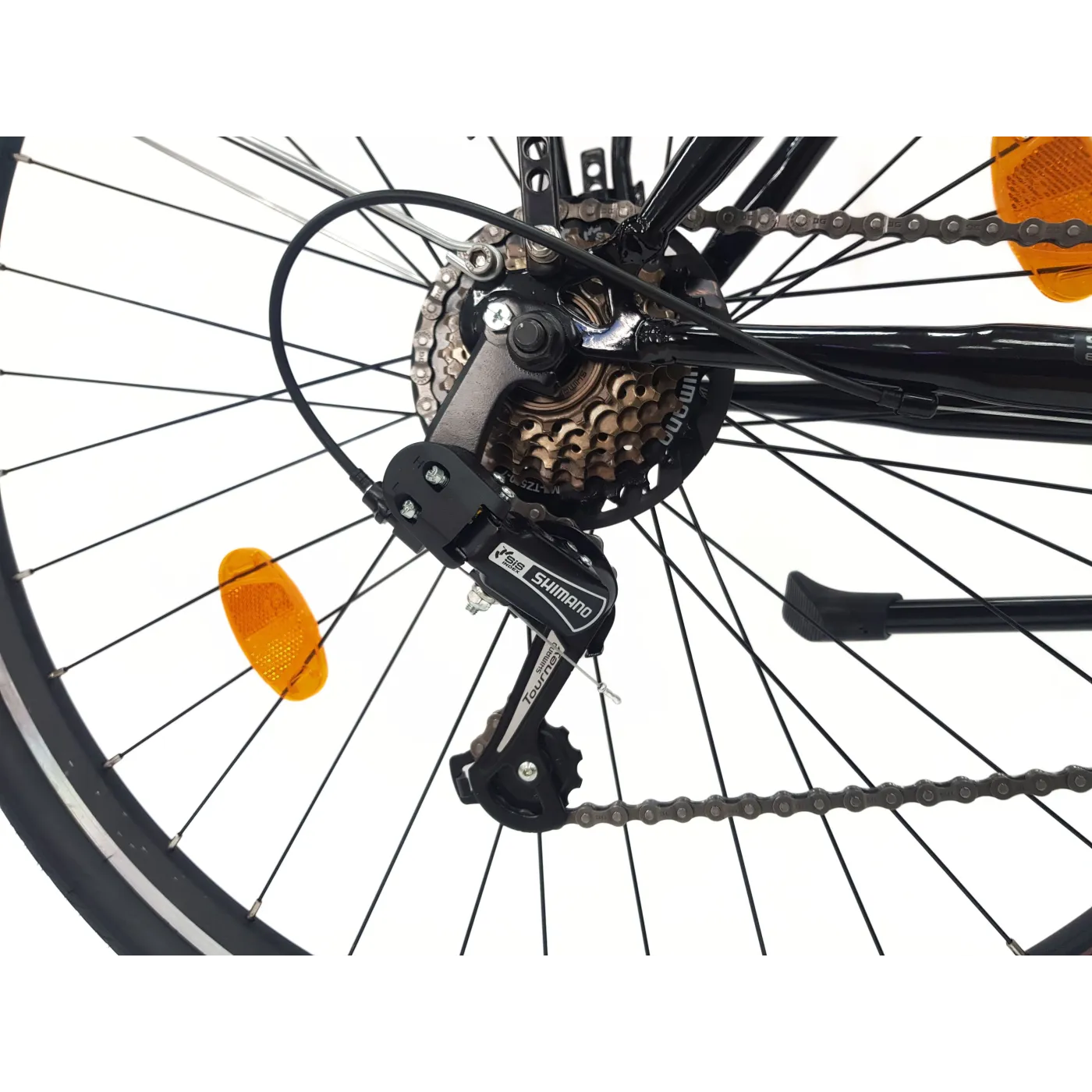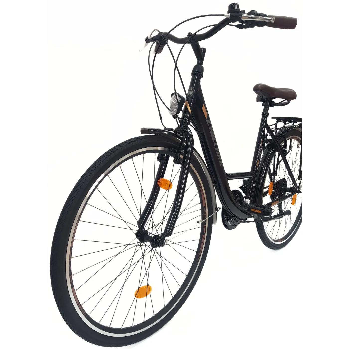 Idealnie dopracowane detale, sprawiają, że Chillaxx Bike Strada Premium to jednoślad który zauroczy wszystkich. Rower posiada hamulce V-brake, 21-biegową przerzutkę oraz wygodne siodełko. Dodatkowo, model jest wyposażony w akcesoria niezbędne do jazdy, takie jak bagażnik, błotniki, oświetlenie, dzwonek, stopka, a nawet odblaski. Całość utrzymana jest w klasycznym, czarnym kolorze z brązowymi akcentami w postaci uchwytów kierownicy i siodełka.