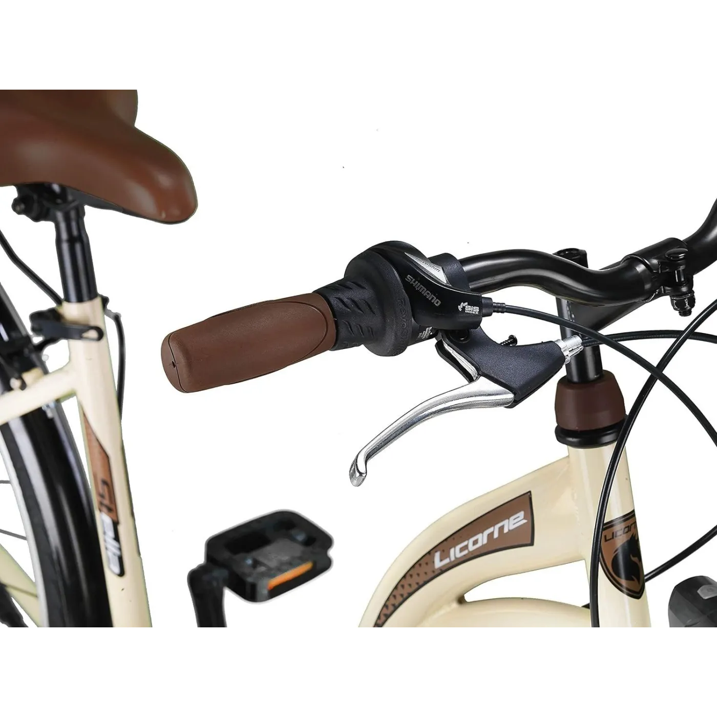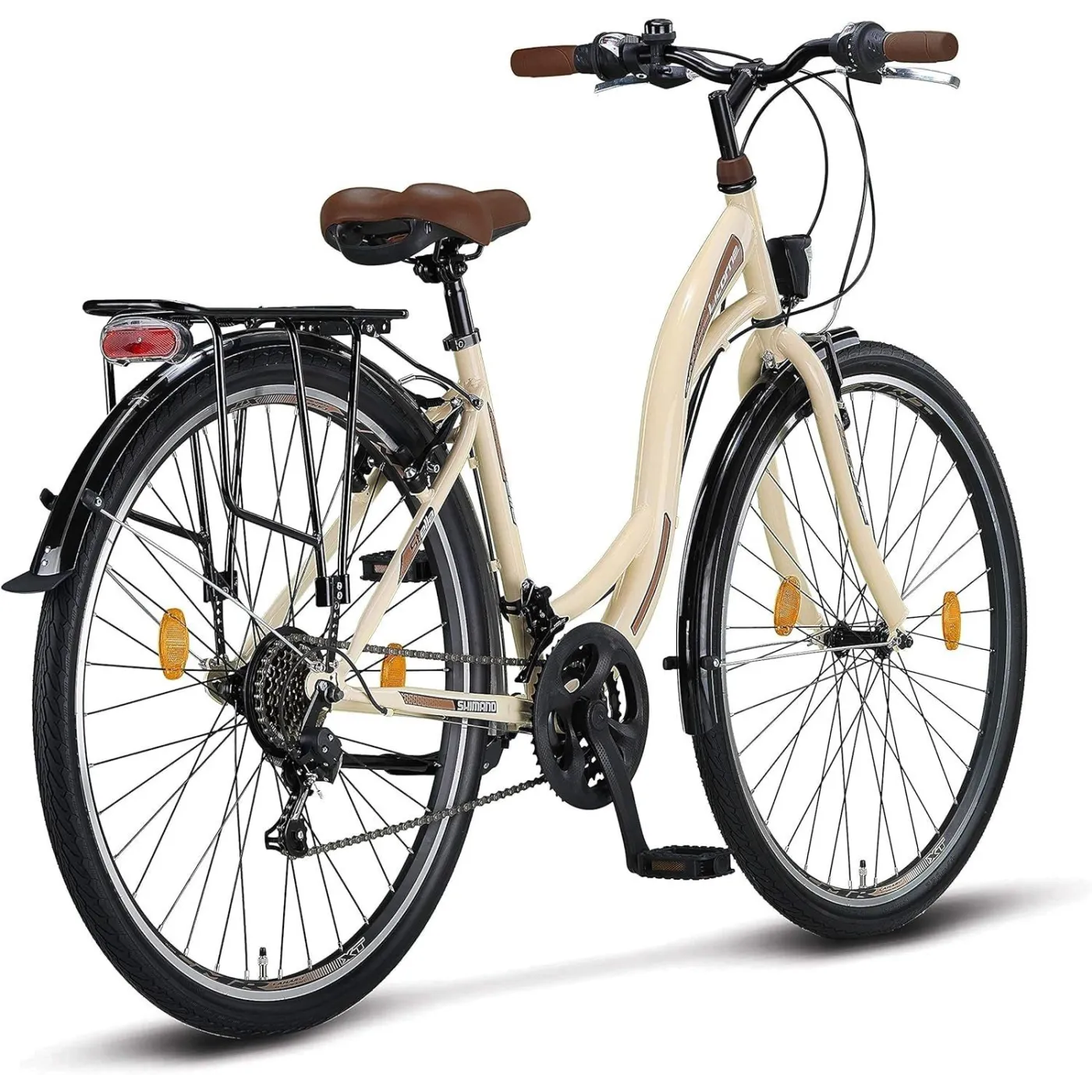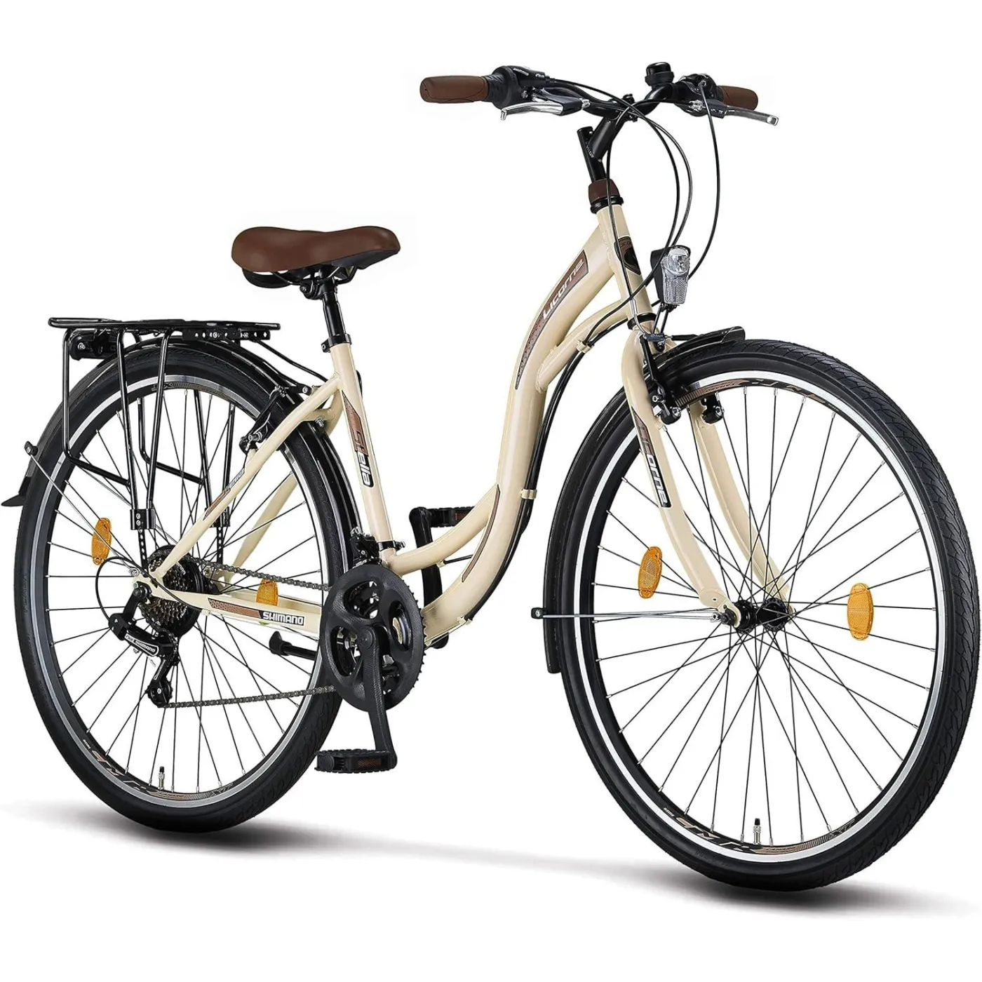 Śliczny rower miejski, w kolorze kremowym z pewnością przyciągnie wzrok niejednej mijanej osoby. Model Stella jest wyposażony w 21-biegową przerzutkę z komponentami SHIMANO, dzięki czemu jazda będzie komfortowa niezależnie od terenu. Wzniesienia już nie są żadną przeszkodą. Hamulce v-brake zamontowane z przodu i z tyłu zapewniają bezpieczeństwo podczas jazdy. Rower posiada także niezbędne akcesoria, dzięki którym możesz od razu wybrać się na przejażdżkę.