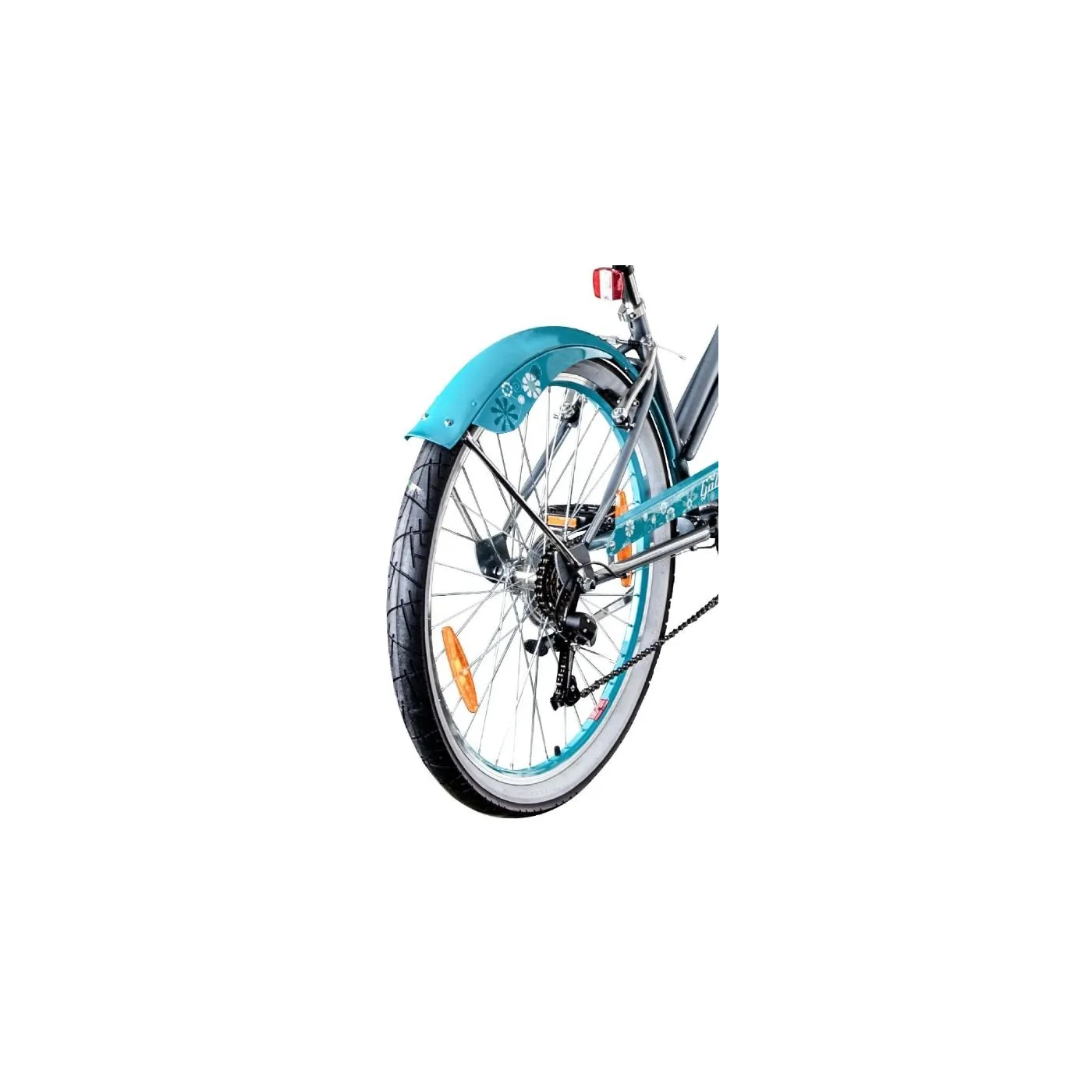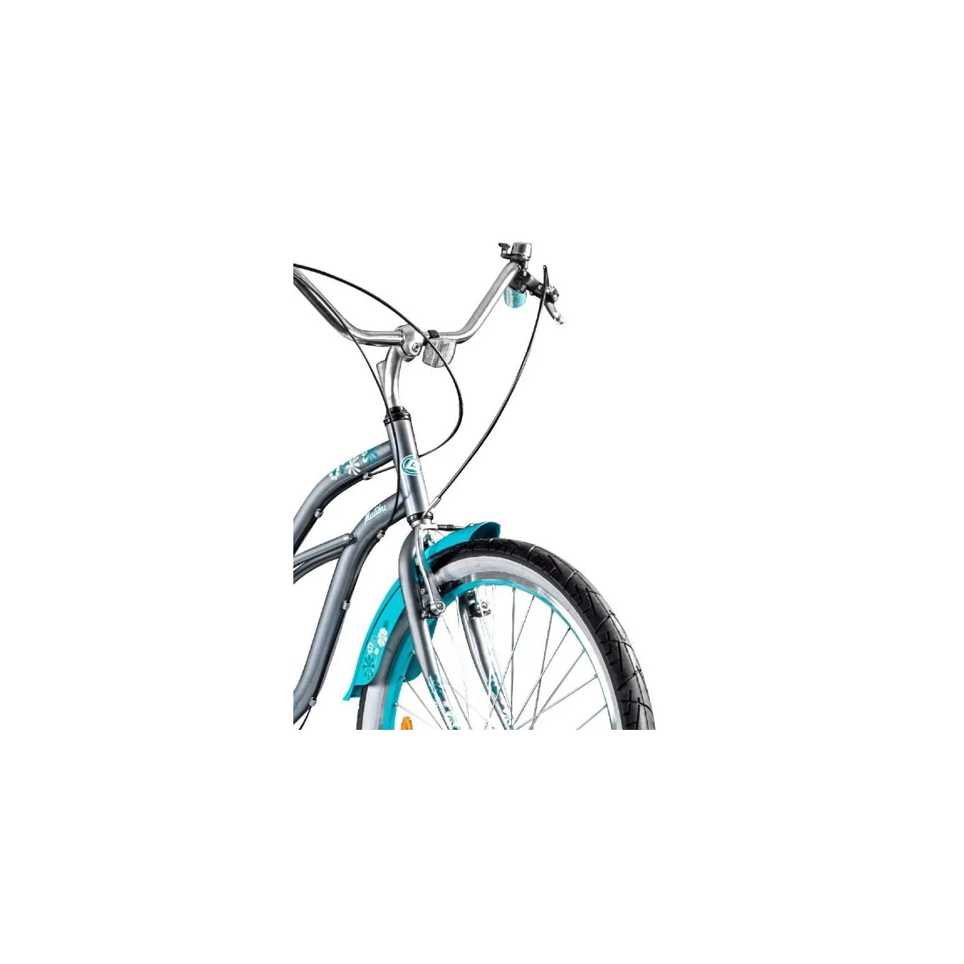 Malibu nie jest wyjątkiem. Jak na porządny rower plażowy przystało, został on wyposażony w aluminiową kierownicę typu moon o szerokości 690 mm w chromowanym wyglądzie, która ma typowy kształt. Ma również klasyczną stalową ramę o subtelnym designie w szarym kolorze. Kwiatowy wzór jest kontynuowany na osłonie łańcucha, siodełku, a nawet uchwytach.