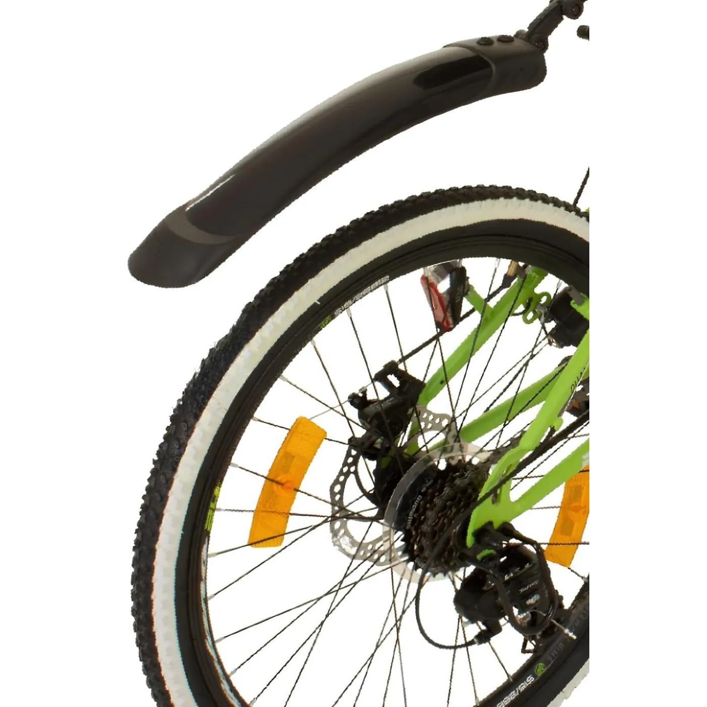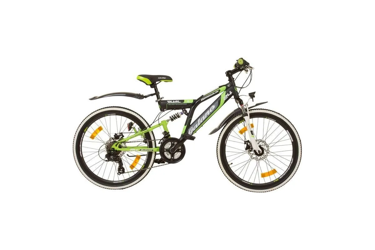 24-calowy rower górski z pełnym zawieszeniem w kolorze czarnym z zielonymi detalami, które sprawiają, że rower wyróżnia się spośród innych.