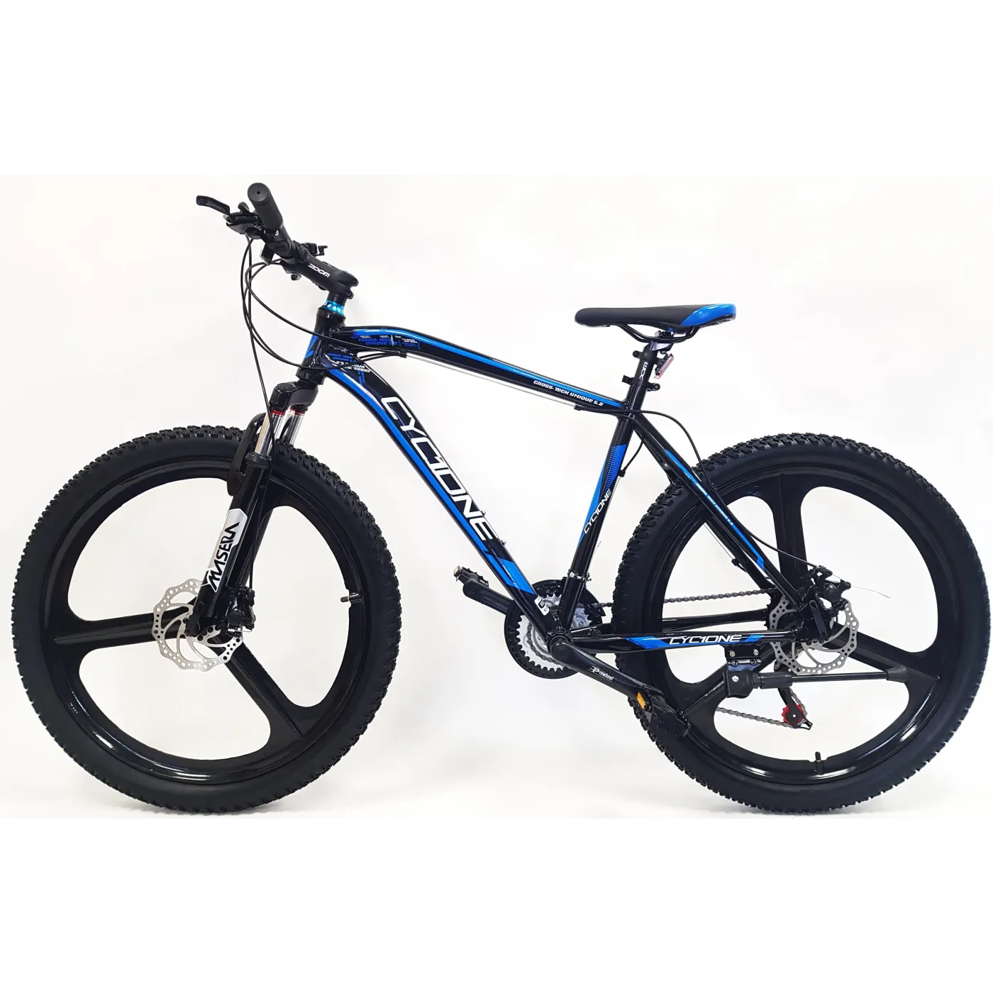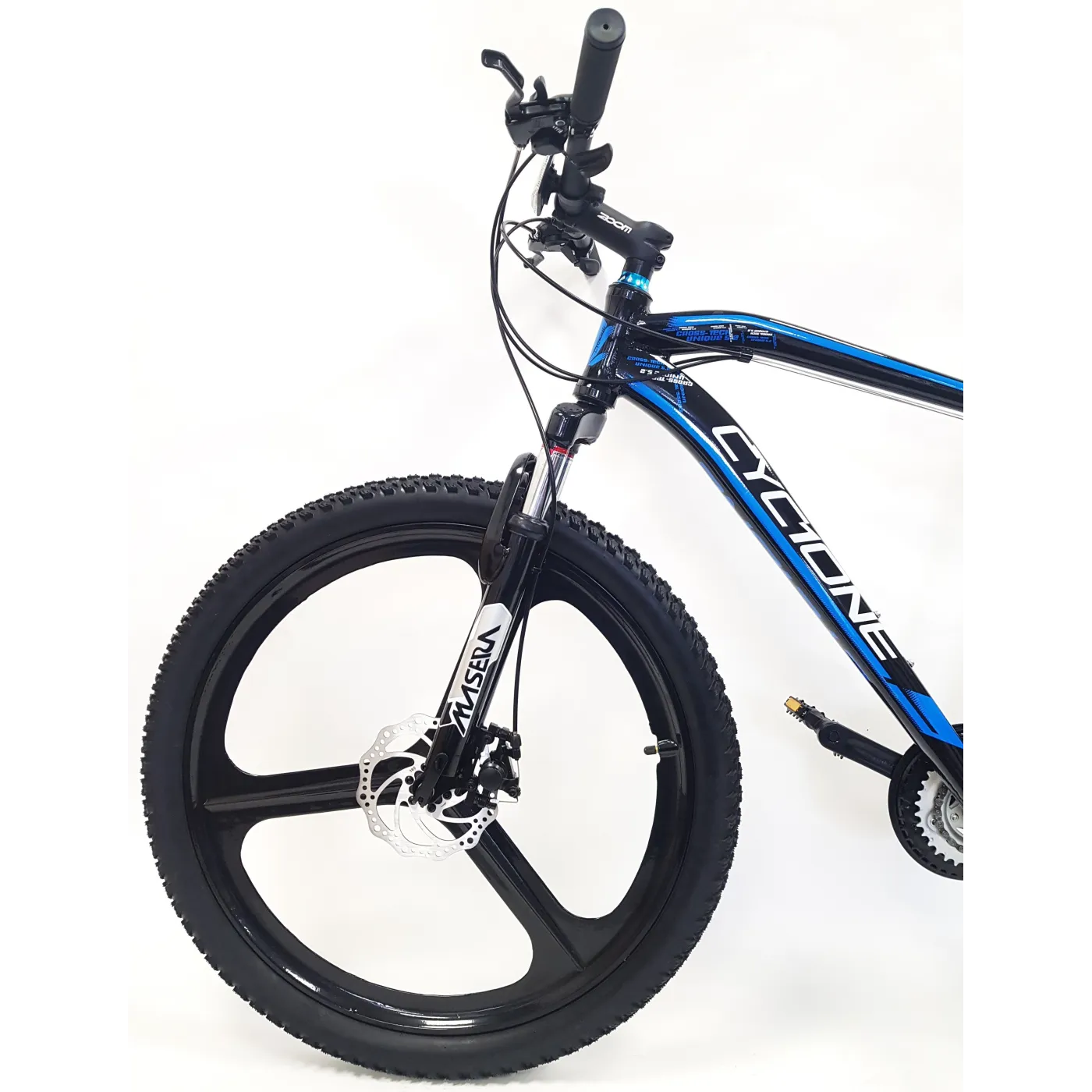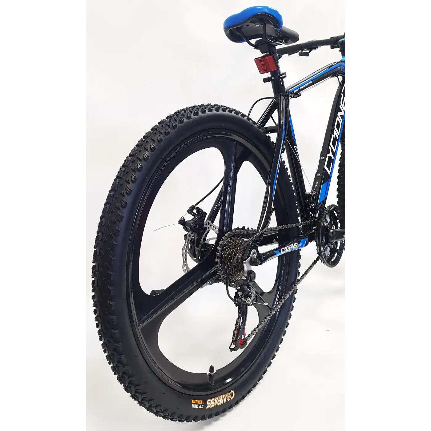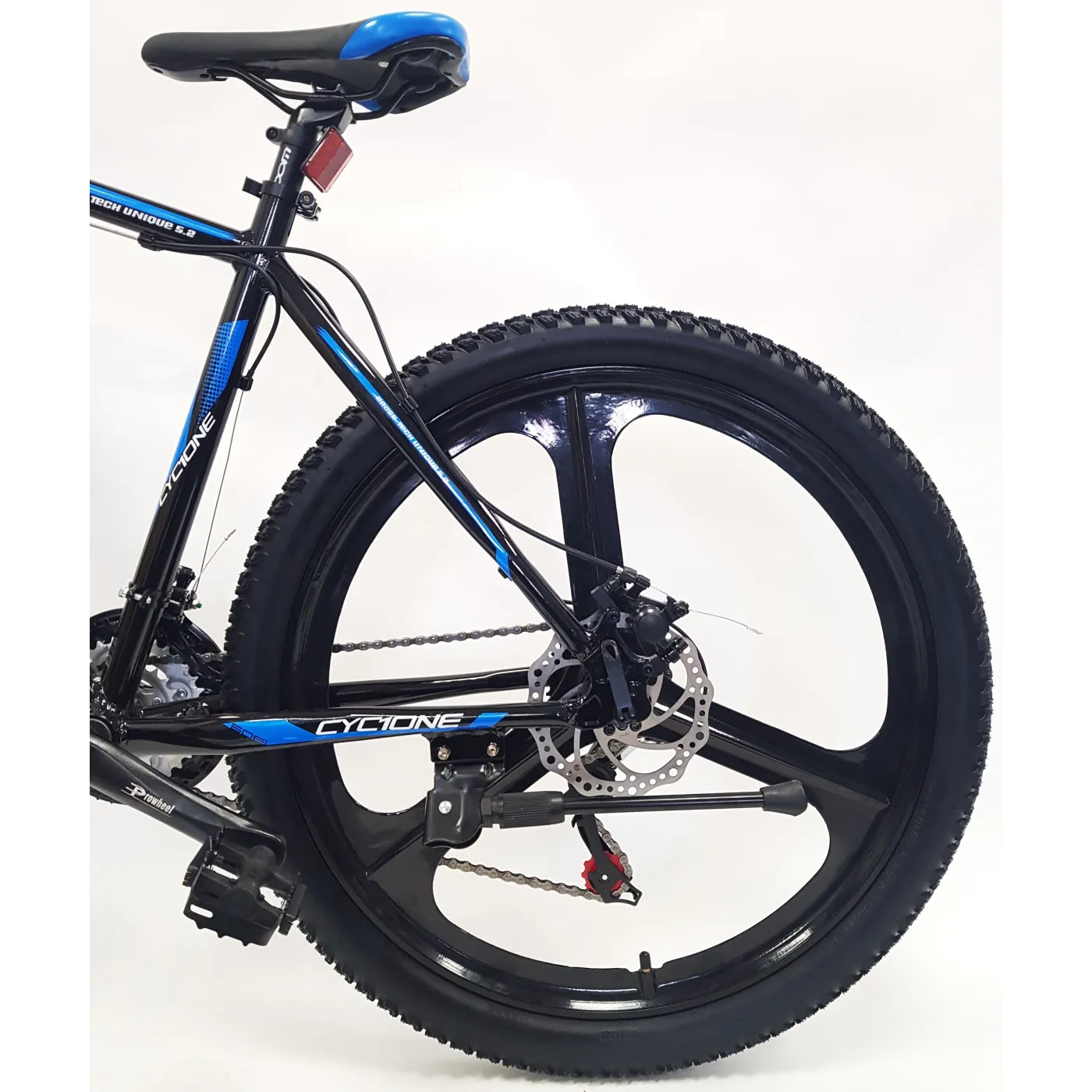 Dobrze przemyślany: 26" hardtail MTB Cross-Tech Unique 5.2 od CYC1ONE. Rower jest całości w kolorze czarnym - odświeżony niebiesko-białymi detalami, które przyciągają uwagę.