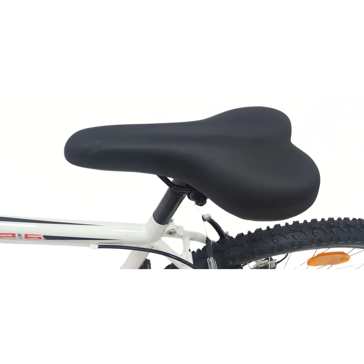 Podstawą jest solidna stalowa rama, która dzięki swojej geometrii i sztywności skrętnej zapewnia przyjemną i bezpieczną jazdę. W podwoziu znajduje się amortyzowany widelec o skoku zawieszenia 100 mm, który pochłania wstrząsy z podłoża na nierównych drogach. Dzięki kierownicy o szerokości 600 mm masz rower pod kontrolą.