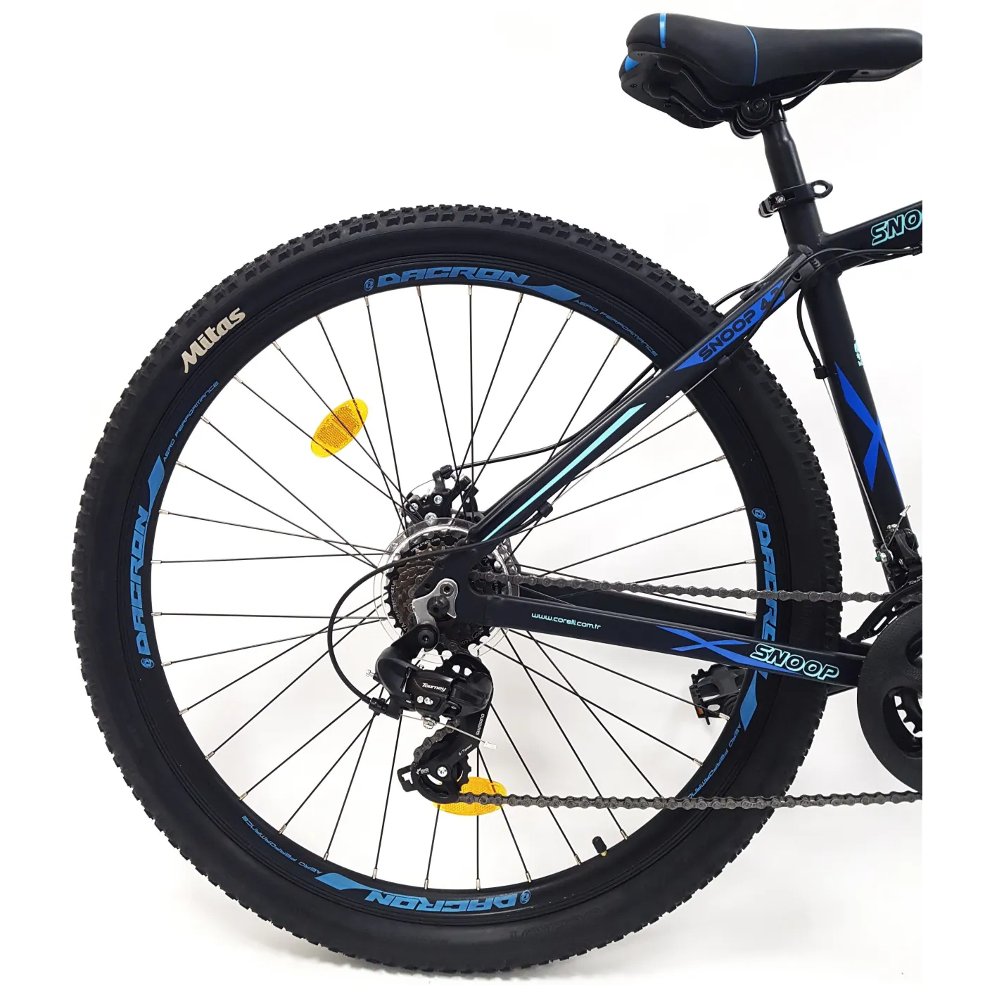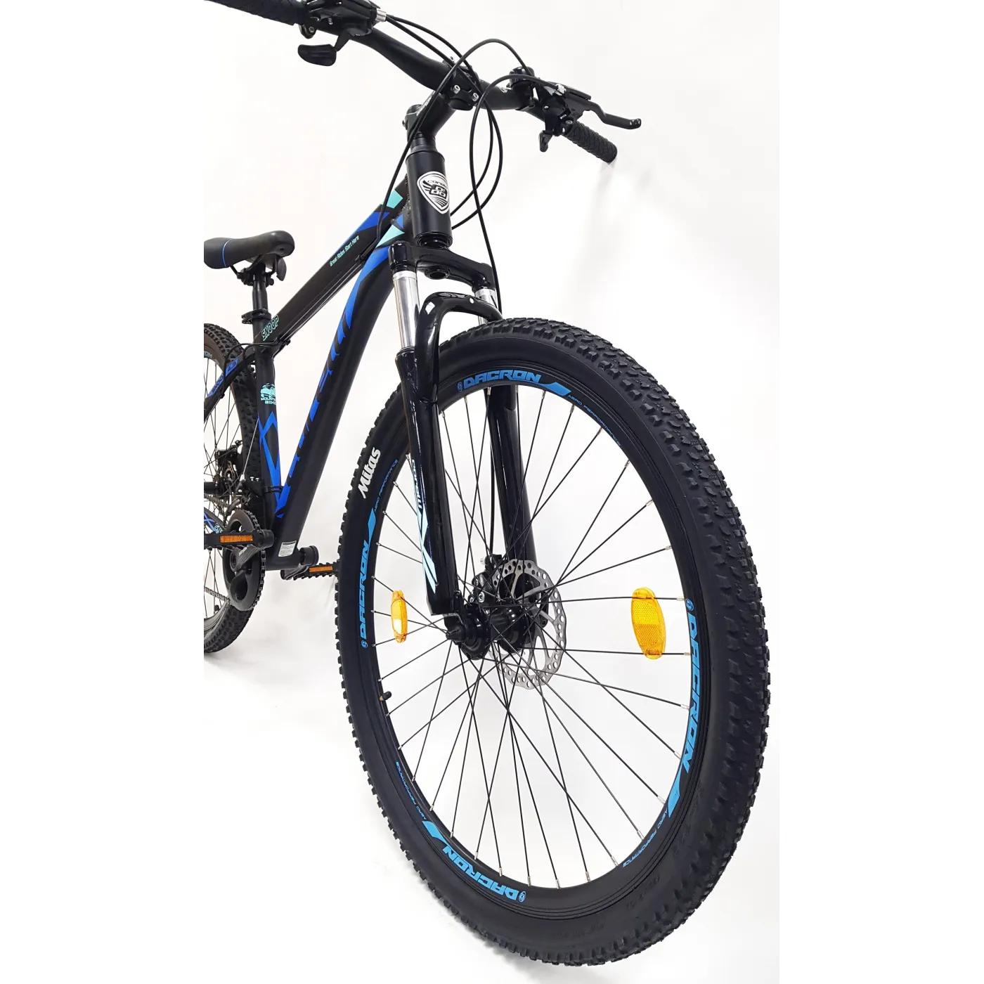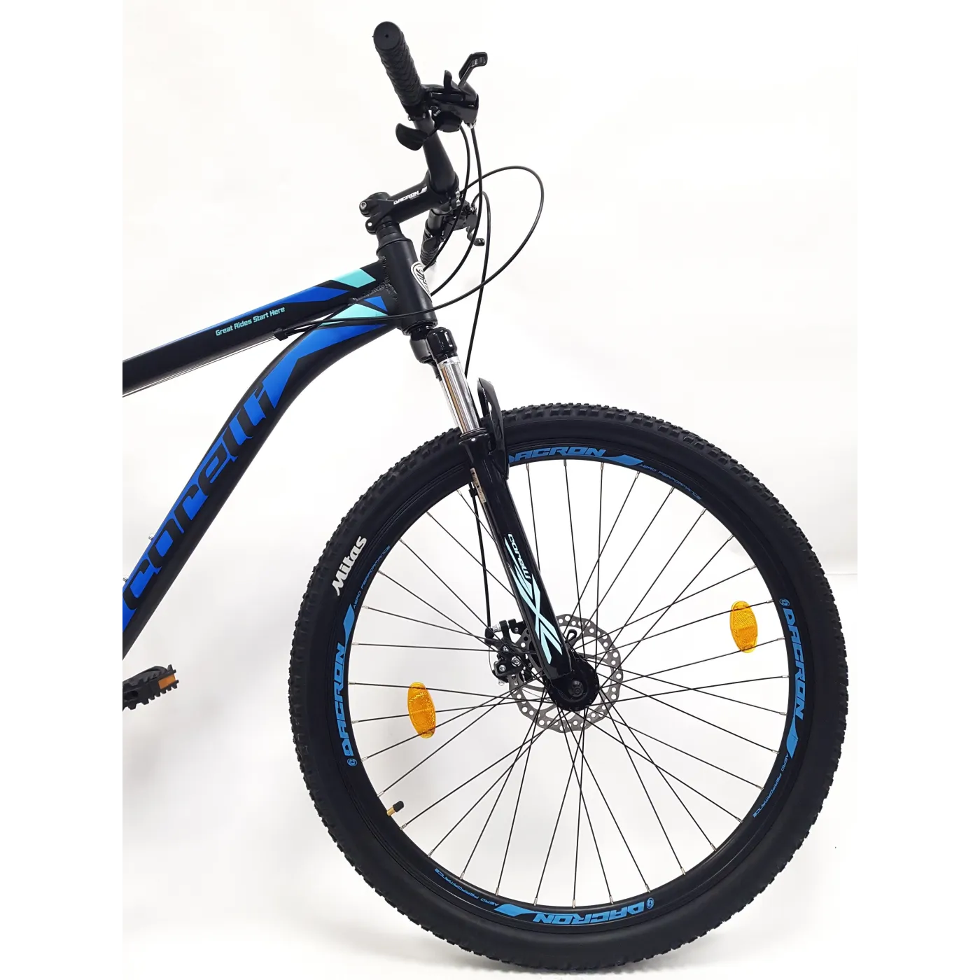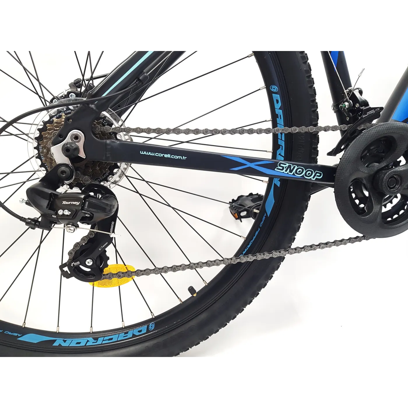 Aluminiowy hardtail MTB firmy Corelli w eleganckiej matowej czerni z niebieskimi elementami, absolutnie przyciąga wzrok.