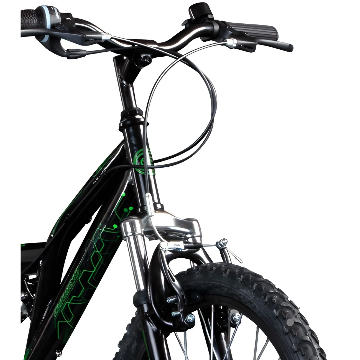 Dobrze wyważona stalowa rama posiada element sprężynujący, który wraz z amortyzowanym widelcem dba o wyrównanie wszelkich nierówności podłoża. Napęd posiada jednoczęściową korbę połączoną z 6-biegową kasetą. Oznacza to, że młody rowerzysta ma do dyspozycji 6 biegów i może naprawdę nabrać dużej prędkości! Zmiana przełożeń odbywa się za pomocą przełącznika z uchwytem obrotowym.
