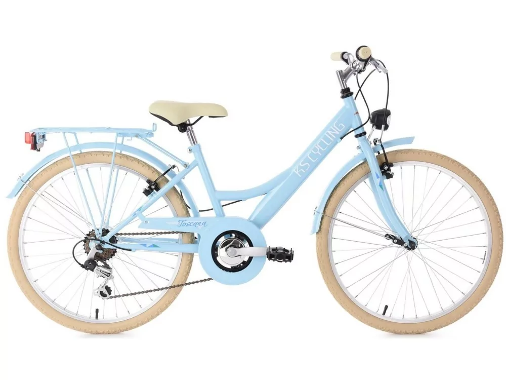 Rower dziecięcy 24" łączy ramę w modnym niebieskim kolorze z uchwytami, oponami i siodełkiem w kolorze kremowym. Toscana z pewnością zachwyci najmłodszych. Miejski rower jest wyposażony w akcesoria, takie jak oświetlenie, bagażnik, błotniki, odblaski czy osłona łańcucha, zapewniające komfort i bezpieczeństwo jazdy.