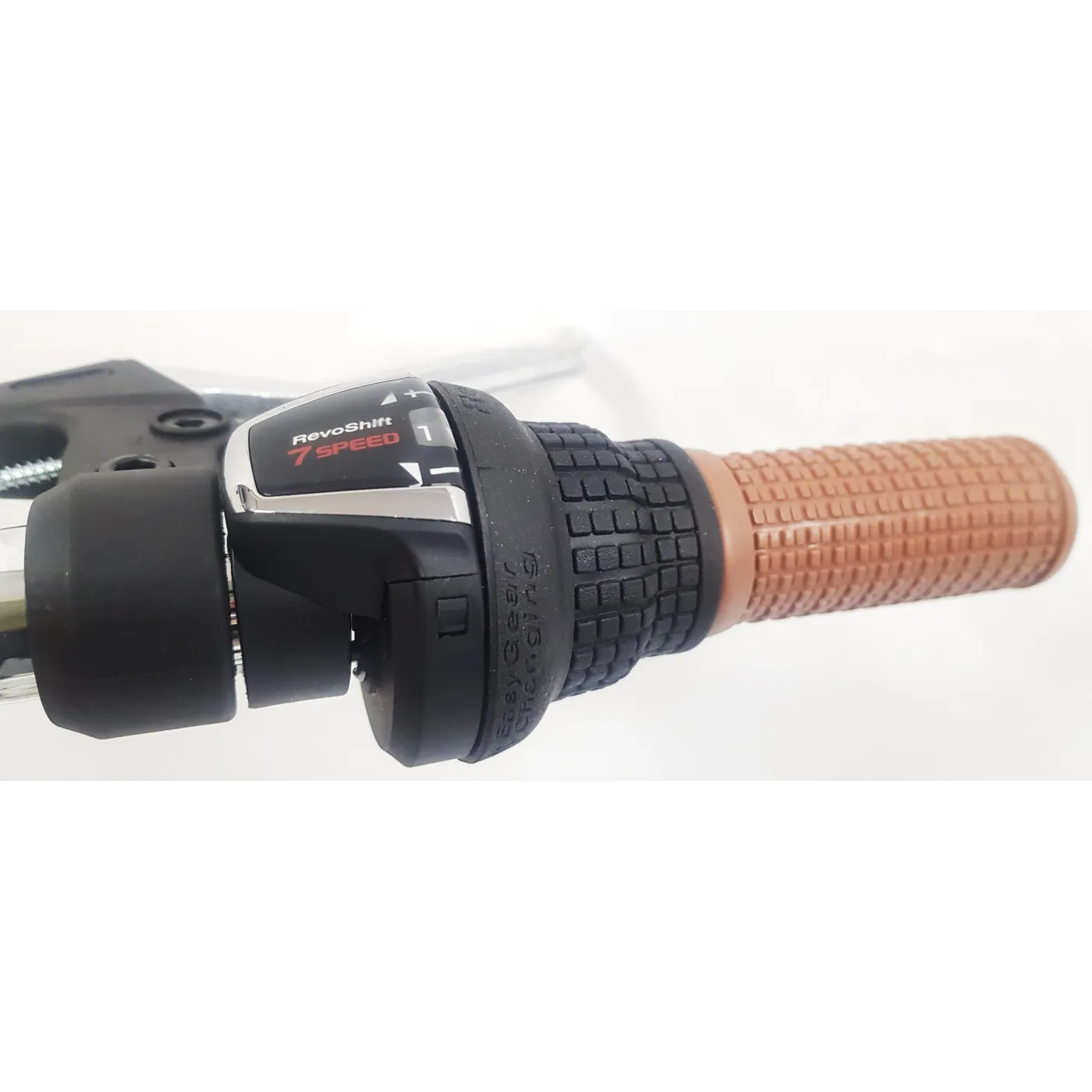 👉 Ten stylowy rower wyposażony jest w hamulce szczękowe v-brake z przodu i tarczowe z tyłu, co gwarantuje maksymalną skuteczność hamowania. Dzięki 7-biegowej przerzutce Shimano Tourney oraz manetce obrotowej Shimano RevoShift, jazda staje się łatwa i przyjemna bez względu na warunki drogowe.