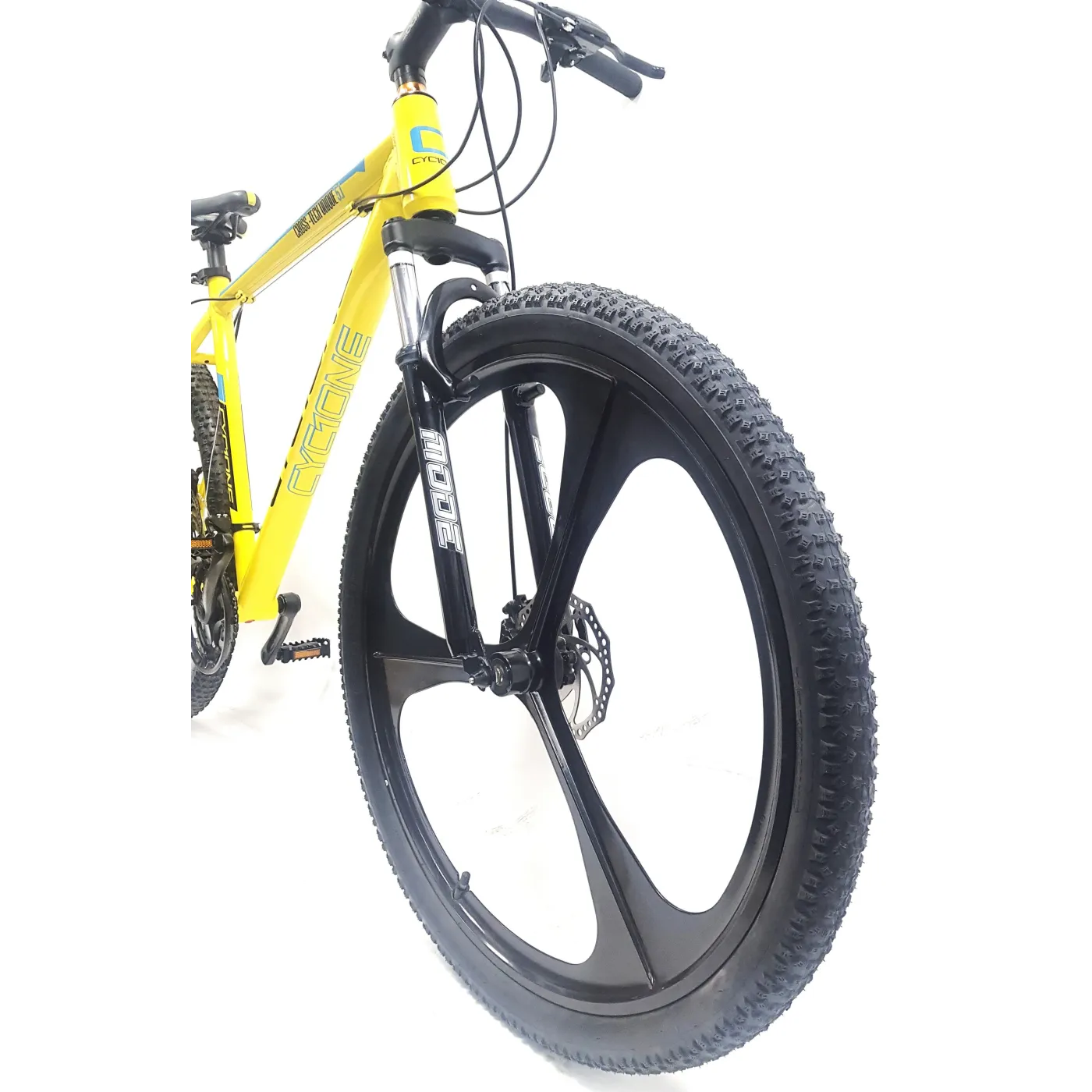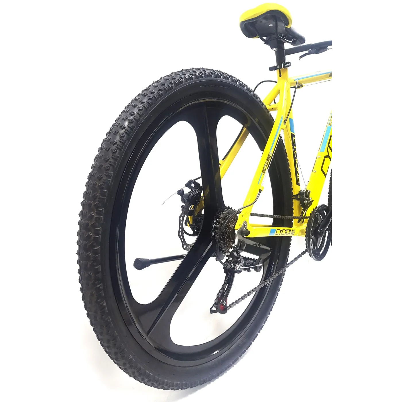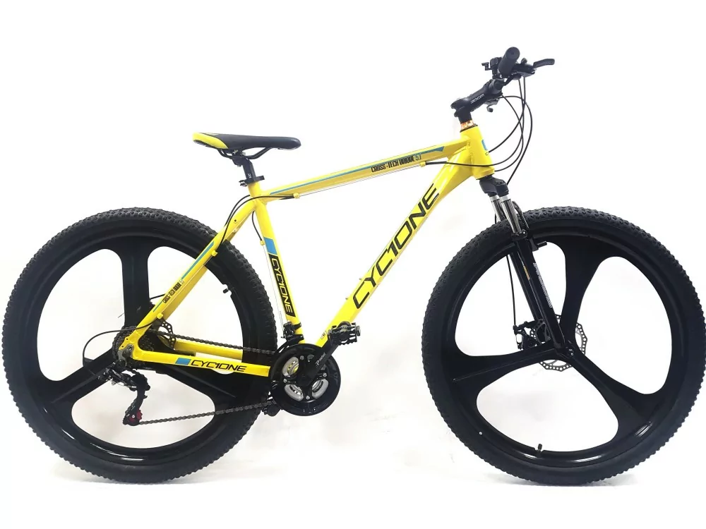 ✔️ Opony 29" x 2,10" zapewniają dobrą przyczepność i stabilność na trudnym terenie. Całość utrzymana jest w żółtym kolorze z czarno-niebieskimi akcentami, co nadaje rowerowi sportowego charakteru.