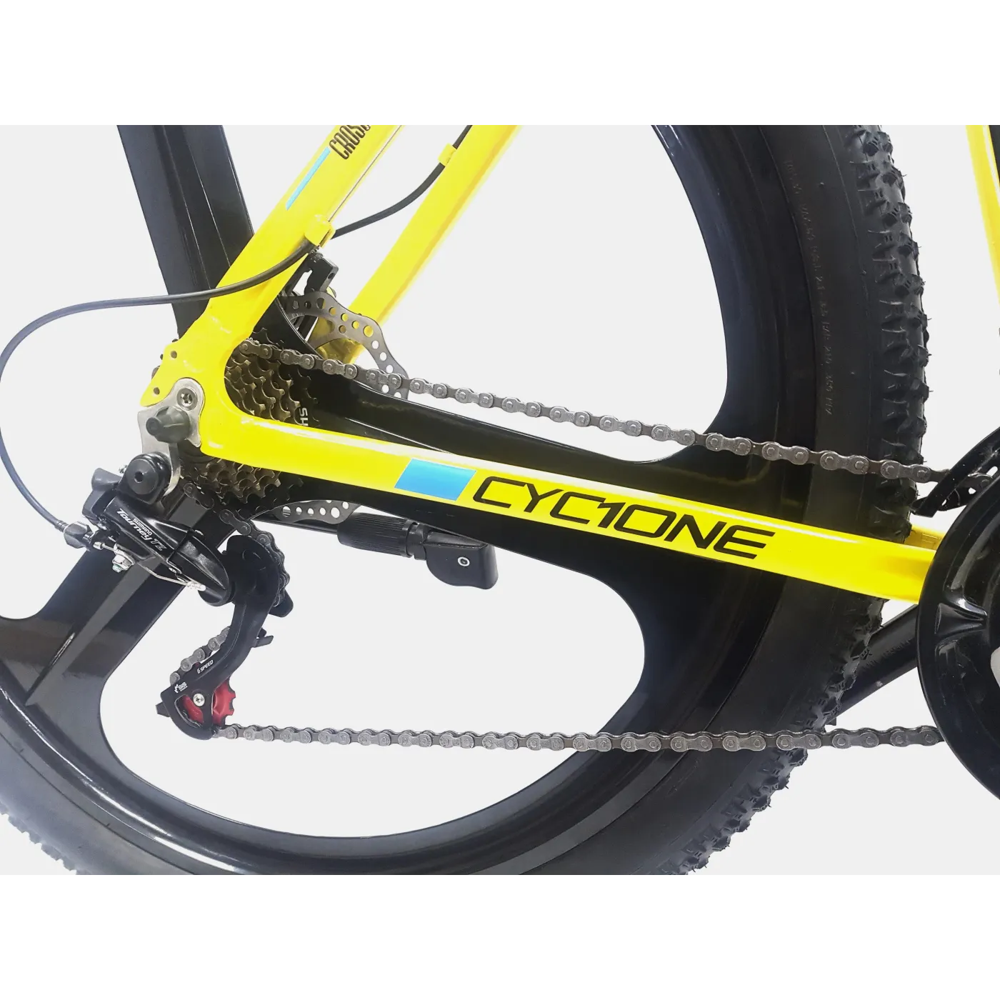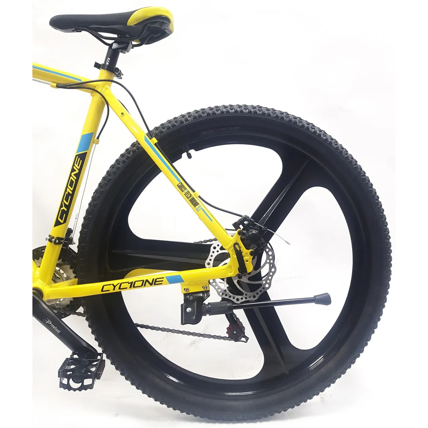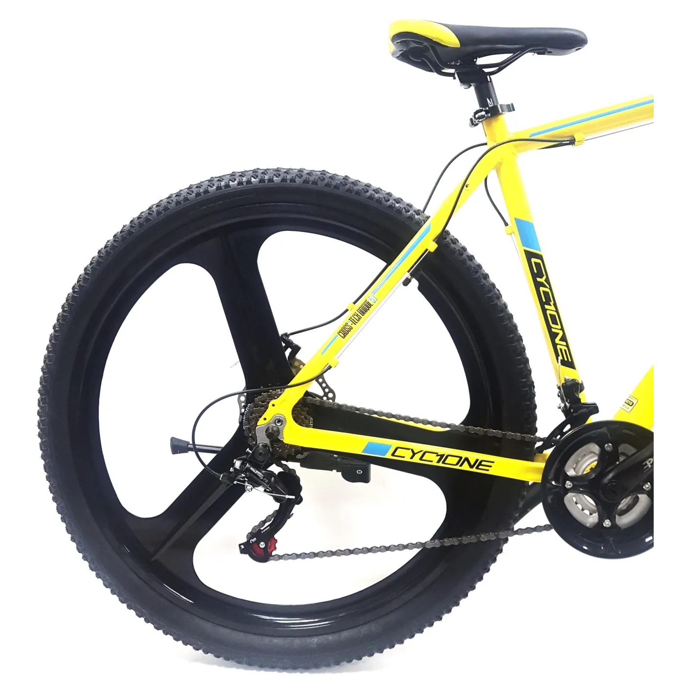 ✔️ Opony 29" x 2,10" zapewniają dobrą przyczepność i stabilność na trudnym terenie. Całość utrzymana jest w żółtym kolorze z czarno-niebieskimi akcentami, co nadaje rowerowi sportowego charakteru.