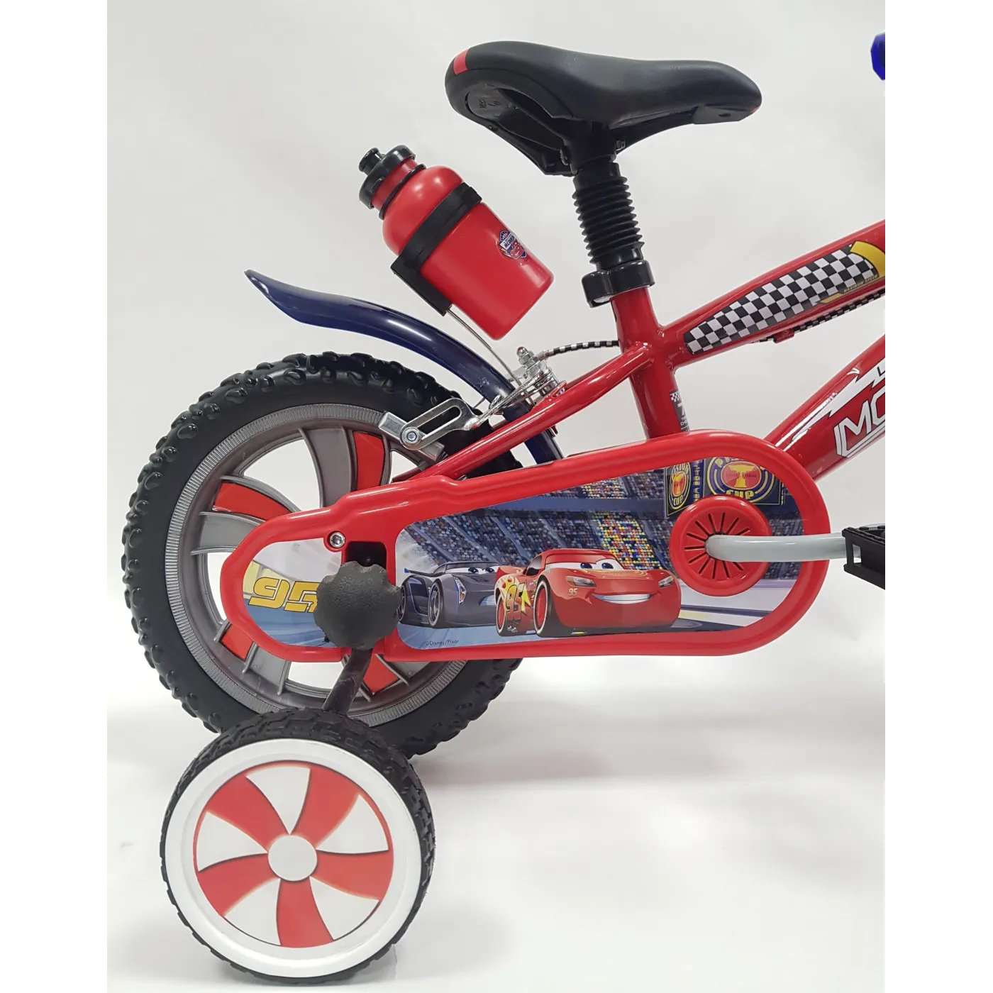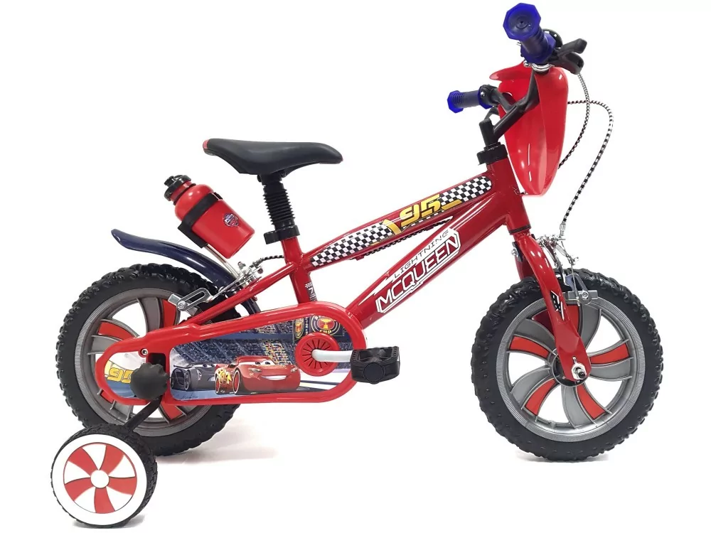 ⚡ Rower dziecięcy Cars 12" to wysokiej jakości rower dla najmłodszych sportowców. Motywy popularnego filmu animowanego "Auta" z głównym bohaterem Zygzakiem McQueenem na czele z pewnością zachwycą Twoją pociechę. Rower posiada wytrzymałą ramę stalową i bogate wyposażenie funkcjonalne i ochronne. Są to m.in. błotnik, dzwonek, bidon z bezpiecznych materiałów wraz z uchwytem i miękkie siodełko. Bezpieczeństwo zapewnia para niezawodnych hamulców szczękowych, głośny dzwonek i osłona łańcucha. Ciekawym elementem designu jest tabliczka czołowa, na której oczywiście nie mogło zabraknąć elementów ozdobnych.