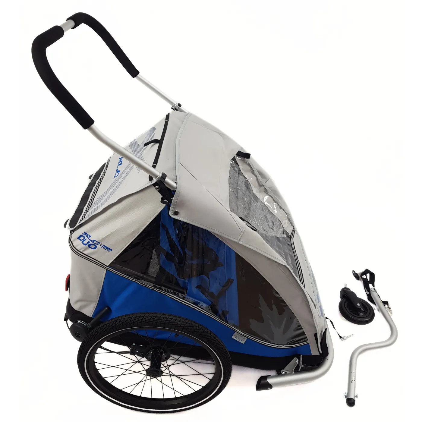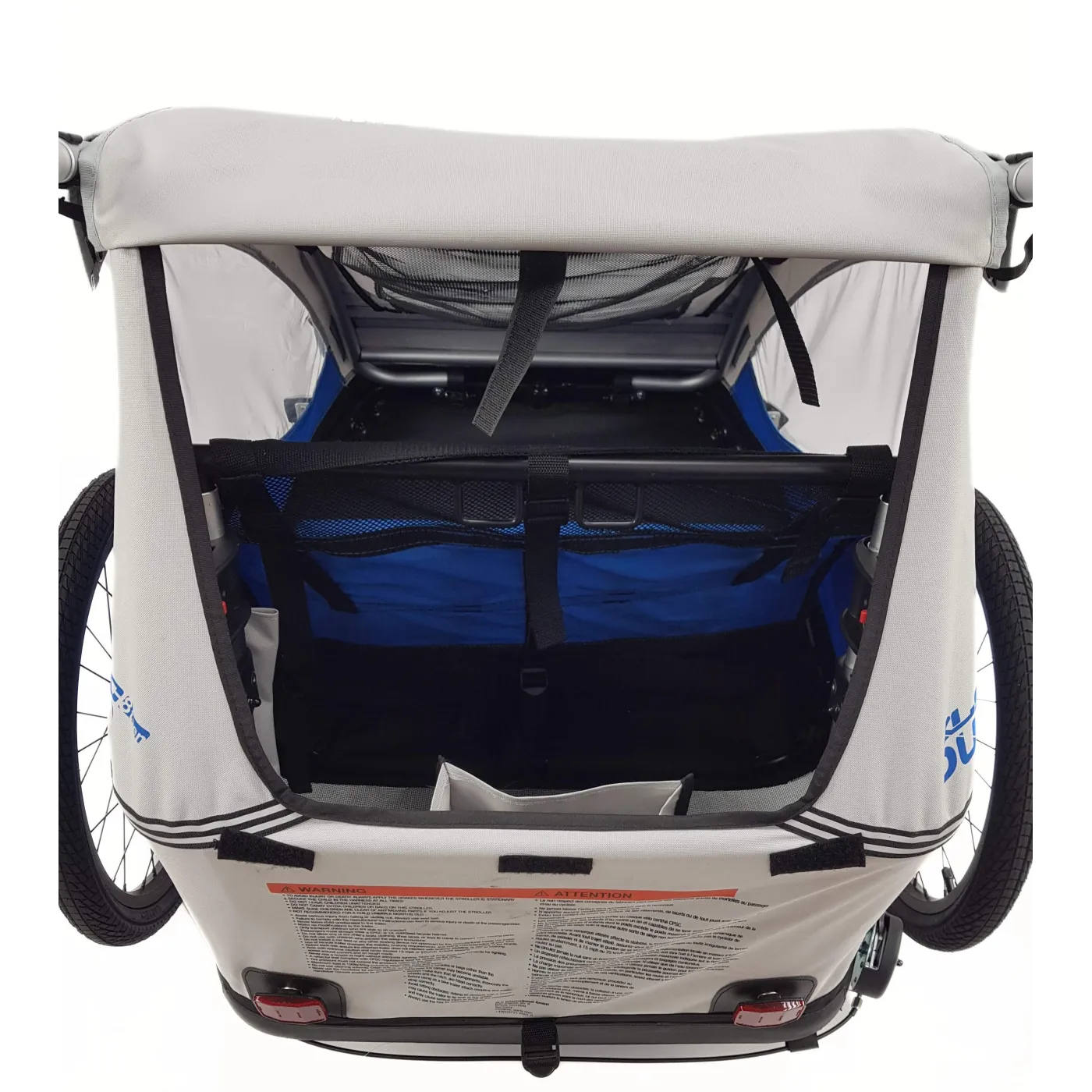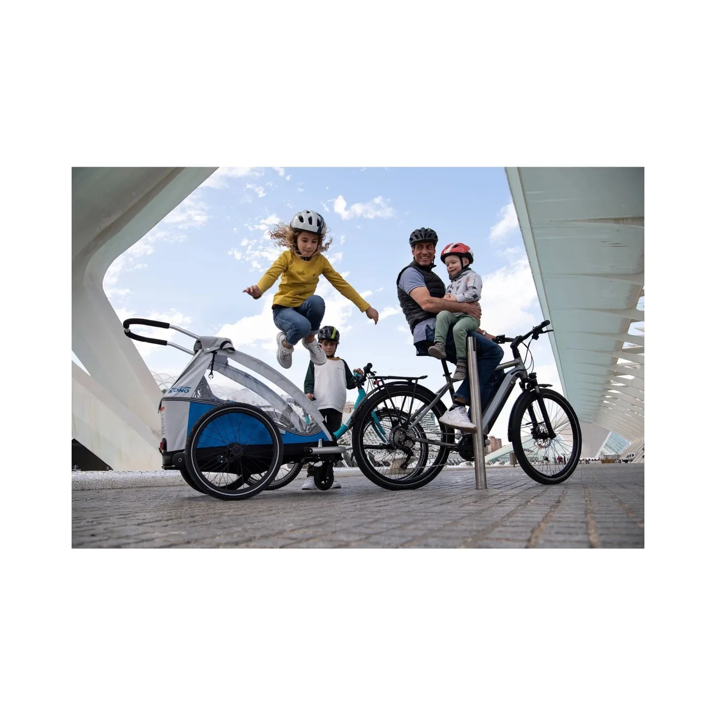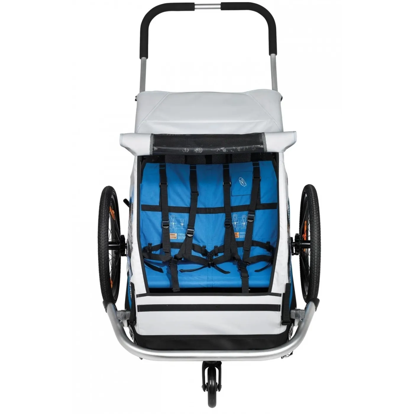 Obszerna przyczepka rowerowa przeznaczona dla dwójki dzieci to idealne rozwiązanie dla aktywnych rodzin. Wyposażona w dyszel rowerowy oraz zaczep, umożliwia wygodne i bezpieczne przewożenie dzieci podczas jazdy rowerem. Po założeniu przedniego koła oraz uchwytu do pchania, przyczepa może pełnić funkcję wózka, a dodatkowe duże koło typu Jogger daje możliwość jeszcze większej różnorodności użycia.