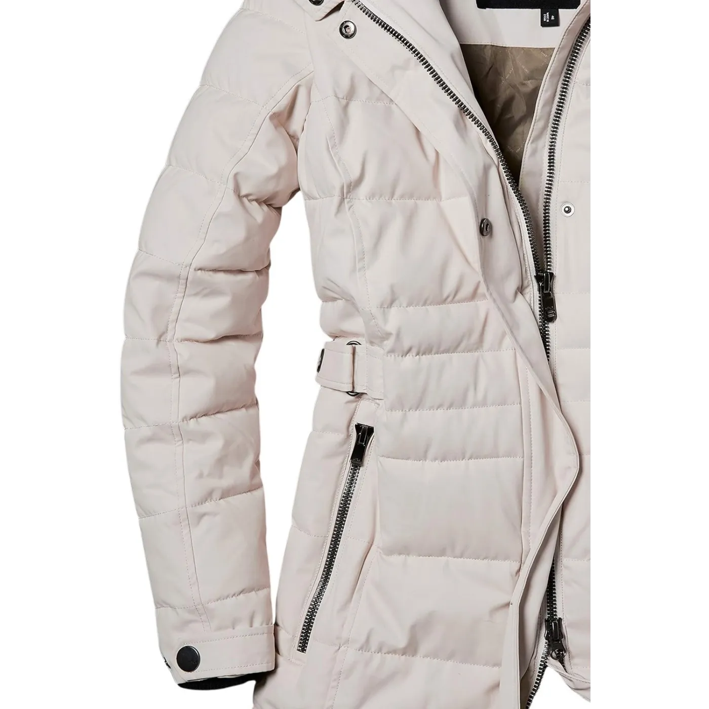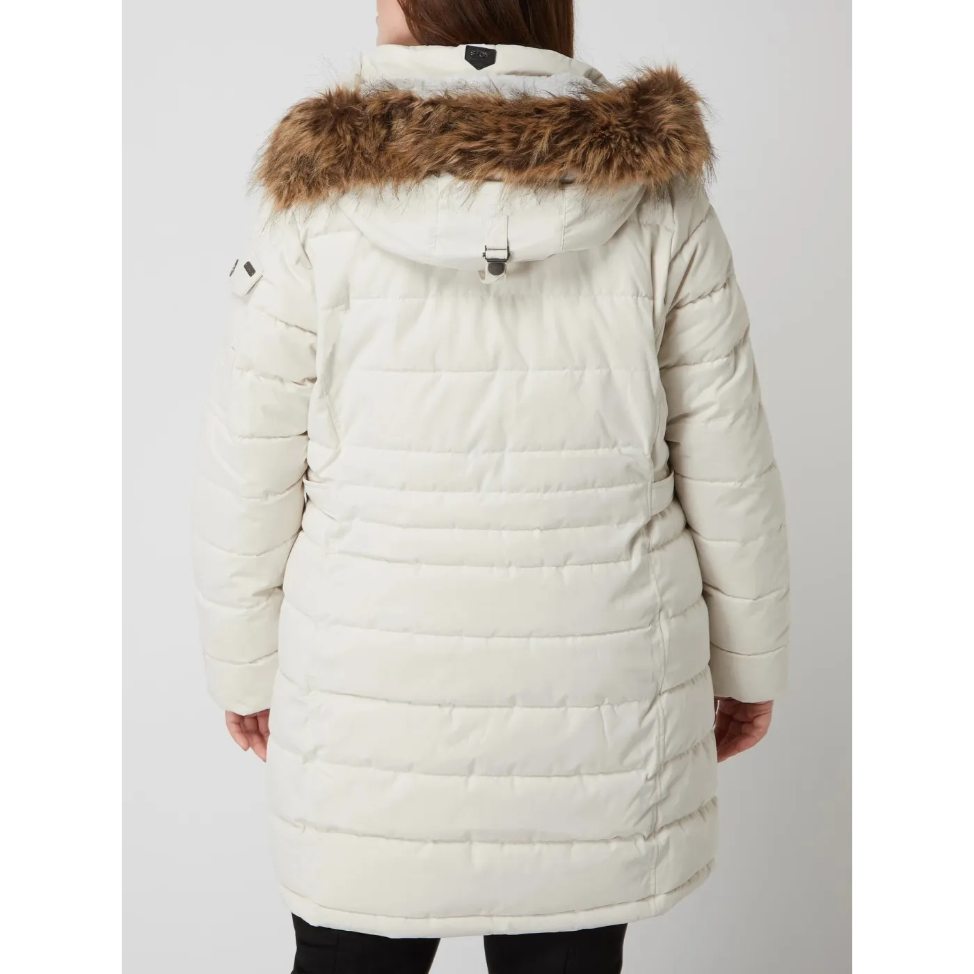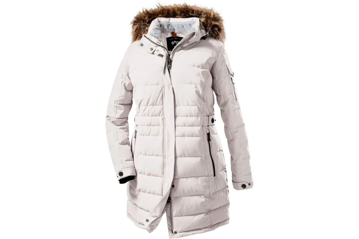 Ma taliowany krój, który podkreśla kobiecą sylwetkę. Odpinany kaptur oraz stójka z podszewką ze sztucznego futra dają dodatkową ochronę przed chłodem. Dodatkowo, sztuczne futro można łatwo odpiąć, co pozwala dostosować parkę do zmieniającej się pogody.