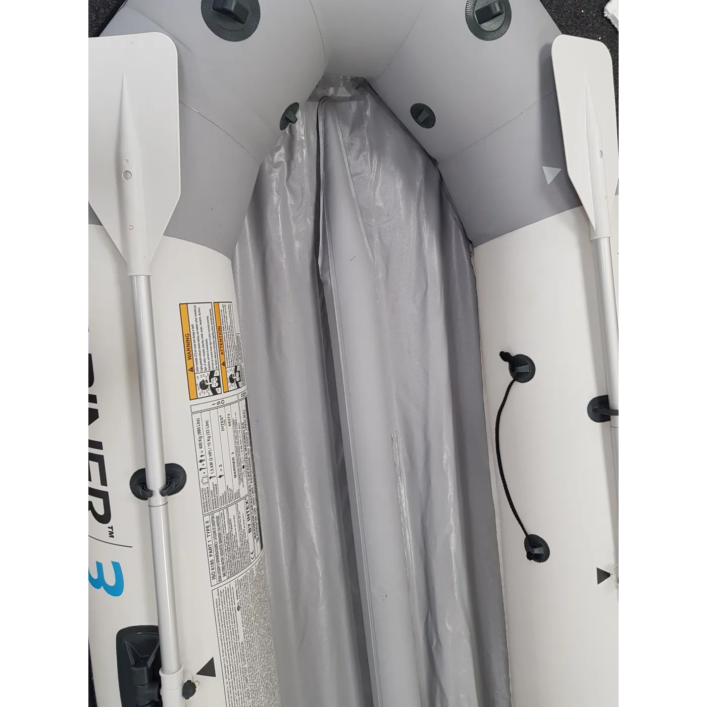 ⚠️ Charakterystyka: Produkty mogą mieć drobne wady wynikające z ekspozycji w sklepie stacjonarnym, drobne zabrudzenia i ryski, brak akcesoriów (pokrowca, siedzisk, linki, uchwytów na wędki), zamienne wiosła, oderwane zamykanie jednego zaworu (nie przeszkadza w użytkowaniu), łatka na materiale.