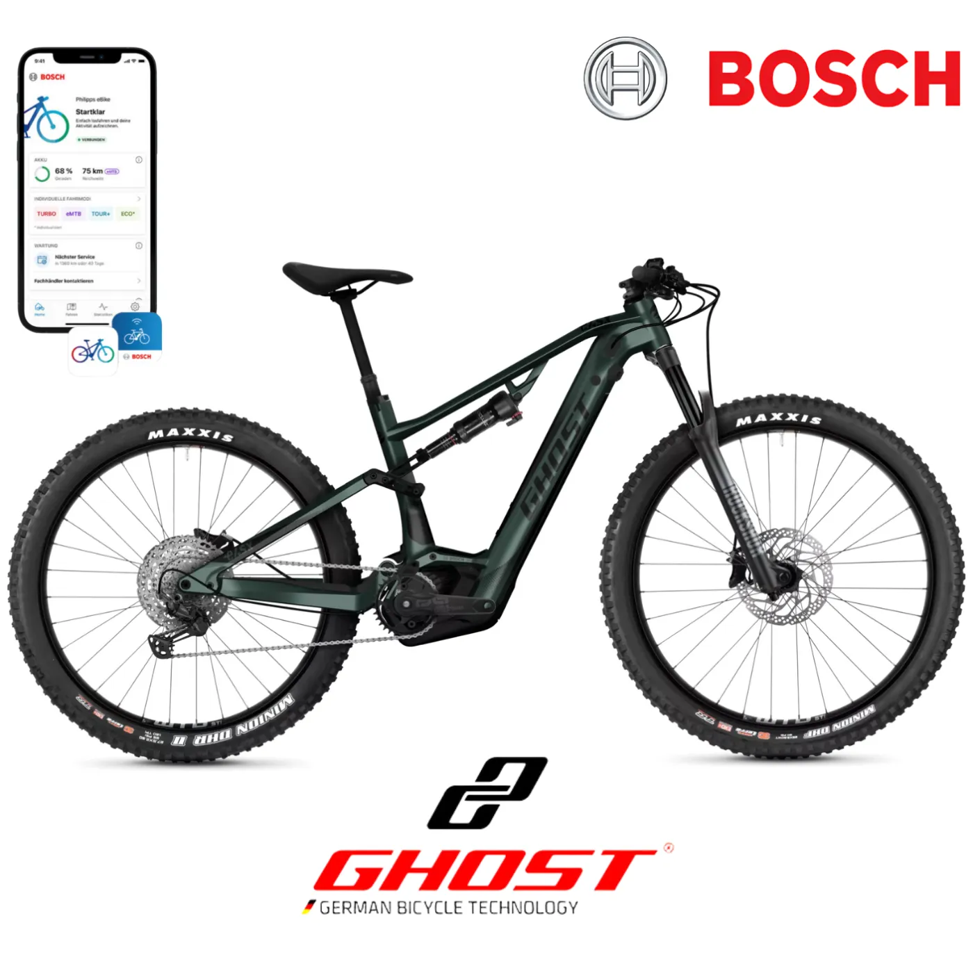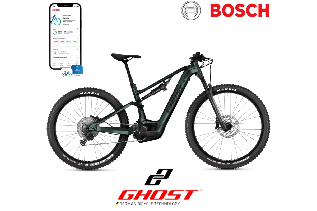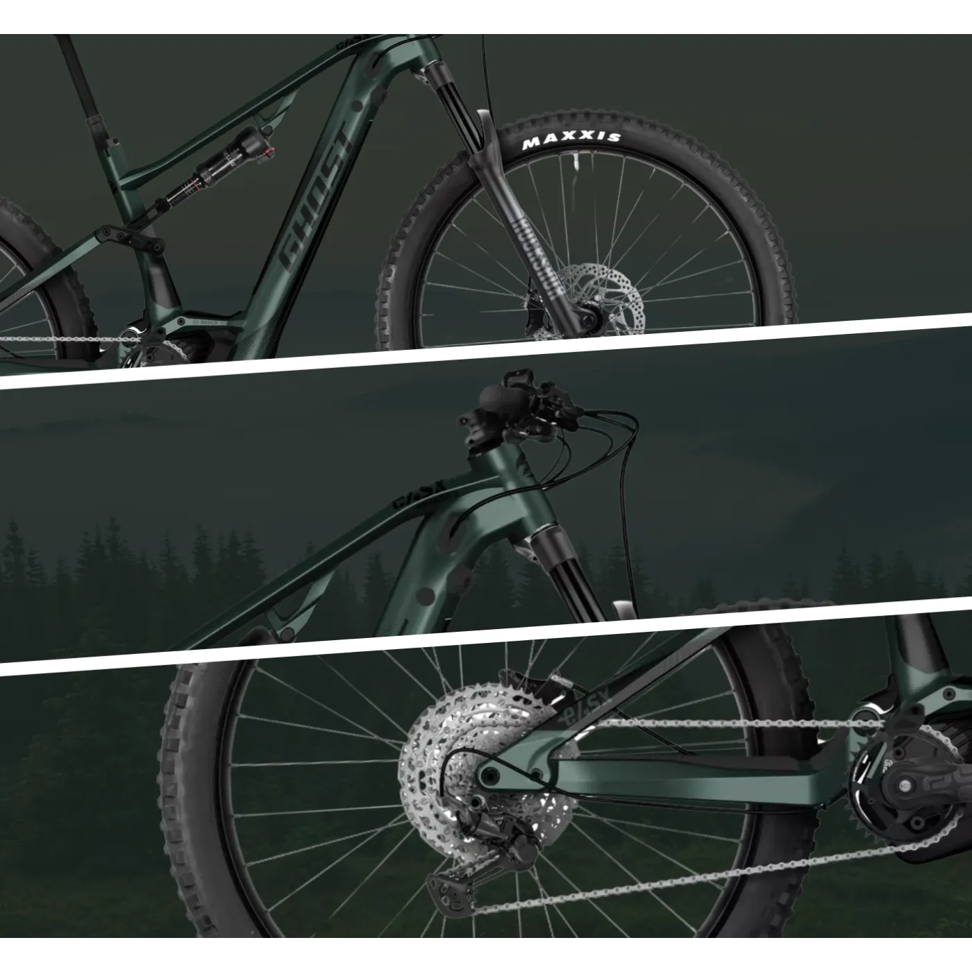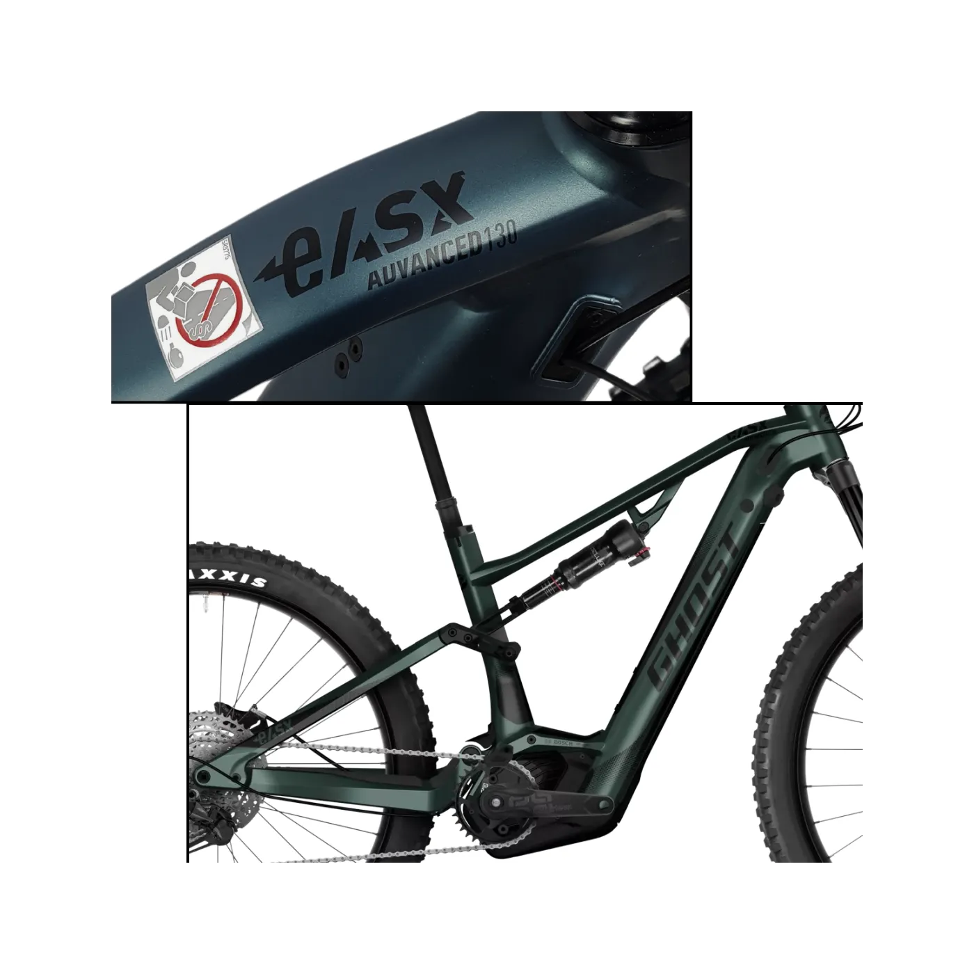🎨 Design Ghost E-ASX 130 Advanced AL to połączenie ciemnozielonego połysku z czarnymi wstawkami, tworząc elegancki i nowoczesny wygląd, który z pewnością przyciągnie uwagę każdego miłośnika elektrycznych rowerów górskich.