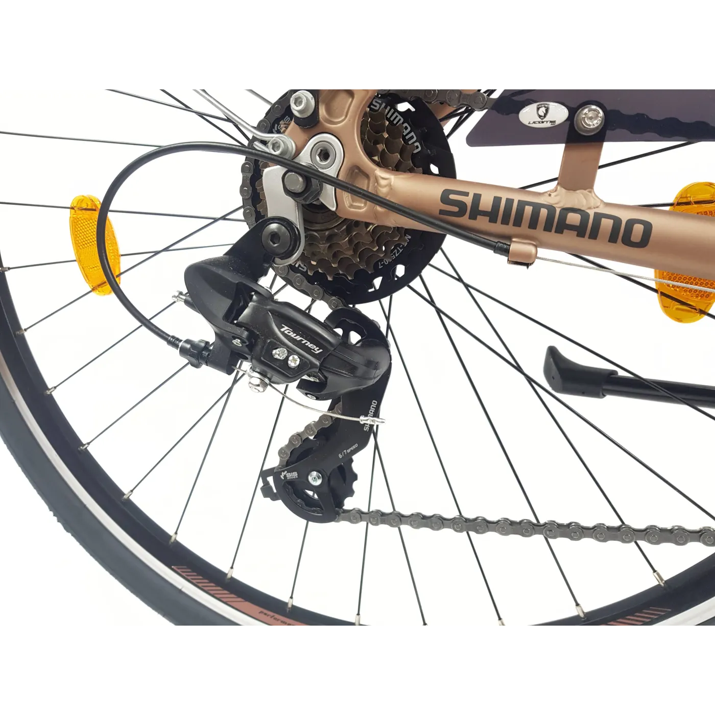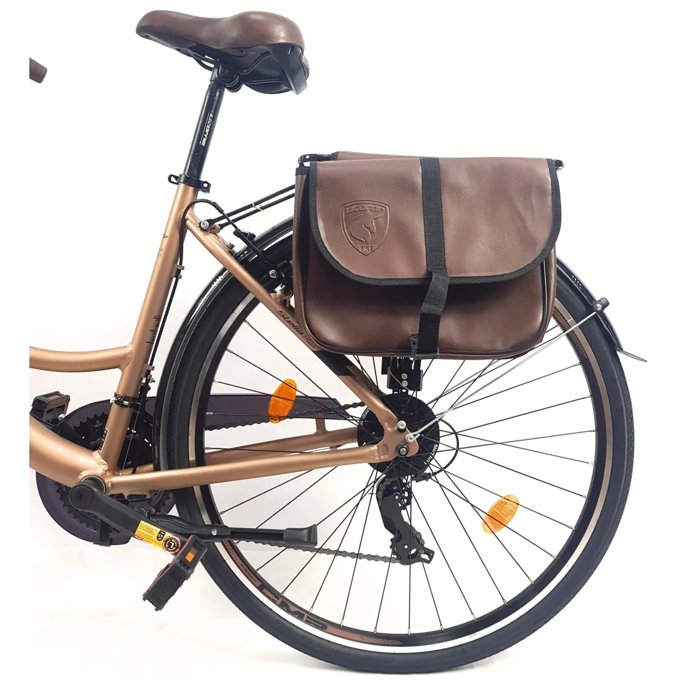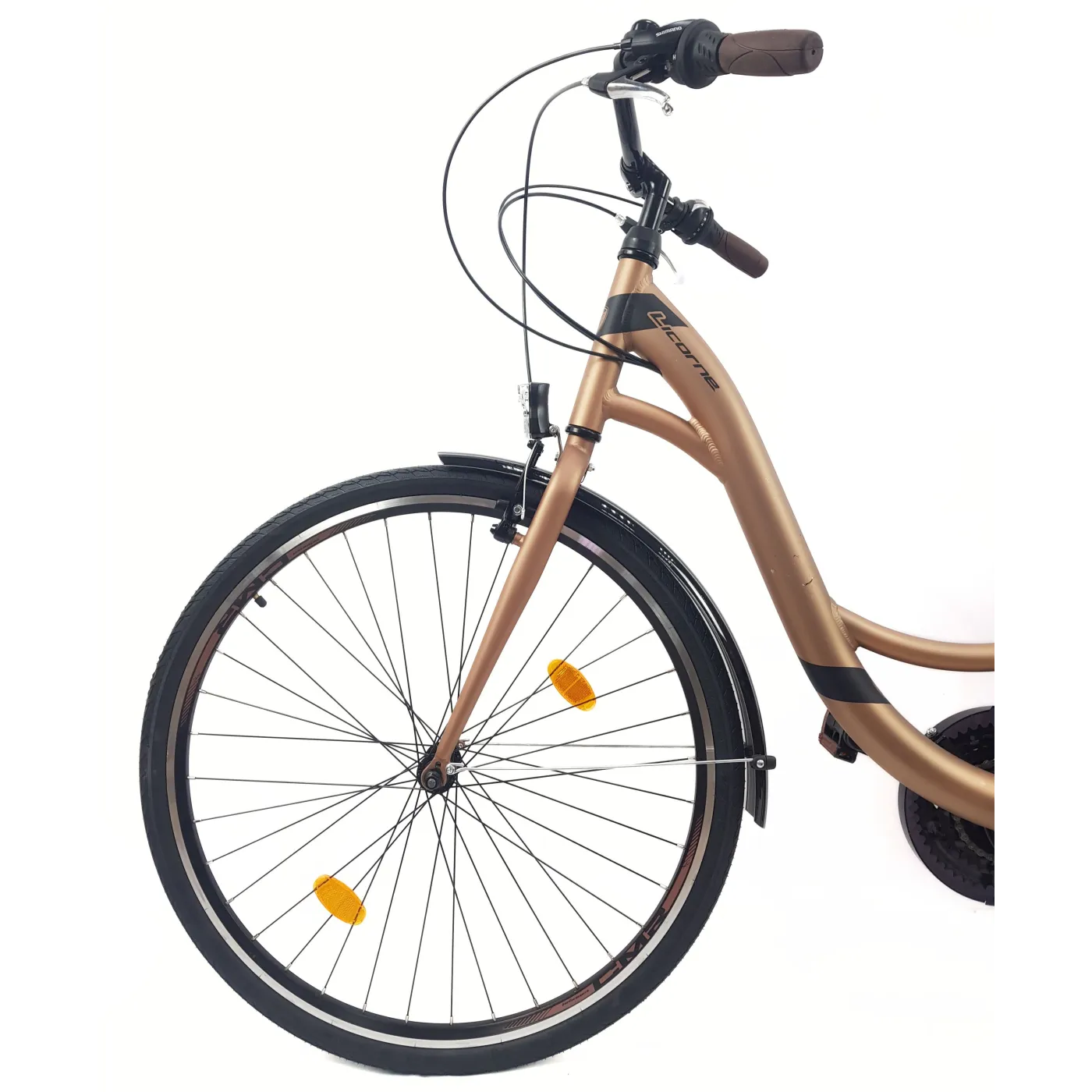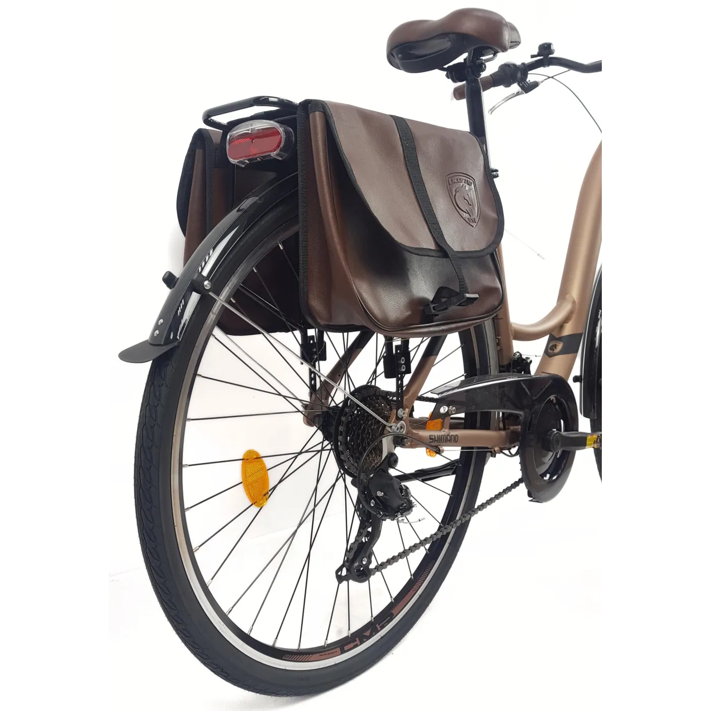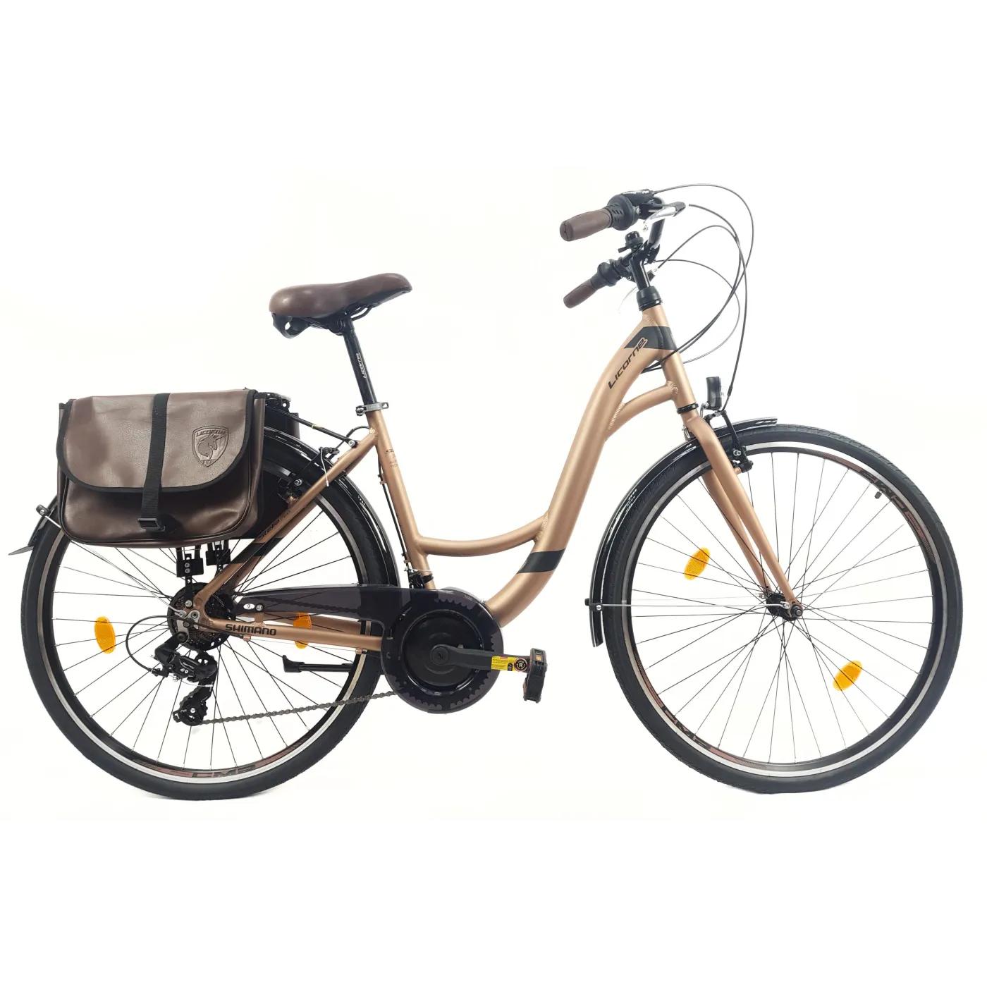 ✨ Rower został wykonany w eleganckim kolorze złotym z czarnymi wstawkami, co nadaje mu nowoczesnego i stylowego wyglądu. Dodatkowo wyposażony jest w praktyczne akcesoria, takie jak błotniki, bagażnik, sakwa, światła, dzwonek oraz odblaski, dzięki którym podróż rowerem będzie jeszcze przyjemniejsza i bezpieczniejsza.