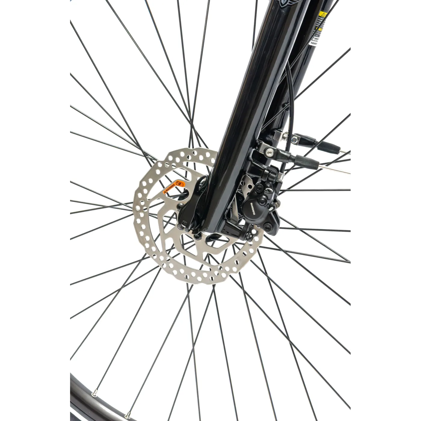 ⚖️Lekka trapezowa rama wykonana z aluminium zapewnia najlepsze właściwości jezdne i całkowicie ukrywa akumulator w dolnej rurze. Tutaj jest optymalnie chroniony przed brudem i kradzieżą. W podwoziu zainstalowano widelec amortyzowany SR Suntour SF14 NEX DS MLO o skoku 63 mm, który można zablokować za pomocą blokady podczas jazdy pod górę i można go dostosować do własnych potrzeb dzięki regulowanemu naprężeniu wstępnemu. Regulowany pod kątem wspornik kierownicy umożliwia precyzyjne dopasowanie pozycji kierownicy do kierowcy. Sama kierownica ma szerokość 610 mm i przesunięcie o 33°, co nie męczy nadgarstków podczas długich podróży.