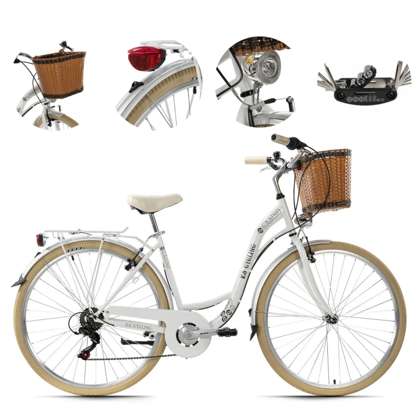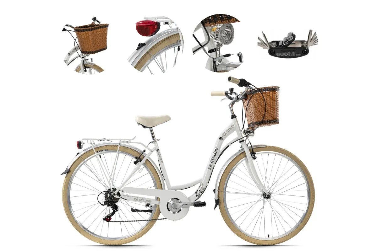 👌 Duże koła o średnicy 28" i opony o szerokości 700x40C zapewniają stabilność, komfort i przyczepność na różnorodnych nawierzchniach. Dodatkowo, rower posiada bagażnik, na którym można przewozić drobne przedmioty, światła oraz odblaski, które zwiększają widoczność rowerzysty po zmroku, dzwonek oraz koszyk, który ułatwia przewożenie rzeczy.