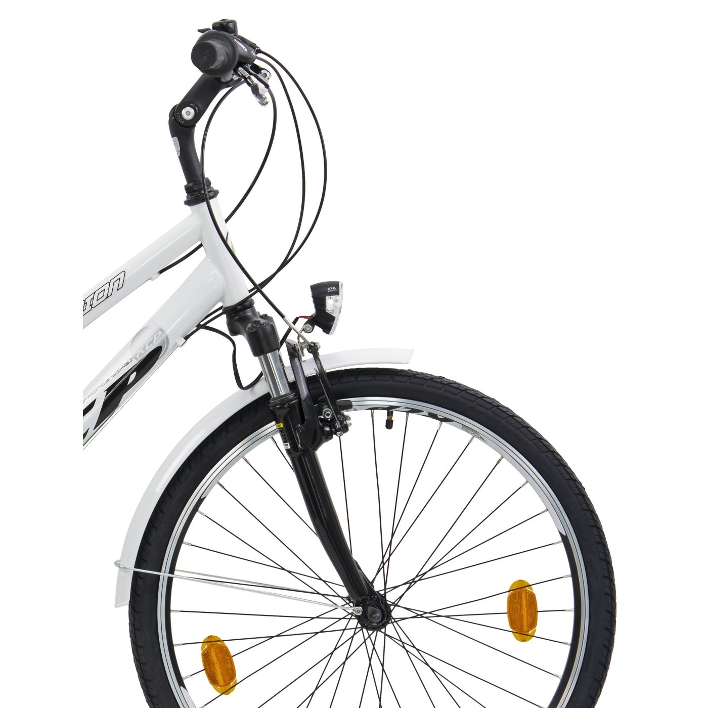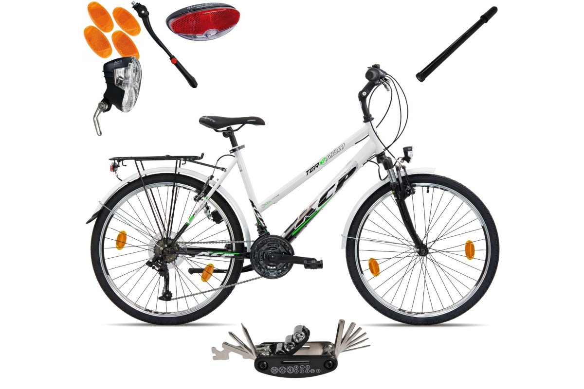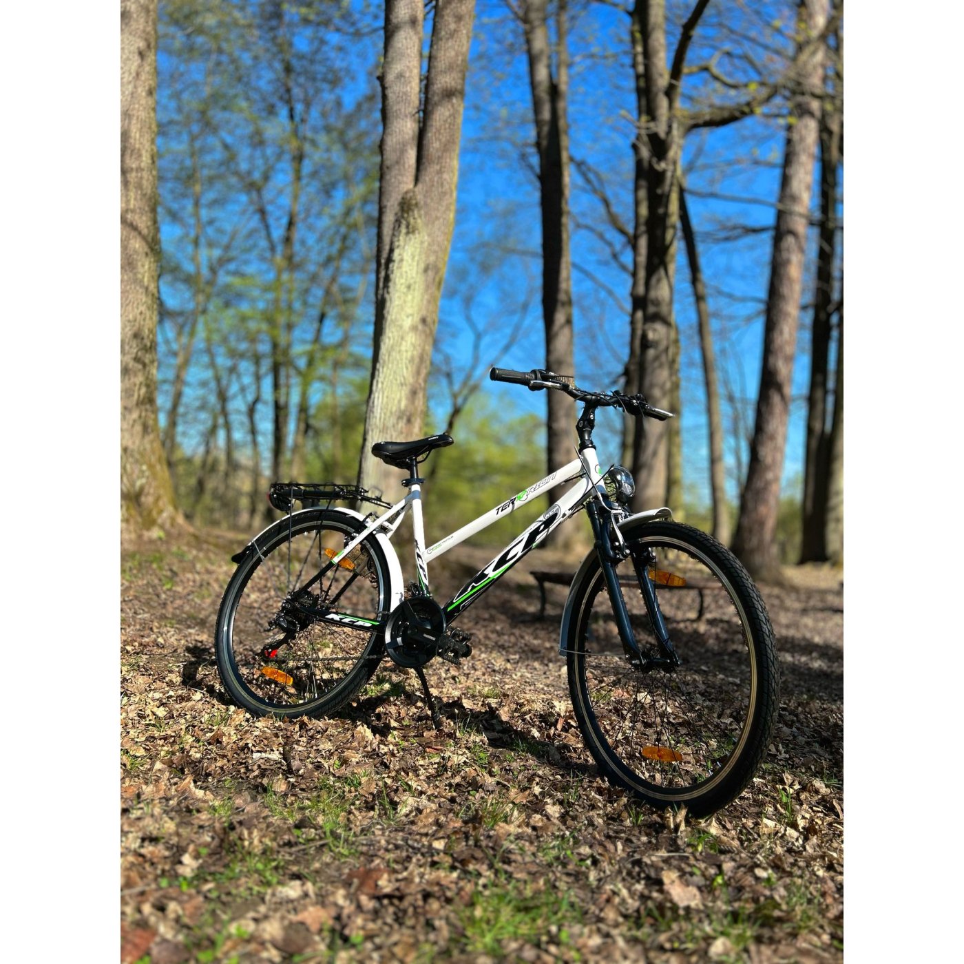 ✅ Bogate wyposażenie w standardzie: błotniki, dzwonek, bagażnik, oświetlenie na dynamo, odblaski, pompka.