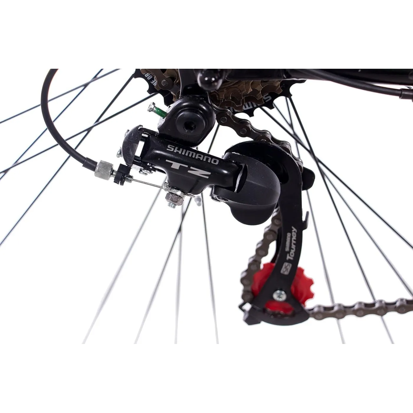 ✔️ Dzięki 21-biegowej przerzutce Shimano, rower umożliwia płynną zmianę przełożeń, co pozwala dostosować opór pedałowania do sytuacji na drodze. Manetka obrotowa Revoshift ułatwia szybką i precyzyjną zmianę biegów bez konieczności zdejmowania dłoni z kierownicy.